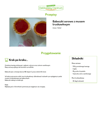 Przepisy Babeczki serowe z musem truskawkwym Autor: Rafał Przygotowanie Krok po kroku... Składniki Masa serowa: Zmielony twaróg zmiksować z jajkami, cukrem oraz cukrem waniliowym. Masę serową wyłożyć do foremek na muffinki. · 700 g zmielonego twarogu Babeczki piec w temperaturze 160 stopni C. przez około 40 minut. · 115 g cukru kryształu · 3 jajka · 1 łyżeczka cukru waniliowego W trakcie pieczenia zrobić mus truskawkowy-zblendować truskawki-po wystygnięciu polać musem truskawkowym po babeczkach. Babeczki nałożyć na talerzyk. Rada: Najlepiej jeść w foremkach, ponieważ po ściągnięciu się rozsypią. Mus truskawkowy: · 30 dag truskawek