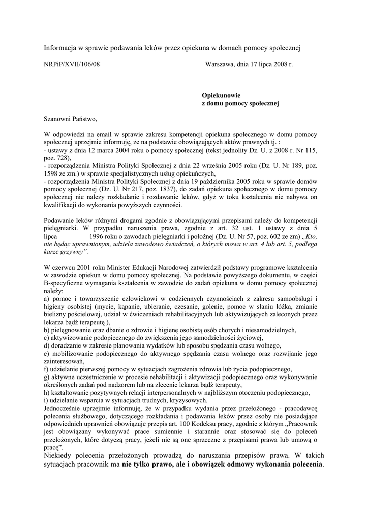 Informacja w sprawie podawania leków przez opiekuna w domach pomocy społecznej NRPiP/XVII/106/08 Warszawa, dnia 17 lipca 2008 r. Opiekunowie z domu pomocy społecznej Szanowni Państwo, W odpowiedzi na email w sprawie zakresu kompetencji opiekuna społecznego w domu pomocy społecznej uprzejmie informuję, Ŝe na podstawie obowiązujących aktów prawnych tj. : - ustawy z dnia 12 marca 2004 roku o pomocy społecznej (tekst jednolity Dz. U. z 2008 r. Nr 115, poz. 728), - rozporządzenia Ministra Polityki Społecznej z dnia 22 września 2005 roku (Dz. U. Nr 189, poz. 1598 ze zm.) w sprawie specjalistycznych usług opiekuńczych, - rozporządzenia Ministra Polityki Społecznej z dnia 19 października 2005 roku w sprawie domów pomocy społecznej (Dz. U. Nr 217, poz. 1837), do zadań opiekuna społecznego w domu pomocy społecznej nie naleŜy rozkładanie i rozdawanie leków, gdyŜ w toku kształcenia nie nabywa on kwalifikacji do wykonania powyŜszych czynności. Podawanie leków róŜnymi drogami zgodnie z obowiązującymi przepisami naleŜy do kompetencji pielęgniarki. W przypadku naruszenia prawa, zgodnie z art. 32 ust. 1 ustawy z dnia 5 lipca 1996 roku o zawodach pielęgniarki i połoŜnej (Dz. U. Nr 57, poz. 602 ze zm) „Kto, nie będąc uprawnionym, udziela zawodowo świadczeń, o których mowa w art. 4 lub art. 5, podlega karze grzywny”. W czerwcu 2001 roku Minister Edukacji Narodowej zatwierdził podstawy programowe kształcenia w zawodzie opiekun w domu pomocy społecznej. Na podstawie powyŜszego dokumentu, w części B-specyficzne wymagania kształcenia w zawodzie do zadań opiekuna w domu pomocy społecznej naleŜy: a) pomoc i towarzyszenie człowiekowi w codziennych czynnościach z zakresu samoobsługi i higieny osobistej (mycie, kąpanie, ubieranie, czesanie, golenie, pomoc w słaniu łóŜka, zmianie bielizny pościelowej, udział w ćwiczeniach rehabilitacyjnych lub aktywizujących zaleconych przez lekarza bądź terapeutę ), b) pielęgnowanie oraz dbanie o zdrowie i higienę osobistą osób chorych i niesamodzielnych, c) aktywizowanie podopiecznego do zwiększenia jego samodzielności Ŝyciowej, d) doradzanie w zakresie planowania wydatków lub sposobu spędzania czasu wolnego, e) mobilizowanie podopiecznego do aktywnego spędzania czasu wolnego oraz rozwijanie jego zainteresowań, f) udzielanie pierwszej pomocy w sytuacjach zagroŜenia zdrowia lub Ŝycia podopiecznego, g) aktywne uczestniczenie w procesie rehabilitacji i aktywizacji podopiecznego oraz wykonywanie określonych zadań pod nadzorem lub na zlecenie lekarza bądź terapeuty, h) kształtowanie pozytywnych relacji interpersonalnych w najbliŜszym otoczeniu podopiecznego, i) udzielanie wsparcia w sytuacjach trudnych, kryzysowych. Jednocześnie uprzejmie informuję, Ŝe w przypadku wydania przez przełoŜonego - pracodawcę polecenia słuŜbowego, dotyczącego rozkładania i podawania leków przez osoby nie posiadające odpowiednich uprawnień obowiązuje przepis art. 100 Kodeksu pracy, zgodnie z którym „Pracownik jest obowiązany wykonywać prace sumiennie i starannie oraz stosować się do poleceń przełoŜonych, które dotyczą pracy, jeŜeli nie są one sprzeczne z przepisami prawa lub umową o pracę”. Niekiedy polecenia przełoŜonych prowadzą do naruszania przepisów prawa. W takich sytuacjach pracownik ma nie tylko prawo, ale i obowiązek odmowy wykonania polecenia. Przepisy nie określają procedury, której zastosowanie pozwoliłoby na weryfikację zgodności z prawem poleceń wydawanych przez przełoŜonych. W przypadku, gdy pracownik ma co do tego wątpliwości, moŜe poprosić swojego bezpośredniego zwierzchnika o wydanie takiej decyzji na piśmie, bądź powtórzenie swoich dyspozycji przy świadkach. JeŜeli mimo to pracownik ma nadal wątpliwości, co do legalności otrzymanego polecenia, powinien sporządzić pisemną notatkę, w której znajdą się motywy, jakimi się kierował przy podejmowaniu decyzji odmawiającej wykonania polecenia wydanego przez przełoŜonego. W przypadku zmiany regulaminu organizacyjnego i zastosowania wobec Państwa nowych warunków pracy, pracodawca ma obowiązek zapoznania pracownika z regulaminem przed rozpoczęciem przez niego pracy. WaŜne jest, aby ustalony przez pracodawcę zakres czynności był zgodny z umową o pracę, a dokładniej z rodzajem umowy o pracę w niej określonym (lub wskazanym w umowie stanowiskiem pracy, na którym został zatrudniony pracownik). Zakres obowiązków pracownika ma stanowić konkretyzację rodzaju pracy lub konkretyzować obowiązki związane z określonym stanowiskiem pracy. W wykazie czynności moŜe znaleźć się postanowienie: inne czynności niŜ wymienione w wykazie, wykonywanie innych zadań słuŜbowych zleconych przez przełoŜonych. NaleŜy zaznaczyć, Ŝe tego rodzaju inne polecenia pracownik ma obowiązek wykonywać, jeŜeli zostały wydane przez właściwego przełoŜonego lub upowaŜnionego pracownika i zgodnie z jego kompetencjami oraz są zgodne z obowiązującym prawem i oczywiście odpowiadają rodzajowi pracy określonemu w umowie o pracę. Pracodawca ma obowiązek informowania pracownika o zmianie w zakresie jego obowiązków i sposobie ich wykonywania takŜe w czasie trwania stosunku pracy. Pracownik potwierdza własnoręcznym podpisem swoje oświadczenie o zapoznaniu się z zakresem czynności oraz zobowiązuje się do jego wykonywania. Odmowa przyjęcia i podpisania zakresu czynności ustalonego zgodnie z umową o pracę moŜe stanowić uzasadnioną przyczynę jej wypowiedzenia, gdyŜ odmowa podpisu jest traktowana jako odmowa wykonania obowiązków. Z wyrazami szacunku Prezes (-)ElŜbieta Buczkowska