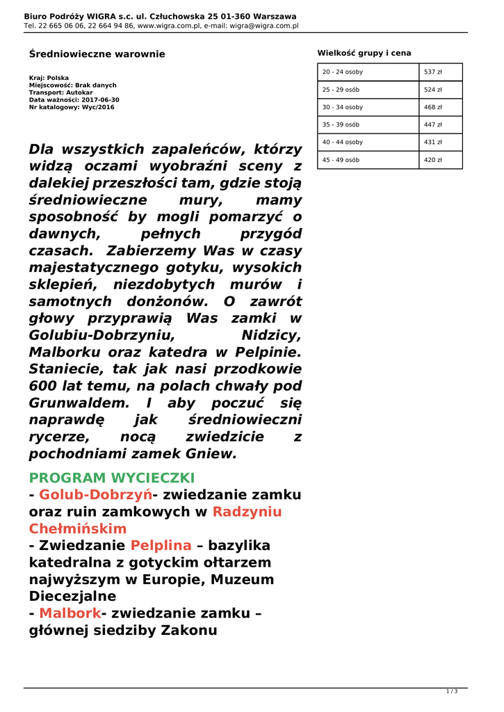 Biuro Podróży WIGRA s.c. ul. Człuchowska 25 01-360 Warszawa Tel. 22 665 06 06, 22 664 94 86, www.wigra.com.pl, e-mail: [email protected] Średniowieczne warownie Kraj: Polska Miejscowość: Brak danych Transport: Autokar Data ważności: 2017-06-30 Nr katalogowy: Wyc/2016 Dla wszystkich zapaleńców, którzy widzą oczami wyobraźni sceny z dalekiej przeszłości tam, gdzie stoją średniowieczne mury, mamy sposobność by mogli pomarzyć o dawnych, pełnych przygód czasach. Zabierzemy Was w czasy majestatycznego gotyku, wysokich sklepień, niezdobytych murów i samotnych donżonów. O zawrót głowy przyprawią Was zamki w Golubiu-Dobrzyniu, Nidzicy, Malborku oraz katedra w Pelpinie. Staniecie, tak jak nasi przodkowie 600 lat temu, na polach chwały pod Grunwaldem. I aby poczuć się naprawdę jak średniowieczni rycerze, nocą zwiedzicie z pochodniami zamek Gniew. Wielkość grupy i cena 20 - 24 osoby 537 zł 25 - 29 osób 524 zł 30 - 34 osoby 468 zł 35 - 39 osób 447 zł 40 - 44 osoby 431 zł 45 - 49 osób 420 zł PROGRAM WYCIECZKI - Golub-Dobrzyń- zwiedzanie zamku oraz ruin zamkowych w Radzyniu Chełmińskim - Zwiedzanie Pelplina – bazylika katedralna z gotyckim ołtarzem najwyższym w Europie, Muzeum Diecezjalne - Malbork- zwiedzanie zamku – głównej siedziby Zakonu 1/3 Biuro Podróży WIGRA s.c. ul. Człuchowska 25 01-360 Warszawa Tel. 22 665 06 06, 22 664 94 86, www.wigra.com.pl, e-mail: [email protected] Krzyżackiego, obecnie wpisanego na listę światowego dziedzictwa UNESCO - Nocne zwiedzanie z pochodniami zamku w Gniewie - Ognisko z kiełbaskami na terenie zamku - Grunwald – pole bitwy z 1410r., na którym wojska Władysława Jagiełły pokonały Krzyżaków - Nidzica – zwiedzanie zamku TRANSPORT Autokar wycieczkowy Zarezerwuj już dziś tel. 22 665 06 06, 22 664 94 86 CENA ZAWIERA - transport uczestników autokarem wycieczkowym/busem w zależności od wielkości grupy - zakwaterowanie w obiekcie noclegowym w pokojach 2,3,4-osobowych z pełnym węzłem sanitarnym - wyżywienie zgodnie z programem (3 obiadokolacje, 3 śniadania, 3 x suchy prowiant) - opiekę pilota podczas całej wycieczki - usługi lokalnych przewodników - organizacja ogniska - 1 opiekun na 15 uczestników gratis 2/3 Biuro Podróży WIGRA s.c. ul. Człuchowska 25 01-360 Warszawa Tel. 22 665 06 06, 22 664 94 86, www.wigra.com.pl, e-mail: [email protected] - ubezpieczenie uczestników od NNW na 10000zł od osoby - opłaty parkingowe i drogowe - podatek VAT CENA NIE ZAWIERA Koszty biletów wstępu do zwiedzanych obiektów płatne dodatkowo 46zł. UWAGI - Przedstawione programy wycieczek są ramowe i można je modyfikować zgodnie z zapotrzebowaniem, - Dostępność biletów w poszczególnych obiektach jest potwierdzana po uzgodnieniu terminu wycieczki, - Ze względu na zmienność cen, bilety wstępów do zwiedzanych obiektów zostały wyszczególnione i są dodatkowo płatne - Na życzenie w cenie wycieczki proponujemy dodatkowo wieczór filmowy, dyskotekę lub karaoke, zajęcia sportowe, warsztaty integracyjne 3/3 Powered by TCPDF (www.tcpdf.org)