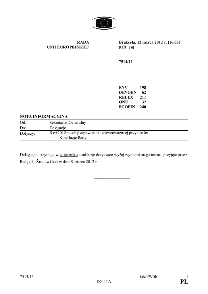 RADA UNII EUROPEJSKIEJ Bruksela, 12 marca 2012 r. (16.03) (OR. en) 7514/12 ENV 198 DEVGEN 62 RELEX 211 ONU 32 ECOFIN 240 NOTA INFORMACYJNA Od: Sekretariat Generalny Do: Delegacje Rio+20: Sposoby zapewnienia zrównoważonej przyszłości Dotyczy: – Konkluzje Rady Delegacje otrzymują w załączniku konkluzje dotyczące wyżej wymienionego tematu przyjęte przez Radę (ds. Środowiska) w dniu 9 marca 2012 r. _________________ 7514/12 DG I 1A krk/PW/tb 1 PL ZAŁĄCZNIK Rio+20 Sposoby zape wnienia zrównoważonej przys złości – Konkluzje Rady – PRZEKONANA o tym, że Konferencja ONZ w sprawie Zrównoważonego Rozwoju (Rio+20) stanowi niepowtarzalną okazję do odnowienia zobowiązań politycznych w zakresie postępów w kompleksowej realizacji programu zrównoważonego rozwoju, również w odniesieniu do wcześniejszych zobowiązań i w oparciu o zasady z Rio, Agendę 21 i plan realizacji z Johannesburga, UWAŻAJĄC, że Konferencja Rio+20 powinna nadać znaczną dynamikę globalnej i sprawiedliwej transformacji ku zielonej gospodarce w kontekście zrównoważonego rozwoju i eliminacji ubóstwa, PODKREŚLAJĄC, że świat stoi w obliczu szeregu różnorakich, wzajemnie powiązanych kryzysów i wyzwań, oraz że w tym szerokim kontekście Konferencja Rio+20 daje niepowtarzalną okazję, by zweryfikować dotychczasowe postrzeganie zagadnień wzrostu gospodarczego i konsumpcji, sprzyjania włączeniu społecznemu oraz eksploatacji naszych ograniczonych zasobów, zabezpieczając w ten sposób potrzeby przyszłych pokoleń, PODKREŚLAJĄC, że kluczową odpowiedzią na owe kryzysy i wyzwania jest poprawa efektywności wykorzystania zasobów, stanowiąca jeden z zasadniczych elementów transformacji ku sprzyjającej włączeniu społecznemu, zielonej gospodarce w obrębie istotnie ulepszonych instytucjonalnych ram zrównoważonego rozwoju, prowadzącej do poprawy ochrony środowiska, dostępnej dla wszystkich zrównoważonej energii oraz do gospodarki niskoemisyjnej, większej i trwałej wydajności produkcji, zielonych miejsc pracy i godnego zatrudnienia oraz eliminacji ubóstwa z korzyścią dla zdrowia ludzi i dobrostanu społecznego, dla środowiska i rozwoju gospodarczego; PODKREŚLAJĄC, że zrównoważonego rozwoju nie da się osiągnąć bez poszanowania i wspierania demokracji, praw człowieka, praworządności, dobrych rządów, edukacji, roli młodzieży i równości płci; PRZYJMUJĄC Z ZADOWOLENIEM przedstawienie pierwszego projektu dokumentu końcowego pt. „Przyszłość, jakiej chcemy”, dającego dobre podstawy dla dalszych negocjacji, a także PODKREŚLAJĄC nasze zdeterminowanie, by wypracować ukierunkowaną i zorientowaną na przyszłość deklarację polityczną Konferencji, która powinna nakreślać wspólną wizję zmian, jak również cele i działania na szczeblu międzynarodowym, o uzgodnionych ramach czasowych realizacji, 7514/12 ZAŁĄCZNIK DG I 1A krk/PW/tb 2 PL PRZYWOŁUJĄC konkluzje Rady z dnia 10 października 2011 r. w sprawie Konferencji Rio+20 1 , konkluzje Rady z dnia 15 grudnia 2011 r. w sprawie planu działania na rzecz zasobooszczędnej Europy2 , wspólny wkład UE i jej państw członkowskich przekazany przed 1 listopada 2011 r. Departamentowi ONZ do Spraw Gospodarczych i Społecznych3 oraz konkluzje Rady Europejskiej z 1– 2 marca 2012 r4 . PODKREŚLAJĄC nadrzedne wyzwanie, jakim jest zmiana klimatu, oraz PRZYPOMINAJĄC konkluzje Rady z dnia 9 marca 2012 r. w sprawie działań w związku z 17. sesją konferencji stron (COP 17) Ramowej konwencji Narodów Zjednoczonych w sprawie zmian klimatu (UNFCCC) i 7. sesją posiedzenia stron protokołu z Kioto (CMP 7) (Durban, Republika Południowej Afryki, 28 listopada – 9 grudnia 2011 r.) 5 , RADA UNII EUROPEJSKIEJ 1. POTWIERDZA, że Unia Europejska i jej państwa członkowskie są zdecydowane odgrywać aktywną i konstruktywną rolę w trwających negocjacjach w celu wniesienia wkładu w osiągnięcie ambitnych rezultatów Konferencji, w tym konkretne i terminowe działania następcze, oraz W DALSZYM CIĄGU będzie ściśle zaangażowana w rozwój negocjacji w okresie poprzedzającym Konferencję Rio+20 w czerwcu 2012 r. oraz stosownie do okoliczności będzie kształtować swe stanowisko w tym kontekście; 2. POTWIERDZA swe poparcie dla otwartego, sprzyjającego włączeniu procesu umożliwiającego pełny i aktywny udział wszystkich odnośnych zainteresowanych stron podczas negocjacji oraz samej Konferencji, PODKREŚLA znaczenie silnego zaangażowania samorządu lokalnego, sektora prywatnego, związków zawodowych oraz społeczeństwa obywatelskiego w działaniach podejmowanych w związku z Konferencją Rio+20 i w realizacji powziętych zobowiązań; 1 2 3 4 5 Dok. 15388/11. Dok. 18346/11. Dok. 15841/11. Dok. EUCO 4/12. Dok. 7517/12. 7514/12 ZAŁĄCZNIK DG I 1A krk/PW/tb 3 PL 3. MA ŚWIADOMOŚĆ, że dynamika rozwoju ludności jest silnie i nierozdzielnie powiązana z wysiłkami podejmowanymi przez nas na rzecz zrównoważonego rozwoju, ochrony środowiska oraz dalszej poprawy dobrostanu człowieka, ograniczania ubóstwa i głodu, propagowania godnego zatrudnienia oraz zapewnienia żywności, wody i bezpieczeństwa energetycznego, co z kolei wymaga większej skuteczności gospodarki; PODKREŚLA, że z problematyką dynamiki rozwoju ludności należy zmierzyć się w oparciu o politykę zasadzającą się na prawach człowieka; 4. PODKREŚLA znaczenie równości płci oraz zasadniczą rolę, jaką w osiągnięciu celu zrównoważonego rozwoju ma równy udział kobiet w gospodarce i polityce oraz PODKREŚLA, że edukacja jest zasadniczym czynnikiem rozwoju umiejętności i kompetencji; 5. PRZYZNAJE, że zarysowują się niepokojące tendencje w dziedzinie katastrof naturalnych i antropogenicznych, o skutkach szkodliwych dla zrównoważonego rozwoju oraz PODKREŚLA potrzebę zintegrowanego podejścia na wszystkich poziomach zarządzania kryzysowego; 6. Z ZADOWOLENIEM PRZYJMUJE sprawozdanie panelu wyso