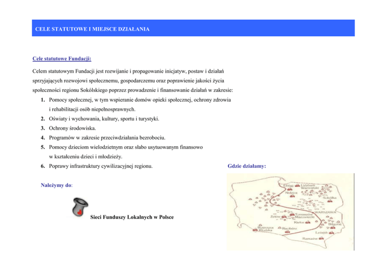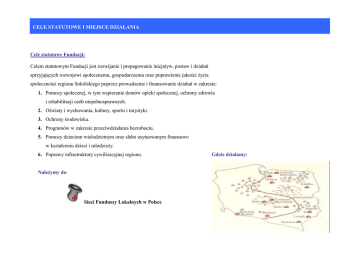 CELE STATUTOWE I MIEJSCE DZIAŁANIA Cele statutowe Fundacji: Celem statutowym Fundacji jest rozwijanie i propagowanie inicjatyw, postaw i działań sprzyjających rozwojowi społecznemu, gospodarczemu oraz poprawienie jakości Ŝycia społeczności regionu Sokólskiego poprzez prowadzenie i finansowanie działań w zakresie: 1. Pomocy społecznej, w tym wspieranie domów opieki społecznej, ochrony zdrowia i rehabilitacji osób niepełnosprawnych. 2. Oświaty i wychowania, kultury, sportu i turystyki. 3. Ochrony środowiska. 4. Programów w zakresie przeciwdziałania bezrobociu. 5. Pomocy dzieciom wielodzietnym oraz słabo usytuowanym finansowo w kształceniu dzieci i młodzieŜy. 6. Poprawy infrastruktury cywilizacyjnej regionu. NaleŜymy do: Sieci Funduszy Lokalnych w Polsce Gdzie działamy: STRUKTURA SOKÓLSKIEGO FUNDUSZU LOKALNEGO RADA FUNDACJI 9 osób ZARZĄD FUNDACJI 3 osoby PROGRAMY 1 2 3 4 5 6 7 8 9 1. POMOC RODZINOM Z PROBLEMEM ALKOHOLOWYM 2. PROWADZENIE ŚWIETLICY SOCJOTERAPEUTYCZNEJ „KONICZYNKA” 3. ZATRZYMAĆ PRZEMOC 4. PROGRAM STYPENDIALNY PRYMUS 5. STYPENDIA POMOSTOWE 6. PROFILAKTYKA – WYPOCZYNEK 7. PRACOWNIA UMIEJĘTNOŚCI 8. DZIAŁAJ LOKALNIE 9. KONKURS O TYTUŁ DARCZYŃCA ROKU Zdjęcie,Zebranie Rady Fundacji Zebranie Rady Fundacji 29.III.2005 r. STRUKTURA SOKÓLSKIEGO FUNDUSZU LOKALNEGO RADA FUNDACJI: Czesław Sańko – Przewodniczący, Z-ca Burmistrza Sokółki Mirosław Tałałaj – Z-ca Przewodniczącego, Miejskie Przedsiębiorstwo Energetyki Cieplnej Sokółka Lucyna Dowgiert – Sekretarz, Szkoła Podstawowa w Lipinie Witold Budrowski – Przewodniczący Komisji Grantowej i Stypendialnej, Radny Rady Miejskiej, Bank Spółdzielczy w Sokółce Krystyna Babynko – Przewodnicząca Komisji Finansowej, PSS „Społem” Sokółka Jan Firs – Zespół Szkół w Sokółce Mieczysław Baszko – Przewodniczący Komisji Finansowej, Ośrodek Sportu i Rekreacji w Sokółce, Radny Rady Powiatu Henryk Cudnik – Polski Związek Emerytów, Rencistów i Inwalidów, Zarząd Rejonowy w Sokółce Jan Ancypo – Izba Regionalna w Janowszczyźnie, Radny Rady Miejskiej Czesław Sańko Witold Budrowski Mieczysław Baszko Mirosław Tałałaj Krystyna Babynko Henryk Cudnik Lucyna Dowgiert Jan Firs Jan Ancypo STRUKTURA SOKÓLSKIEGO FUNDUSZU LOKALNEGO ZARZĄD: Komisja Grantowa Programów „Pracownia Umiejętności” i „Godzina po Lekcjach: Maria Talarczyk Barbara Chmielecka Alina Struczewska Prezes Zarządu Wice Prezes Zarządu Sekretarz Zarządu - Witold Budrowski – Bank Spółdzielczy Sokółka - Jan Firs – Zespół Szkół w Sokółce - Lucyna Dowgiert – Szkoła Podstawowa w Lipinie - Henryk Cudnik – Polski Związek Emerytów, Rencistów i Inwalidów - Monika Krawiel – Fundacja „Sokólski Fundusz Lokalny” - Wojciech Obiała – PCPR Sokółka Komisja Stypendialna Programu Stypendialnego „Prymus” Komisja Grantowa Programu "Działaj Lokalnie” - Witold Budrowski - Witold Budrowski - Jan Firs - Jan Firs - Lucyna Dowgiert - Lucyna Dowgiert - Henryk Cudnik - Henryk Cudnik - Joanna Boćkowska – Urząd Miejski Dąbrowa Biał. - Monika Krawiel - Radosław Onoszko – Urząd Miejski Sokółka - Bogumiła Anna Borecka – Sekretarz Gminy Szudziałowo - Stanisław Kopciewski - Radny Rady Gminy Korycin JAK DZIAŁAMY Fundacja „Sokólski Fundusz Lokalny” jest jedną z 12-tu organizacji filantropijnych tego typu w Polsce. Inicjatorem powołania Funduszy Lokalnych w Polsce w latach 1998 – 2000 była Akademia Rozwoju Filantropii w Polsce. „Sokólski Fundusz Lokalny”, został zarejestrowany 28 marca 2000 r. Fundacja gromadzi fundusze, z których dochody wykorzystywane są do spełniania potrzeb charytatywnych społeczności - od przyznawania stypendiów dla uzdolnionych i niezamoŜnych uczniów oraz studentów, poprzez wspieranie działań innych organizacji społecznych. Fundacja współpracuje z lokalnymi bankami: Kredyt Bank S.A. I Oddział Białystok Filia Nr 1 w Sokółce Bank PKO BP w Sokółce Regionalny Oddział Korporacyjny w Białymstoku Kredyt Bank I Oddział w Białymstoku był Darczyńcą czerwca 2001 r. Dyrektor Filii Kredyt Bank w Sokółce – Sławomir Dudziński, jest członkiem Komisji Finansowej SFL. Regionalny Oddział Korporacyjny PKO BP S.A. w Białymstoku został Darczyńcą Roku 2005 Miasta i Gminy Sokółka. Nie przez to, kim jest, „Człowiek jestto,wielki nie przez to, co ma, Lecz przez Nie przez kimzjest, Czym sięto, dzieli innymi” Lecz przez to, Jan Paweł II Czym się dzieli z innymi” 1920 - 2005 Jan Paweł II 1920 - 2005 Sokólski Fundusz Lokalny w ciągu minionych 6-ciu lat przeprowadził wiele inicjatyw i programów: - w programie Fundusz Stypendialny przyznano 306 stypendiów na sumę 317 00 zł. - w programie grantowym „Godzina po lekcjach” przyznano 21 grantów na sumę 21 000 zł. - w programie „Pracownia Umiejętności” przyznano 43 granty na sumę 64 000 zł. - w programie „Działaj Lokalnie” przyznano 21 grantów na sumę 94 670 zł. POMOC RODZINOM Z PROBLEMEM ALKOHOLOWYM POMOC RODZINIE Z PROBLEMEM ALKOHOLOWYM I PRZECIWDZIAŁANIE NARKOMANII WŚRÓD MŁODZIEśY Kompleksową pomocą rodzinom z uzaleŜnieniem w mieście i gminie Sokółka od 1995 r. zajmuje się wyłącznie Fundacja „Sokólski Fundusz Lokalny”, będąca kontynuatorką działań powstałej w 1992 r. Fundacji „Fundusz Pomocy Społecznej”. Program pomocy rodzinom alkoholowym jest prowadzony jako zadanie zlecone przez Urząd Miejski w Sokółce w oparciu o środki z gminnego Programu Rozwiązywania Problemów Alkoholowych i środki własne Fundacji. W roku 2005 na realizację programów Fundacja otrzymała z róŜnych źródeł środki w wysokości 319 000 zł., w tym 73 000 zł. pochodziły z Urzędu Gminy Sokółka, co stanowi 23% środków. PRACA Z DOROSŁYMI OSOBAMI UZALEśNIONYMI I WSPÓŁUZALEśNIONYMI OD ALKOHOLU W OŚRODKU USŁUG SOCJALNYCH I TERAPEUTYCZNYCH Prowadzenie punktu konsultacyjnego dla ofiar uzaleŜnionych i współuzal