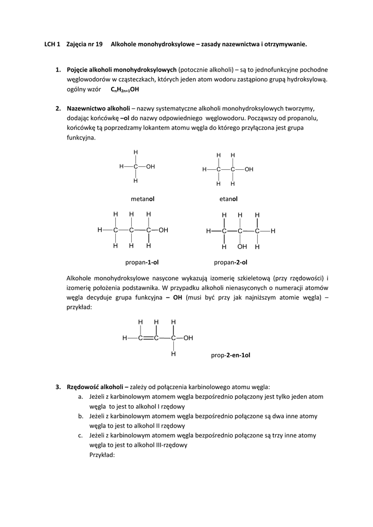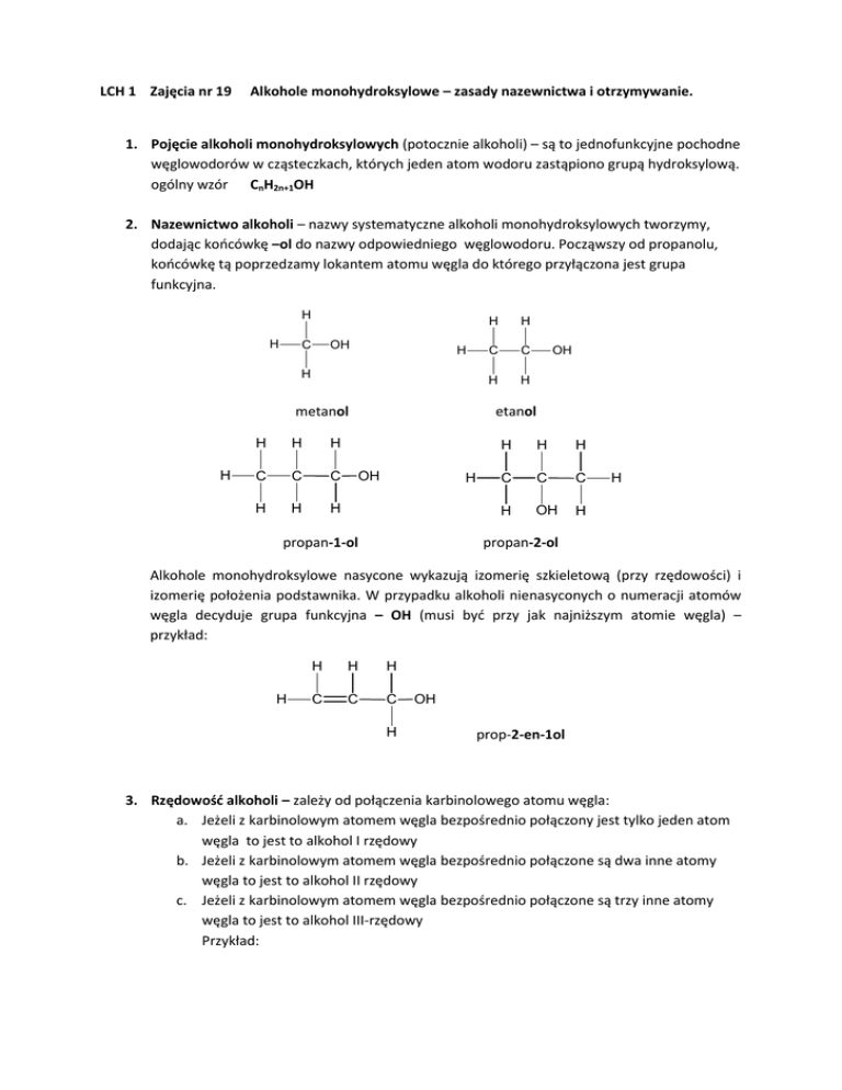 LCH 1 Zajęcia nr 19 Alkohole monohydroksylowe – zasady