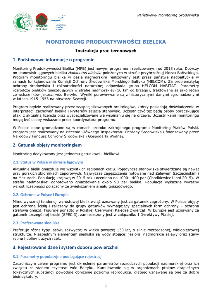 Państwowy Monitoring Środowiska MONITORING PRODUKTYWNOŚCI BIELIKA Instrukcja prac terenowych 1. Podstawowe informacje o programie Monitoring Produktywności Bielika (MPB) jest nowym programem realizowanym od 2015 roku. Dotyczy on stanowisk lęgowych bielika Haliaeetus albicilla położonych w strefie przybrzeżnej Morza Bałtyckiego. Program monitoringu bielika w pasie nadmorskim realizowany jest przez państwa nadbałtyckie w ramach funkcjonowania Komisji Ochrony Środowiska Morskiego Bałtyku (HELCOM). Za problematykę ochrony środowiska i różnorodności naturalnej odpowiada grupa HELCOM HABITAT. Parametry rozrodcze bielików gniazdujących w strefie nadmorskiej (10 km od brzegu), traktowane są jako jeden ze wskaźników jakości wód Bałtyku. Wyniki porównywane są z historycznymi danymi zgromadzonymi w latach 1915-1953 na obszarze Szwecji. Program będzie realizowany przez wyspecjalizowanych ornitologów, którzy posiadają doświadczenie w interpretacji zachowań bielika i kryteriów zajęcia stanowisk. Uczestniczyć też będą osoby obrączkujące ptaki z aktualną licencją oraz wyspecjalizowane we wspinaniu się na drzewa. Uczestnikami monitoringu mogą być osoby wskazane przez koordynatora programu. W Polsce dane gromadzone są w ramach szeroko zakrojonego programu Monitoring Ptaków Polski. Program jest realizowany na zlecenie Głównego Inspektoratu Ochrony Środowiska i finansowany przez Narodowy Fundusz Ochrony Środowiska i Gospodarki Wodnej. 2. Gatunek objęty monitoringiem Monitoring dedykowany jest jednemu gatunkowi - bielikowi. 2.1. Status w Polsce w okresie lęgowym Aktualnie bielik gniazduje we wszystkich regionach kraju. Pojedyncze stanowiska stwierdzane są nawet przy górskich zbiornikach zaporowych. Najwyższe zagęszczenia notowane nad Zalewem Szczecińskim i na Mazurach. Populację krajową w 2015 roku oceniono na 1000-1400 par (Chodkiewicz i inni 2015). W strefie nadmorskiej odnotowano gniazdowanie około 90 par bielika. Populacja wykazuje wyraźny wzrost liczebności połączony ze zwiększaniem areału gniazdowego. 2.2. Ochrona w Polsce i Europie Mimo wyraźnej tendencji wzrostowej bielik wciąż uznawany jest za gatunek zagrożony. W Polsce objęty jest ochroną ścisłą i zaliczany do grupy gatunków wymagający specjalnych form ochrony – ochrona strefowa gniazd. Figuruje ponadto w Polskiej Czerwonej Księdze Zwierząt. W Europie jest uznawany za gatunek szczególnej troski (SPEC 3), zamieszczony jest w załączniku I Dyrektywy Ptasiej. 2.3. Preferowane siedliska Preferuje różne typy lasów, zazwyczaj w wieku powyżej 130 lat, o silnie rozrzedzonej, wielopiętrowej strukturze. Niezbędnym elementem siedliska są wody stojące: jeziora, nadmorskie zalewy oraz stawy rybne i doliny dużych rzek. 3. Rejestrowane dane i system doboru powierzchni 3.1. Parametry populacyjne podlegające rejestracji Zasadniczym celem programu jest określenie parametrów rozrodczych populacji nadmorskiej oraz ich związku ze stanem czystości wód Bałtyku. Kumulowanie się w organizmach ptaków drapieżnych toksycznych substancji powoduje obniżenie poziomu reprodukcji, dlatego uznawane są one za dobre bioindykatory. 1 Do oceny parametrów rozrodu populacji musimy znać kilka parametrów charakteryzujących populację lęgową: - liczebność populacji, w tym liczbę par przystępujących do rozrodu - liczbę par z rozpoznanym końcowym wynikiem lęgu - liczbę lęgów zakończonych sukcesem - liczbę odchowanych młodych W oparciu o ten zasób wiedzy możemy wyliczyć wskaźniki reprodukcyjne: Sukces gniazdowy. Jest to współczynnik opisujący procentowo efektywność lęgów w danym sezonie. Określa procent par, które szczęśliwie odchowały młode spośród wszystkich par, dla których zdołano ustalić końcowy efekt lęgu. Produkcja młodych: - - liczba odchowanych młodych na parę z sukcesem - - liczba odchowanych młodych na parę lęgową (obejmuje pary z sukcesem i bez sukcesu) Średnia liczba młodych przypadająca na parę lęgową (tj. parę ze znanym końcowym wynikiem lęgu) jest jednym z ważniejszych wskaźników, ponieważ odzwierciedla faktyczne możliwości rozrodcze populacji. Pogorszenie się stanu siedlisk najpierw spowoduje obniżenie tego parametru, a w dalszej perspektywie czasu spowoduje spadek liczebności. W programie MPB do wyliczenia produkcji młodych wykorzystywane są niemal wyłącznie wyniki z gniazd kontrolowanych poprzez wspinanie się na drzewo, a rzadko uzyskanych podczas obserwacji z ziemi . Przyjęto takie założenie, ze względu na zaniżanie liczby piskląt podczas oceny dokonywanej z ziemi. W ramach programu zaplanowano kontrolowanie wszystkich gniazd z ziemi oraz kilkudziesięciu gniazd poprzez wspinanie się na drzewo. Dzięki temu możliwa będzie ocena błędu popełnianego podczas tradycyjnych kontroli z ziemi. Podczas kontroli bezpośredniej gniazda planuje się obrączkowanie młodych. Wieloletnie dane z obrączkowania umożliwią m. in. poznanie dyspersji ptaków młodych, ich przeżywalności oraz przyczyn śmiertelności. 3.2. Populacji docelowa będąca przedmiotem monitoringu Populacja docelowa obejmuje wszystkie pary lęgowe bielika zlokalizowane na obszarze określonym jako strefa nadmorska. Na terenie tym aktualnie gniazduje około 90 par bielika. Zważywszy, że każdego roku część par buduje nowe gniazda, a nawet zmienia miejsce lęgowe, niezbędne jest wykonywanie corocznej inwentaryzacji i wyszukanie jak największej liczby zasiedlonych gniazd. 3.3. Dobór powierzchni We wszystkich krajach nadbałtyckich monitoring prowadzony jest w pasie nadmorskim o szerokości 10 km, mierzonym od linii brzegowej Bałtyku. 3.5. Wielkość próby Ocenia się, że w programie zgromadzone zostaną informacje o 70–80 lęgach bielika w próbie ok. 90 kontrolowanych stanowisk. W ok. 20% badanych rewirów efekt lęgu nie zostanie rozpoznany, ze względu na niewykrycie części gniazd w znanych rewirach oraz nieja