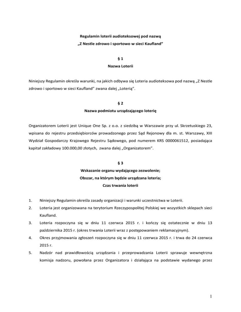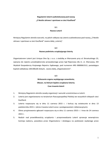 Regulamin loterii audioteksowej pod nazwą „Z Nestle zdrowo i sportowo w sieci Kaufland” §1 Nazwa Loterii Niniejszy Regulamin określa warunki, na jakich odbywa się Loteria audioteksowa pod nazwą „Z Nestle zdrowo i sportowo w sieci Kaufland” zwana dalej „Loterią”. §2 Nazwa podmiotu urządzającego loterię Organizatorem Loterii jest Unique One Sp. z o.o. z siedzibą w Warszawie przy ul. Skrzetuskiego 23, wpisana do rejestru przedsiębiorców prowadzonego przez Sąd Rejonowy dla m. st. Warszawy, XIII Wydział Gospodarczy Krajowego Rejestru Sądowego, pod numerem KRS 0000061512, posiadająca kapitał zakładowy 100.000,00 złotych, zwana dalej „Organizatorem”. §3 Wskazanie organu wydającego zezwolenie; Obszar, na którym będzie urządzana loteria; Czas trwania loterii 1. Niniejszy Regulamin określa zasady organizacji i warunki uczestnictwa w Loterii. 2. Loteria jest organizowana na terytorium Rzeczypospolitej Polskiej we wszystkich sklepach sieci Kaufland. 3. Loteria rozpoczyna się w dniu 11 czerwca 2015 r. i kończy się ostatecznie w dniu 13 października 2015 r. (okres trwania Loterii wraz z postępowaniem reklamacyjnym). 4. Okres przyjmowania zgłoszeń rozpoczyna się w dniu 11 czerwca 2015 r. i trwa do 24 czerwca 2015 r. 5. Nadzór nad prawidłowością urządzania i przeprowadzania Loterii sprawuje wewnętrzna komisja nadzoru, powołana przez Organizatora i działająca na podstawie wydanego przez 1 Organizatora Regulaminu (dalej „Komisja”). W skład Komisji wchodzi osoba posiadająca stosowne świadectwo zawodowe, wydane przez Ministra Finansów. 6. Loteria prowadzona jest na podstawie ustawy z dnia 19 listopada 2009 r. o grach hazardowych (Dz.U. z 2015 r. poz. 612) oraz zezwolenia wydanego przez Dyrektora Izby Celnej w Warszawie. 7. Nagród w Loterii nie mogą otrzymać pracownicy oraz członkowie rodzin pracowników Organizatora, firmy Nestle Polska S. A., z siedzibą w Warszawie, 02-678, przy ul. Szturmowej 2 oraz firmy Kaufland Polska Markety Sp. z o.o. z siedzibą we Wrocławiu, ul. Szybka 6-10, 50-421. 8. Przez członków rodziny, o których mowa w ust. 7 powyżej, rozumie się: wstępnych, zstępnych, rodzeństwo, małżonków, małżonków i zstępnych rodzeństwa, rodziców i rodzeństwo małżonków oraz osoby pozostające w stosunku przysposobienia. 9. Uczestnik powinien zapoznać się z treścią Regulaminu przed przystąpieniem do Loterii. 10. Udział w Loterii i podanie związanych z tym danych, w tym danych osobowych jest dobrowolne, ale konieczne do udziału w Loterii. 11. Uczestnik zobowiązuje się przestrzegać zasad opisanych w Regulaminie. 12. Uczestnik przystępuje do Loterii poprzez przesłanie zgłoszenia. §4 Zasady prowadzenia loterii 1. W Loterii biorą udział produkty Nestle, których lista znajduje się na stronie internetowej www.zyjzdrowoisportowo.pl, w zakładce Kaufland, zwane dalej „Produktami Promocyjnymi” 2. Udział w Loterii mogą brać tylko osoby fizyczne, które ukończyły 18 lat, zamieszkałe na terytorium Polski, posiadające pełną zdolność do czynności prawnych, nabywające określone w niniejszym Regulaminie Produkty Promocyjne jako konsument w rozumieniu art.22[1] KC. 3. Sprzedaż Produktów Promocyjnych rozpoczyna się w dniu 11 czerwca 2015 r. i trwa do 24 czerwca 2015 r. Poza tym okresem Produkty Promocyjne są dostępne w sprzedaży, jednak ich zakup nie uprawnia do udziału w Loterii. 4. Uczestnikiem Loterii może być osoba, o której mowa w ust. 2, , która w okresie od dnia 11 czerwca 2015 r. do 24 czerwca 2015 r. spełni łącznie następujące warunki (dalej „Uczestnik”): a. dokona w sklepie sieci Kaufland jednorazowo zakupu dowolnych Produktów Promocyjnych za kwotę min. 20,00 zł (słownie: dwadzieścia złotych i 00/100) brutto. Zakup wyżej 2 wymienionych Produktów Promocyjnych musi być potwierdzony jednym dowodem zakupu – paragonem; b. zachowa oryginał dowodu zakupu – paragon; c. dokona prawidłowego zgłoszenia swojego udziału w Loterii za pomocą wiadomości tekstowej SMS, wysłanej na numer 70816 w treści wpisując: NESTLE.numer z paragonu (np.: NESTLE.123456); albo dokona prawidłowego zgłoszenia swojego udziału do Loterii za pośrednictwem strony internetowej www.zyjzdrowoisportowo.pl , poprzez wypełnienie formularza znajdującego się na stronie w zakładce Kaufland, zgodnie z zawartymi w nim wskazówkami, tak aby znalazły się w nim co najmniej następujące dane: numer z paragonu, numer telefonu Uczestnika; d. wyrazi zgodę na przetwarzanie danych osobowych na potrzeby Loterii. (dalej „Zgłoszenie”). 5. Koszt wysłania SMS-a wynosi 0,50 zł bez VAT (0,62 zł z VAT). Koszt wysłania SMS-a ponoszą Uczestnicy Loterii. 6. W odpowiedzi na prawidłowo przesłane Zgłoszenie w formie SMS, Uczestnicy otrzymują zwrotnego, bezpłatnego SMS-a informującego o przyjęciu ich Zgłoszenia do Loterii. Potwierdzenie przyjęcia Zgłoszenia na stronie internetowej następuje poprzez wyświetlenie komunikatu Organizatora. 7. O terminie dostarczenia Zgłoszenia decyduje data wpłynięcia Zgłoszenia do Organizatora. 8. Do Loterii dany paragon można zgłosić tylko raz. Jeśli Uczestnik zgłosi wielokrotnie ten sam paragon, Organizator do udziału w Loterii przyjmuje tylko jedno, pierwsze prawidłowe Zgłoszenie danego paragonu. Postanowienia te stosuje się odpowiednio w sytuacji, kiedy Uczestnik dokona zmian w wielkości wpisywanych liter. Oznacza to, iż tym samym Zgłoszeniem jest np. Zgłoszenie o treści: NESTLE.1234, Nestle.1234, nestle.1234, nEsTle.1234 itp. 9. Przesłanie większej liczby numerów z paragonów w jednym Zgłoszeniu traktowane jest jako 1 (jedno) Zgłoszenie. Zgłoszeniem jest pierwszy wpisany do Zgłoszenia numer z paragonu. 10. Dokonanie zakupów na wielokrotność kwoty 20,00 zł brutto na jednym paragonie nie uprawnia do dokonania kilku Zgłoszeń z tytułu tego paragonu. 11. Termin wysyłania Zgłoszeń rozpoczyna się 11 czerwca 2015 r. o go