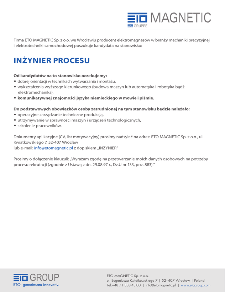 Firma ETO MAGNETIC Sp. z o.o. we Wrocławiu producent elektromagnesów w branży mechaniki precyzyjnej i elektrotechniki samochodowej poszukuje kandydata na stanowisko: INŻYNIER PROCESU Od kandydatów na to stanowisko oczekujemy: • dobrej orientacji w technikach wytwarzania i montażu, • wykształcenia wyższego kierunkowego (budowa maszyn lub automatyka i robotyka bądź elektromechanika), • komunikatywnej znajomości języka niemieckiego w mowie i piśmie. Do podstawowych obowiązków osoby zatrudnionej na tym stanowisku będzie należało: • operacyjne zarządzanie techniczne produkcją, • utrzymywanie w sprawności maszyn i urządzeń technologicznych, • szkolenie pracowników. Dokumenty aplikacyjne (CV, list motywacyjny) prosimy nadsyłać na adres: ETO MAGNETIC Sp. z o.o., ul. Kwiatkowskiego 7, 52-407 Wrocław lub e-mail: [email protected] z dopiskiem „INŻYNIER” Prosimy o dołączenie klauzuli: „Wyrażam zgodę na przetwarzanie moich danych osobowych na potrzeby procesu rekrutacji (zgodnie z Ustawą z dn. 29.08.97 r., Dz.U nr 133, poz. 883).” ETO MAGNETIC Sp. z o.o. ul. Eugeniusza Kwiatkowskiego 7 | 52–407 Wrocław | Poland Tel.+48 71 388 43 00 | [email protected] | www.etogroup.com