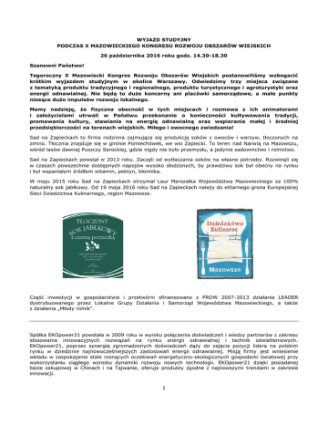 WYJAZD STUDYJNY PODCZAS X MAZOWIECKIEGO KONGRESU ROZWOJU OBSZARÓW WIEJSKICH 26 października 2016 roku godz. 14.30-18.30 Szanowni Państwo! Tegoroczny X Mazowiecki Kongres Rozwoju Obszarów Wiejskich postanowiliśmy wzbogacić krótkim wyjazdem studyjnym w okolice Warszawy. Odwiedzimy trzy miejsca związane z tematyką produktu tradycyjnego i regionalnego, produktu turystycznego i agroturystyki oraz energii odnawialnej. Nie będą to duże koncerny ani placówki samorządowe, a małe punkty niosące dużo impulsów rozwoju lokalnego. Mamy nadzieję, że fizyczna obecność w tych miejscach i rozmowa z ich animatorami i założycielami utrwali w Państwu przekonanie o konieczności kultywowania tradycji, promowania kultury, stawiania na energię odnawialną oraz wspierania małej i średniej przedsiębiorczości na terenach wiejskich. Miłego i owocnego zwiedzania! Sad na Zapieckach to firma rodzinna zajmująca się produkcją soków z owoców i warzyw, tłoczonych na zimno. Tłocznia znajduje się w gminie Pomiechówek, we wsi Zapiecki. To teren nad Narwią na Mazowszu, wśród lasów dawnej Puszczy Serockiej, gdzie nigdy nie było przemysłu, a jedynie sadownictwo i rolnictwo. Sad na Zapieckach powstał w 2013 roku. Zaczęli od wytłaczania soków na własne potrzeby. Rozwinęli się w czasach powszechnie dostępnych napojów wysoko słodzonych, by prawdziwy sok był obecny na rynku i był wspaniałym źródłem witamin, pektyn, błonnika. W maju 2015 roku Sad na Zapieckach otrzymał Laur Marszałka Województwa Mazowieckiego za 100% naturalny sok jabłkowy. Od 19 maja 2016 roku Sad na Zapieckach należy do elitarnego grona Europejskiej Sieci Dziedzictwa Kulinarnego, region Mazowsze. Część inwestycji w gospodarstwie i przetwórni sfinansowano z PROW 2007-2013 działanie LEADER dystrybuowanego przez Lokalne Grupy Działania i Samorząd Województwa Mazowieckiego, a także z działania „Młody rolnik”. Spółka EKOpower21 powstała w 2009 roku w wyniku połączenia doświadczeń i wiedzy partnerów z zakresu stosowania innowacyjnych rozwiązań na rynku energii odnawialnej i technik oświetleniowych. EKOpower21, poprzez synergię zgromadzonych doświadczeń dąży do zajęcia pozycji lidera na polskim rynku w dziedzinie najnowocześniejszych zastosowań energii odnawialnej. Misją firmy jest wniesienie wkładu w zaspokajanie stale rosnących oczekiwań energetyczno-ekologicznych gospodarki światowej przy wykorzystaniu ciągłego wzrostu dynamiki rozwoju nowych technologii. EKOpower21 dzięki posiadanej bazie zakupowej w Chinach i na Tajwanie, oferuje produkty zgodne z najnowszymi trendami w zakresie innowacji. 1 Elektrownia Fotowoltaiczna o mocy 9,6 kWp (moc szczytowa) posadowiona na dachu siedziby EKOpower21 oraz budynku pomieszczenia gospodarczego jest pierwszą instalacją na Mazowszu podłączoną do sieci PGE S.A. Instalacja zbudowana jest na 48 sztukach monokrystalicznych modułów A-SUN 200M, 3 falownikach SMA SUNNY BOY model SB3000TL-21. Także ELEKTROWNIA NIEPORĘT II – elektrownia fotowoltaiczna o mocy 39,6 kWp (moc szczytowa) – jest pierwszą naziemną instalacją na Mazowszu podłączoną do sieci PGE S.A. Instalacja zbudowana jest na 198 sztukach monokrystalicznych modułów A-SUN 200M, 2 falownikach SMA SUNNY TRIPOWER 15000TL-21 oraz jednym 8000TL. Obie inwestycje współfinansowane były przez Unię Europejską ze środków finansowych Europejskiego Funduszu Rybackiego zapewniającą inwestycje w zrównoważone rybołówstwo. Kuligów to malownicza wieś położona nad rozlewiskami Bugu, gdzie z prywatnych środków powstał Park Kultury Ludowej. Pierwsze obiekty zostały przeniesione do Kuligowa w 2000 roku. Obecnie w skansenie można obejrzeć przydrożną kuźnię, wiejską chatę, spichlerz, stodołę, oborę, dworek drobnoszlachecki oraz wozownię. Twórcą tego miejsca jest Wojciech Urmanowski. Przy budynkach stoją okazałe rzeźby Marka Gołaszewskiego z Marek – samouka, który sporych rozmiarów dzieła wykonuje w drewnie za pomogą piły spalinowej. Pomysłodawca przedsięwzięcia zakupił już ponad 1000 eksponatów, jednak nie wszystkie zostały przewiezione do Kuligowa. Już wkrótce będzie można podziwiać tu budynki, z których każdy kryty będzie inną techniką. Pan Wojciech Urbanowski, założyciel skansenu w Kuligowie, na stronie internetowej muzeum, tak opisuje tę okolicę: to miejsce, „gdzie wpływy tych dwóch regionów mieszały się i przenikały, gdzie obok siebie w zgodzie mieszkali katolicy, prawosławni, ewangelicy i żydzi, gdzie na jarmark przyjeżdżał zarówno rodowity Mazowszanin, jak i śpiewnie mówiący Podlasiak. Ten pejzaż kulturowy – drewniane chaty kryte naturalnym materiałem, ręcznie wykonane narzędzia, język, jakim kiedyś mówiono, jak i pejzaż przyrodniczy – płaski, monotonny krajobraz nieszczególnie bogaty w kolory, wciąż przechowuję w swojej pamięci” (www.skansen.powiatwolominski.pl). Mimo, ze Skansen jest własnością prywatną, to część środków pozyskiwało się z PROW 2007-2013 oraz PO RYBY 2007-2013 korzystając także ze wsparcia samorządów i Lokalnej Grupy Działania. 2