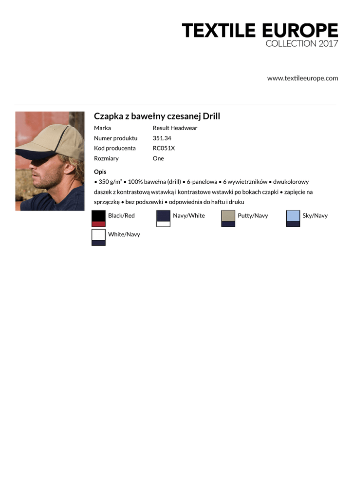Czapka z bawełny czesanej Drill Marka Result Headwear Numer produktu 351.34 Kod producenta RC051X Rozmiary One Opis • 350 g/m² • 100% bawełna (drill) • 6-panelowa • 6 wywietrzników • dwukolorowy daszek z kontrastową wstawką i kontrastowe wstawki po bokach czapki • zapięcie na sprzączkę • bez podszewki • odpowiednia do haftu i druku Black/Red White/Navy Navy/White Putty/Navy Sky/Navy