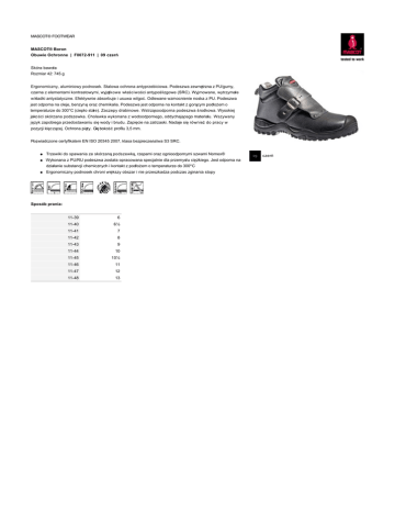 MASCOT® FOOTWEAR MASCOT® Boron Obuwie Ochronne | F0072-911 | 09 czerń Skóra bawoła Rozmiar 42: 745 g Ergonomiczny, aluminiowy podnosek. Stalowa ochrona antyprzebiciowa. Podeszwa zewnętrzna z PU/gumy, czarna z elementami kontrastowymi, wyjątkowe właściwości antypoślizgowe (SRC). Wyjmowane, wytrzymałe w kładki antystatyczne. Efektywnie absorbuje i usuwa wilgoć. Odlewane wzmocnienie noska z PU. Podeszwa jest odporna na oleje, benzynę oraz chemikalia. Podeszwa jest odporna na kontakt z gorącym podłożem o temperaturze do 300°C (ciepło stałe). Zaczepy drabinowe. Wstrząsoodporna podeszwa środkowa. Wysokiej jakości skórzana podszewka. Cholewka wykonana z wodoodpornego, oddychającego materiału. Wszywany język zapobiega przedostawaniu się wody i brudu. Zapięcie na zatrzaski. Nadaje się również do pracy w pozycji klęczącej. Ochrona pięty. Głębokość profilu 3,5 mm. Poświadczone certyfikatem EN ISO 20345 2007, klasa bezpieczeństwa S3 SRC. l Trzewiki do spawania ze skórzaną podszewką, rzepami oraz ognioodpornymi szwami Nomex® l Wykonana z PU/RU podeszwa została opracowana specjalnie dla przemysłu ciężkiego. Jest odporna na działanie substancji chemicznych i kontakt z podłożem o temperaturze do 300ºC l Ergonomiczny podnosek chroni większy obszar i nie przeszkadza podczas zginania stopy Sposób prania: 11-39 6 11-40 6½ 11-41 7 11-42 8 11-43 9 11-44 10 11-45 10½ 11-46 11 11-47 12 11-48 13 czerń