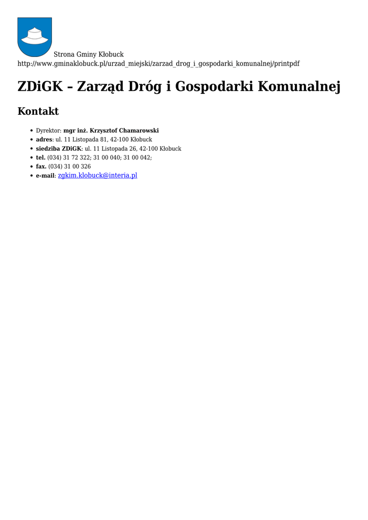 Strona Gminy Kłobuck http://www.gminaklobuck.pl/urzad_miejski/zarzad_drog_i_gospodarki_komunalnej/printpdf ZDiGK – Zarząd Dróg i Gospodarki Komunalnej Kontakt Dyrektor: mgr inż. Krzysztof Chamarowski adres: ul. 11 Listopada 81, 42-100 Kłobuck siedziba ZDiGK: ul. 11 Listopada 26, 42-100 Kłobuck tel. (034) 31 72 322; 31 00 040; 31 00 042; fax. (034) 31 00 326 e-mail: [email protected]