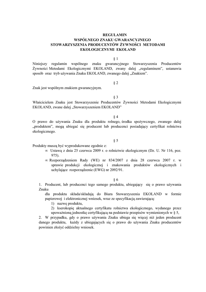 REGULAMIN WSPÓLNEGO ZNAKU GWARANCYJNEGO STOWARZYSZENIA PRODUCENTÓW śYWNOŚCI METODAMI EKOLOGICZNYMI EKOLAND §1 Niniejszy regulamin wspólnego znaku gwarancyjnego Stowarzyszenia Producentów śywności Metodami Ekologicznymi EKOLAND, zwany dalej „regulaminem”, ustanawia sposób oraz tryb uŜywania Znaku EKOLAND, zwanego dalej „Znakiem”. §2 Znak jest wspólnym znakiem gwarancyjnym. §3 Właścicielem Znaku jest Stowarzyszenie Producentów śywności Metodami Ekologicznymi EKOLAND, zwane dalej „Stowarzyszeniem EKOLAND” §4 O prawo do uŜywania Znaku dla produktu rolnego, środka spoŜywczego, zwanego dalej „produktem”, mogą ubiegać się producent lub producenci posiadający certyfikat rolnictwa ekologicznego. §5 Produkty muszą być wyprodukowane zgodnie z: • Ustawą z dnia 25 czerwca 2009 r. o rolnictwie ekologicznym (Dz. U. Nr 116, poz. 975). • Rozporządzeniem Rady (WE) nr 834/2007 z dnia 28 czerwca 2007 r. w sprawie produkcji ekologicznej i znakowania produktów ekologicznych i uchylające rozporządzenie (EWG) nr 2092/91. §6 1. Producent, lub producenci tego samego produktu, ubiegający się o prawo uŜywania Znaku dla produktu składa/składają do Biura Stowarzyszenia EKOLAND w formie papierowej i elektronicznej wniosek, wraz ze specyfikacją zawierającą: 1) nazwę produktu, 2) kserokopię aktualnego certyfikatu rolnictwa ekologicznego, wydanego przez upowaŜnioną jednostkę certyfikującą na podstawie przepisów wymienionych w § 5, 2. W przypadku, gdy o prawo uŜywania Znaku ubiega się więcej niŜ jeden producent danego produktu, kaŜdy z ubiegających się o prawo do uŜywania Znaku producentów powinien złoŜyć oddzielny wniosek. §7 1. Wniosek składa się na formularzu ustanowionym przez Zarząd Stowarzyszenia EKOLAND. 2. Wniosek składa się w formie pisemnej i na elektronicznym nośniku informacji. §8 1. O prawie do uŜywania Znaku decyduje Zarząd Stowarzyszenia EKOLAND na podstawie spełnionych warunków podanych § 5. 2. Prawo do uŜywania znaku jest udzielane na okres 3 lat. §9 1. Prawo do uŜywania znaku jest odpłatne. 2. Wysokość opłat za uŜywanie Znaku będzie określana przez Zarząd Stowarzyszenia EKOLAND. § 10 Opłata za prawo do uŜywania Znaku składa się z dwóch części: 1) Rocznej opłaty rejestracyjnej uiszczanej wraz ze składaniem wniosku o udzielenie prawa do stosowania Znaku. O jej wysokości producent zostanie poinformowany przed podpisaniem umowy o udzielenie prawa do stosowania Znaku. Opłata jest stała obowiązuje przez czas trwania umowy. 2) Rocznej opłaty „asortymentowej” ustalonej przez Zarząd Stowarzyszenia EKOLAND. O jej wysokości producent zostanie poinformowany przed podpisaniem umowy o udzielenie prawa do stosowania Znaku. Opłata jest zaleŜna od ilości zgłoszonych produktów. 3) Opłaty uiszczane są corocznie , przez cały okres obowiązywania umowy. 4) KaŜdą kolejną opłatę naleŜy uiszczać do końca marca roku, na który obowiązuje umowa. § 11 1. Wzór Znaku stanowi Załącznik nr 1 do niniejszego regulaminu. 2. UŜytkownik Znaku ma prawo uŜywania tego znaku w pełnym zakresie. § 12 Korzystanie ze Znaku reguluje umowa zawierana pomiędzy Zarządem Stowarzyszenia EKOLAND a producentem. § 13 UŜytkownik Znaku jest zobowiązany do: 1) produkcji zgodnie z § 5 oraz ze specyfikacją, o której mowa w § 6, 2) kaŜdorazowo dostarczenia do Biura Stowarzyszenia EKOLAND aktualnego certyfikatu rolnictwa ekologicznego. 3) terminowego uiszczania opłaty, o której mowa w § 9 i § 10. § 14 1. Zarząd Stowarzyszenia EKOLAND pozbawia producenta prawa do uŜywania Znaku, w przypadku braku spełnienia przez uŜytkownika Znaku warunków wymienionych w § 13. 2. Producent zobowiązany jest zaprzestać uŜywania Znaku w momencie skutecznego dostarczenia decyzji Zarządu Stowarzyszenia EKOLAND. Po otrzymaniu w/w decyzji producent zobowiązany jest niezwłocznie usunąć z rynku produkty znajdujące się w sprzedaŜy i oznakowane Znakiem oraz powiadomić o tym pisemnie Zarząd Stowarzyszenia EKOLAND. 3. W przypadku nie wywiązania się producenta w terminie 30 dni ze zobowiązania określonego w pkt. 2 Zarząd podejmuje działania na drodze sądowej, które mają na celu egzekucję obowiązującego prawa . Ponadto Zarząd informuje wszystkich zainteresowanych o naruszeniu prawa do korzystania ze Znaku za pośrednictwem mediów, w tym elektronicznych. Zatwierdzony przez Zarząd Stowarzyszenia Ekoland w dniu 29.12.2009 r