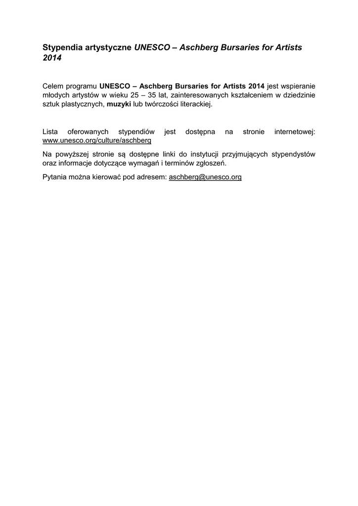 Stypendia artystyczne UNESCO – Aschberg Bursaries for Artists 2014 Celem programu UNESCO – Aschberg Bursaries for Artists 2014 jest wspieranie młodych artystów w wieku 25 – 35 lat, zainteresowanych kształceniem w dziedzinie sztuk plastycznych, muzyki lub twórczości literackiej. Lista oferowanych stypendiów www.unesco.org/culture/aschberg jest dostępna na stronie internetowej: Na powyższej stronie są dostępne linki do instytucji przyjmujących stypendystów oraz informacje dotyczące wymagań i terminów zgłoszeń. Pytania można kierować pod adresem: [email protected]