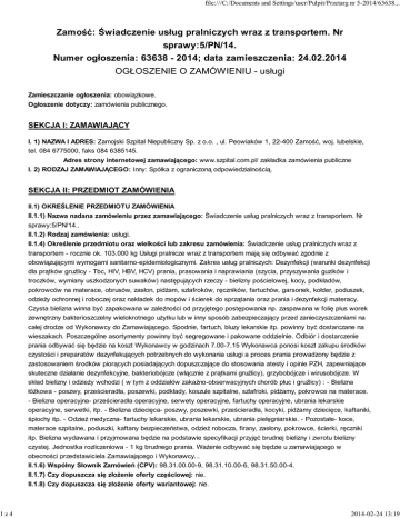 1z4 file:///C:/Documents and Settings/user/Pulpit/Przetarg nr 5-2014/63638... Zamość: Świadczenie usług pralniczych wraz z transportem. Nr sprawy:5/PN/14. Numer ogłoszenia: 63638 - 2014; data zamieszczenia: 24.02.2014 OGŁOSZENIE O ZAMÓWIENIU - usługi Zamieszczanie ogłoszenia: obowiązkowe. Ogłoszenie dotyczy: zamówienia publicznego. SEKCJA I: ZAMAWIAJĄCY I. 1) NAZWA I ADRES: Zamojski Szpital Niepubliczny Sp. z o.o. , ul. Peowiaków 1, 22-400 Zamość, woj. lubelskie, tel. 084 6775000, faks 084 6385145. Adres strony internetowej zamawiającego: www.szpital.com.pl/ zakładka zamówienia publiczne I. 2) RODZAJ ZAMAWIAJĄCEGO: Inny: Spółka z ograniczoną odpowiedzialnością. SEKCJA II: PRZEDMIOT ZAMÓWIENIA II.1) OKREŚLENIE PRZEDMIOTU ZAMÓWIENIA II.1.1) Nazwa nadana zamówieniu przez zamawiającego: Świadczenie usług pralniczych wraz z transportem. Nr sprawy:5/PN/14.. II.1.2) Rodzaj zamówienia: usługi. II.1.4) Określenie przedmiotu oraz wielkości lub zakresu zamówienia: Świadczenie usług pralniczych wraz z transportem - rocznie ok. 103.000 kg Usługi pralnicze wraz z transportem mają się odbywać zgodnie z obowiązującymi wymogami sanitarno-epidemiologicznymi. Zakres usług pralniczych: Dezynfekcji (warunki dezynfekcji dla prątków gruźlicy - Tbc, HIV, HBV, HCV) prania, prasowania i naprawiania (szycia, przyszywania guzików i troczków, wymiany uszkodzonych suwaków) następujących rzeczy - bielizny pościelowej, kocy, podkładów, pokrowców na materace, obrusów, zasłon, pidżam, szlafroków, ręczników, fartuchów, garsonek, kołder, poduszek, odzieży ochronnej i roboczej oraz nakładek do mopów i ścierek do sprzątania oraz prania i dezynfekcji materacy. Czysta bielizna winna być zapakowana w zależności od przyjętego postępowania np. zaspawana w folię plus worek zewnętrzny bakterioszczelny wielokrotnego użytku lub w inny sposób zabezpieczający przed zanieczyszczeniami na całej drodze od Wykonawcy do Zamawiającego. Spodnie, fartuch, bluzy lekarskie itp. powinny być dostarczane na wieszakach. Poszczególne asortymenty powinny być segregowane i pakowane oddzielnie. Odbiór i dostarczenie prania odbywać się będzie na koszt Wykonawcy w godzinach 7.00-7.15 Wykonawca ponosi koszt zakupu środków czystości i preparatów dezynfekujących potrzebnych do wykonania usługi a proces prania prowadzony będzie z zastosowaniem środków piorących posiadających dopuszczające do stosowania atesty i opinie PZH, zapewniające skuteczne działanie dezynfekcyjne, bakteriobójcze (włącznie z prątkami gruźlicy), grzybobójcze i wirusobójcze. W skład bielizny i odzieży wchodzi ( w tym z oddziałów zakaźno-obserwacyjnych chorób płuc i gruźlicy) : - Bielizna łóżkowa - poszwy, prześcieradła, poszewki, podkłady, koszule szpitalne, szlafroki, pidżamy, pokrowce na materace. - Bielizna operacyjna- prześcieradła operacyjne, serwety operacyjne, fartuchy operacyjne, ubrania lekarskie operacyjne, serwetki, itp. - Bielizna dziecięca- poszwy, poszewki, prześcieradła, kocyki, pidżamy dziecięce, kaftaniki, śpiochy itp. - Odzież medyczna- fartuchy lekarskie, ubrania lekarskie, ubrania pielęgniarskie. - Pozostałe- koce, materace szpitalne, poduszki, kaftany bezpieczeństwa, odzież robocza, firany, zasłony, pokrowce, ścierki, ręczniki itp. Bielizna wydawana i przyjmowana będzie na podstawie specyfikacji przyjęć brudnej bielizny i zwrotu bielizny czystej. Jednostka rozliczeniowa - 1 kg brudnego prania. Ważenie odbywać się będzie u zamawiającego w obecności przedstawiciela Zamawiającego i Wykonawcy... II.1.6) Wspólny Słownik Zamówień (CPV): 98.31.00.00-9, 98.31.10.00-6, 98.31.50.00-4. II.1.7) Czy dopuszcza się złożenie oferty częściowej: nie. II.1.8) Czy dopuszcza się złożenie oferty wariantowej: nie. 2014-02-24 13:19 2z4 file:///C:/Documents and Settings/user/Pulpit/Przetarg nr 5-2014/63638... II.2) CZAS TRWANIA ZAMÓWIENIA LUB TERMIN WYKONANIA: Okres w miesiącach: 12. SEKCJA III: INFORMACJE O CHARAKTERZE PRAWNYM, EKONOMICZNYM, FINANSOWYM I TECHNICZNYM III.1) WADIUM Informacja na temat wadium: Zamawiający nie wymaga wniesienia wadium. III.2) ZALICZKI III.3) WARUNKI UDZIAŁU W POSTĘPOWANIU ORAZ OPIS SPOSOBU DOKONYWANIA OCENY SPEŁNIANIA TYCH WARUNKÓW III. 3.1) Uprawnienia do wykonywania określonej działalności lub czynności, jeżeli przepisy prawa nakładają obowiązek ich posiadania Opis sposobu dokonywania oceny spełniania tego warunku Zamawiający nie precyzuje w tym zakresie żadnych wymagań, których spełniania Wykonawca zobowiązany jest wykazać w sposób szczególny. Zamawiający dokona oceny spełniania warunków udziału w postępowaniu w tym zakresie na podstawie złożonego oświadczenia o spełnianiu warunków udziału w postępowaniu o udzielenie zamówienia publicznego, o których mowa w art. 22 ust.1 ustawy Prawo zamówień publicznych. III.3.2) Wiedza i doświadczenie Opis sposobu dokonywania oceny spełniania tego warunku Zamawiający nie precyzuje w tym zakresie żadnych wymagań, których spełniania Wykonawca zobowiązany jest wykazać w sposób szczególny. Zamawiający dokona oceny spełniania warunków udziału w postępowaniu w tym zakresie na podstawie złożonego oświadczenia o spełnianiu warunków udziału w postępowaniu o udzielenie zamówienia publicznego, o których mowa w art. 22 ust.1 ustawy Prawo zamówień publicznych. III.3.3) Potencjał techniczny Opis sposobu dokonywania oceny spełniania tego warunku Zamawiający nie precyzuje w tym zakresie żadnych wymagań, których spełniania Wykonawca zobowiązany jest wykazać w sposób szczególny. Zamawiający dokona oceny spełniania warunków udziału w postępowaniu w tym zakresie na podstawie złożonego oświadczenia o spełnianiu warunków udziału w postępowaniu o udzielenie zamówienia publicznego, o których mowa w art. 22 ust.1 ustawy Prawo zamówień publicznych. III.3.4) Osoby zdolne do wykonania zamówienia O