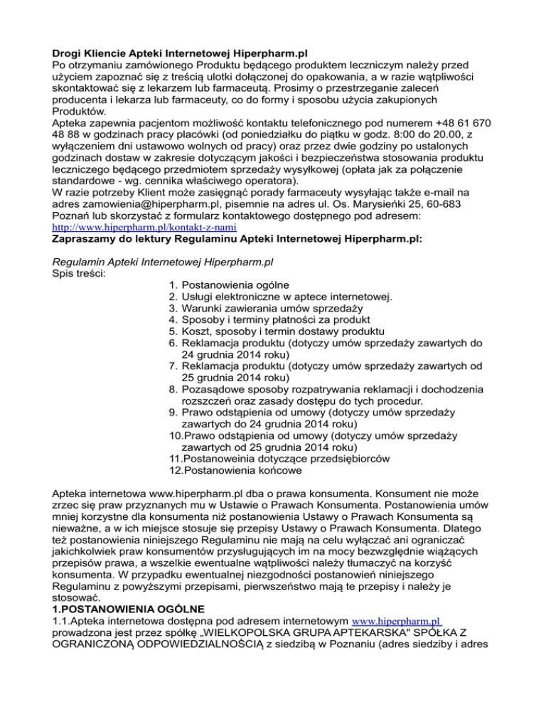 Drogi Kliencie Apteki Internetowej Hiperpharm.pl Po otrzymaniu zamówionego Produktu będącego produktem leczniczym należy przed użyciem zapoznać się z treścią ulotki dołączonej do opakowania, a w razie wątpliwości skontaktować się z lekarzem lub farmaceutą. Prosimy o przestrzeganie zaleceń producenta i lekarza lub farmaceuty, co do formy i sposobu użycia zakupionych Produktów. Apteka zapewnia pacjentom możliwość kontaktu telefonicznego pod numerem +48 61 670 48 88 w godzinach pracy placówki (od poniedziałku do piątku w godz. 8:00 do 20.00, z wyłączeniem dni ustawowo wolnych od pracy) oraz przez dwie godziny po ustalonych godzinach dostaw w zakresie dotyczącym jakości i bezpieczeństwa stosowania produktu leczniczego będącego przedmiotem sprzedaży wysyłkowej (opłata jak za połączenie standardowe - wg. cennika właściwego operatora). W razie potrzeby Klient może zasięgnąć porady farmaceuty wysyłając także e-mail na adres [email protected], pisemnie na adres ul. Os. Marysieńki 25, 60-683 Poznań lub skorzystać z formularz kontaktowego dostępnego pod adresem: http://www.hiperpharm.pl/kontakt-z-nami Zapraszamy do lektury Regulaminu Apteki Internetowej Hiperpharm.pl: Regulamin Apteki Internetowej Hiperpharm.pl Spis treści: 1. Postanowienia ogólne 2. Usługi elektroniczne w aptece internetowej. 3. Warunki zawierania umów sprzedaży 4. Sposoby i terminy płatności za produkt 5. Koszt, sposoby i termin dostawy produktu 6. Reklamacja produktu (dotyczy umów sprzedaży zawartych do 24 grudnia 2014 roku) 7. Reklamacja produktu (dotyczy umów sprzedaży zawartych od 25 grudnia 2014 roku) 8. Pozasądowe sposoby rozpatrywania reklamacji i dochodzenia rozszczeń oraz zasady dostępu do tych procedur. 9. Prawo odstąpienia od umowy (dotyczy umów sprzedaży zawartych do 24 grudnia 2014 roku) 10.Prawo odstąpienia od umowy (dotyczy umów sprzedaży zawartych od 25 grudnia 2014 roku) 11.Postanoweinia dotyczące przedsiębiorców 12.Postanowienia końcowe Apteka internetowa www.hiperpharm.pl dba o prawa konsumenta. Konsument nie może zrzec się praw przyznanych mu w Ustawie o Prawach Konsumenta. Postanowienia umów mniej korzystne dla konsumenta niż postanowienia Ustawy o Prawach Konsumenta są nieważne, a w ich miejsce stosuje się przepisy Ustawy o Prawach Konsumenta. Dlatego też postanowienia niniejszego Regulaminu nie mają na celu wyłączać ani ograniczać jakichkolwiek praw konsumentów przysługujących im na mocy bezwzględnie wiążących przepisów prawa, a wszelkie ewentualne wątpliwości należy tłumaczyć na korzyść konsumenta. W przypadku ewentualnej niezgodności postanowień niniejszego Regulaminu z powyższymi przepisami, pierwszeństwo mają te przepisy i należy je stosować. 1.POSTANOWIENIA OGÓLNE 1.1.Apteka internetowa dostępna pod adresem internetowym www.hiperpharm.pl prowadzona jest przez spółkę „WIELKOPOLSKA GRUPA APTEKARSKA" SPÓŁKA Z OGRANICZONĄ ODPOWIEDZIALNOŚCIĄ z siedzibą w Poznaniu (adres siedziby i adres do korespondencji: ul. Os. Marysieńki 25, 60-683 Poznań); wpisana do Rejestru Przedsiębiorców Krajowego Rejestru Sądowego pod numerem KRS 00000186343; sąd rejestrowy, w którym przechowywana jest dokumentacja spółki: Sąd Rejonowy PoznańNowe Miasto i Wilda w Poznaniu VIII Wydział Gospodarczy - KRS; kapitał zakładowy w wysokości: 60.000,00 zł; NIP: 7780085167; REGON: 630196573; adres poczty elektronicznej: [email protected]. 1.2.Niniejszy Regulamin skierowany jest zarówno do konsumentów, jak i do przedsiębiorców korzystających ze Sklepu Internetowego (z wyjątkiem pkt. 11 Regulaminu, który skierowany jest wyłącznie do przedsiębiorców). 1.3.Administratorem danych osobowych przetwarzanych w związku z realizacją postanowień niniejszego Regulaminu jest Usługodawca. Dane osobowe przetwarzane są w celach, w zakresie i w oparciu o zasady wskazane w polityce prywatności opublikowanej na stronach Apteki internetowej. Podanie danych osobowych jest dobrowolne. Każda osoba, której dane osobowe przetwarza Usługodawca ma prawo do wglądu w ich treść oraz prawo do ich aktualizacji i poprawiania. 1.4.Zezwolenie na prowadzenie apteki ogólnodostępnej zostało wydane przez Wielkopolskiego Wojewódzkiego Inspektora Farmaceutycznego w dniu 30 października 2006 r. Numer zezwolenia: GIF-FAA/1167/A/90/1402/2000/WIF.PO.A-8240.2A/37/06. Odnośnik do zezwolenia w formacie pdf dostępny jest w zakładce „Zezwolenie” na stronie internetowej Apteki Internetowej (kliknij). 1.5.Definicje: 1.5.1.APTEKA INTERNETOWA - apteka internetowa Usługodawcy dostępny pod adresem internetowym: www.hiperpharm.pl. 1.5.2.DZIEŃ ROBOCZY – jeden dzień od poniedziałku do piątku z wyłączeniem dni ustawowo wolnych od pracy. 1.5.3.FORMULARZ REJESTRACJI – formularz dostępny w Aptece internetowej umożliwiający utworzenie Konta. 1.5.4.FORMULARZ ZAMÓWIENIA – Usługa Elektroniczna, interaktywny formularz dostępny w Aptece internetowej umożliwiający złożenie Zamówienia, w szczególności poprzez dodanie Produktów do elektronicznego koszyka oraz określenie warunków Umowy Sprzedaży, w tym sposobu dostawy i płatności. 1.5.5.FORUM – Usługa Elektroniczna, forum internetowe dostępne w Aptece Internetowej umożliwiające Usługobiorcom wymianę poglądów i opinii oraz wzajemną pomoc. 1.5.6.KLIENT – (1) osoba fizyczna posiadająca pełną zdolność do czynności prawnych, a w wypadkach przewidzianych przez przepisy powszechnie obowiązujące także osoba fizyczna posiadająca ograniczoną zdolność do czynności prawnych; (2) osoba prawna; albo (3) jednostka organizacyjna nieposiadająca osobowości prawnej, której ustawa przyznaje zdolność prawną; - która zawarła lub zamierza zawrzeć Umowę Sprzedaży ze Sprzedawcą. 1.5.7.KODEKS CYWILNY – ustawa kodeks cywilny z dnia 23 kwietnia 1964 r. (Dz.U. 1964 nr 16, poz. 93 ze zm.). 1.5.8.KONTO – Usługa Elektroniczna, oznaczony indywidualną