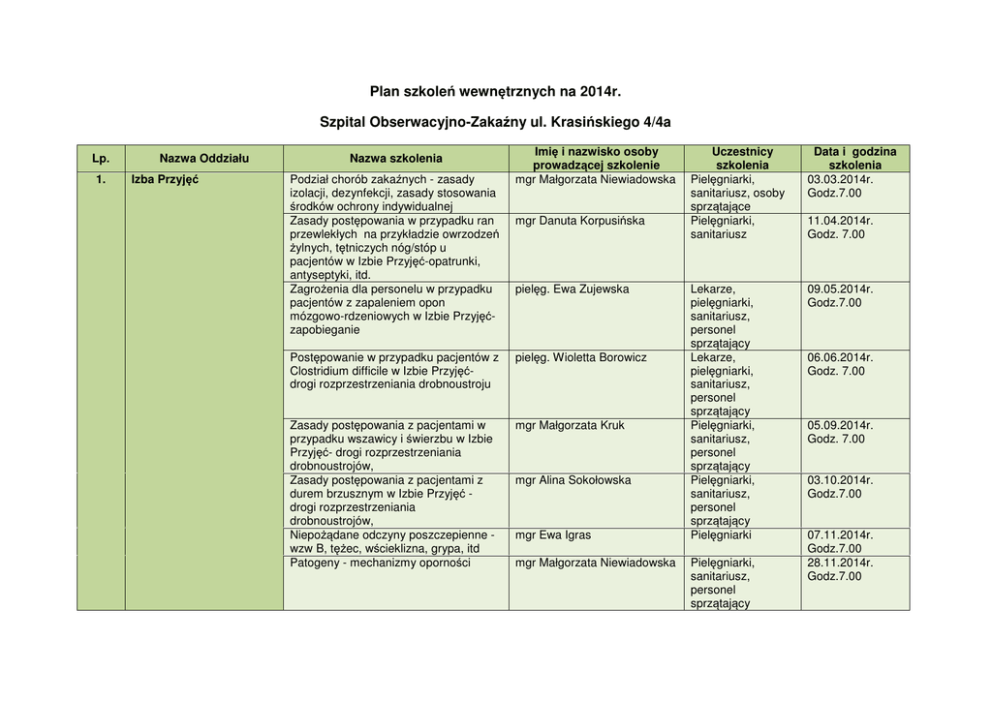 Plan szkoleń wewnętrznych na 2014r. Szpital Obserwacyjno