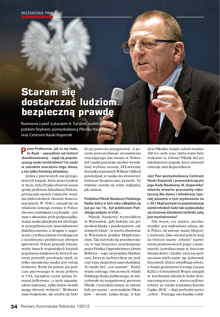 rozmowa par Staram się dostarczać ludziom bezpieczną prawdę Rozmowa z prof. Łukaszem A. Turskim, wybitnym polskim fizykiem, pomysłodawcą Pikniku Naukowego oraz Centrum Nauki Kopernik anie Profesorze, jak to się stało, że fizyk – specjalista od materii skondensowanej – zajął się popularyzacją nauki wśród laików? I to nauki w szerokim znaczeniu tego słowa, a nie tylko Pańskiej dziedziny. Jedną z pierwszych nie-przygodowych książek, które przeczytałem w życiu, była Fizyka stwarza nową epokę profesora Arkadiusza Piekary, przyjaciela moich rodziców, więźnia hitlerowskich obozów koncentracyjnych. W 1946 r. naraził się on władzom nowego reżimu w Polsce dwoma rozdziałami z tej książki – jednym o absurdzie prób podporządkowania nauki jakiejkolwiek ideologii, w szczególności tzw. materializmowi dialektycznemu, a drugim o zagrożeniu cywilizacyjnym wynikającym z możliwości proliferacji zbrojeń jądrowych. Potem przyszły lektury wielu innych wspaniałych książek popularno-naukowych, których autorzy potrafili przekazać myśl, że tylko niezależna nauka jest ostoją wolności. Wiele lat potem, już podczas pierwszego w życiu pobytu w USA, zacząłem czytać pisma Tomasza Jeffersona, i z nich zapamiętałem maksymę „tylko ludzie światli mogą obronić wolność”. Wolności nam brakowało, ale trzeba się było 34 do jej powrotu przygotować. A poziom powszechnego zrozumienia otaczającego nas świata w Polsce był i nadal pozostaje niezbyt wysoki. Inny wybitny uczony, XIX-wieczny brytyjski matematyk William Clifford powiedział, że nauka ma dostarczyć ludziom bezpiecznej prawdy. To właśnie staram się robić najlepiej, jak umiem. Podobno Piknik Naukowy Polskiego Radia, który w tym roku odbędzie się już po raz 16., był pokłosiem Pańskiego pobytu w USA… Piknik Naukowy wymyśliłem w Warszawie, gdy kolejny raz poniosłem klęskę z przekonaniem „odnośnych władz”, że trzeba zbudować w Warszawie polskie Eksploratorium. Tak nazywało się przedsięwzięcie w San Francisco uruchomione przez Franka Oppenheimera (brata Roberta – tego od projektu Manhattan), którym zachwyciłem się podczas tejże ekspedycji amerykańskiej. To miało być „coś zamiast”. Podziwiam odwagę ówczesnych władz Polskiego Radia publicznego, że zdecydowały się zorganizować pierwszy Piknik, i wszystkim innym, że zawsze były po naszej – uczestników Pikników – stronie. Lekko licząc, w każ- pomiary automatyka robotyka 1/2012 dym Pikniku wzięło udział średnio 100 tys. osób, więc chyba warto było wykonać tę robotę! Piknik był też inkubatorem zespołu, który stworzył i kieruje dziś Kopernikiem. Jest Pan pomysłodawcą Centrum Nauki Kopernik i przewodniczącym jego Rady Naukowej. W „Koperniku” właśnie otwarto pracownię robotyczną dla dzieci i młodzieży (szerzej piszemy o tym wydarzeniu na s. 40.) Skąd pomysł na popularyzację wśród młodych ludzi tak wydawałoby się niszowej dziedzinie techniki, jaką jest mechatronika? Nie wiem, czy nazwa „mechatronika” jest najbardziej udana, ale w Polsce od zawsze mamy kłopoty z nazwami. Jako niemal jedyny kraj na świecie mamy „własne” nazwy wielu podstawowych pojęć z matematyki (zawdzięczamy je braciom Śniadeckim) i fatalny zwyczaj spolszczania wielu nazw, np. jednostek fizycznych. Dzieci uwielbiają roboty, a dzięki geniuszowi Georga Lucasa R2D2 z Gwiezdnych Wojen zastąpił w wyobraźni młodych ludzi dość niesympatyczne i nieszczęśliwe roboty ze sztuki teatralnej Karola Čapka „RUR” — skąd pochodzi nazwa „robot”. Poznając mechanikę i elek- rozmowa par tronikę niezbędną do zbudowania prostych robotów czy automatów, uczestnicy naszej pracowni przygotowują się do aktywnego uczestnictwa w rozwoju technologicznym naszej cywilizacji. I to znacznie bardziej niż bezsensownie „ucząc się” na lekcjach tzw. informatyki obsługi komercyjnych programów komputerowych, co zresztą umieją, nawet bez tych lekcji, lepiej niż starsze pokolenie. Czy zdradzi nam Pan, co wyjątkowego zaplanowano na tegoroczny piknik? A może istnieje coś, na czym Panu szczególnie zależy, ale jak dotąd nie mógł Pan tego zorganizować? 16. Piknik Naukowy będzie ciut inny organizacyjnie niż poprzednie. Od tego roku nie jestem już przewodniczącym Komitetu Programowego, a koledzy obdarzyli mnie funkcją honorowego przewodniczącego. Piknikiem bezpośrednio kieruje teraz tandem w składzie: Iwona Maksymowicz z Centrum Nauki Kopernik oraz profesor Konrad Bajer z Uniwersytetu War- CNK nie jest instytucją mającą prowadzić badania naukowe. Bez inicjacji intelektualnej, której służą CNK, Piknik, Festiwale Nauki i dziesiątki innych imprez popularnonaukowych w Polsce (15 lat temu nie było nic – dzisiaj nawet w małych miastach potrafią się skrzyknąć entuzjaści wiedzy, by zorganizować, piknik, jarmark, festiwal, dzień nauki) nie będziemy w stanie wystartować do wyścigu o porządne miejsce w tym „Rajdzie Dakar” światowej cywilizacji. Musimy zacząć nasze przygotowania od przedszkoli i zmienić cały system edukacji. Ostatnie reformy dotyczą tylko czubka piramidy. Ja bym to robił inaczej. Kończąc ten wątek, czy zgadza się Pan z opinią, że polski absolwent – mam tu na myśli głównie absolwentów kierunków ścisłych i technicznych – jest nieprzygotowany do wejścia na rynek pracy? I tak, i nie. Na skutek fatalnego stanu edukacji powszechnej – to konsekwencja przeszło ćwierćwie- Nasz rynek pracy jest tandetny. wciąż nie ma w nim zbyt wiele atrakcyjnych miejsc pracy dla ludzi, przykładowo, z talentami i konstrukcją osobowości typu Stevena Jobsa. Fot. Robert Kowalewski (Agencja Gazeta) szawskiego. Piknik ma swoje hasło przewodnie –Energia. To samo już mówi o wspaniałości zaplanowanych pokazów. Marzeniem było, by dało się zamknąć ruch kołowy na ulicy przecinającej tereny Pikniku i by już nikt nie wpa