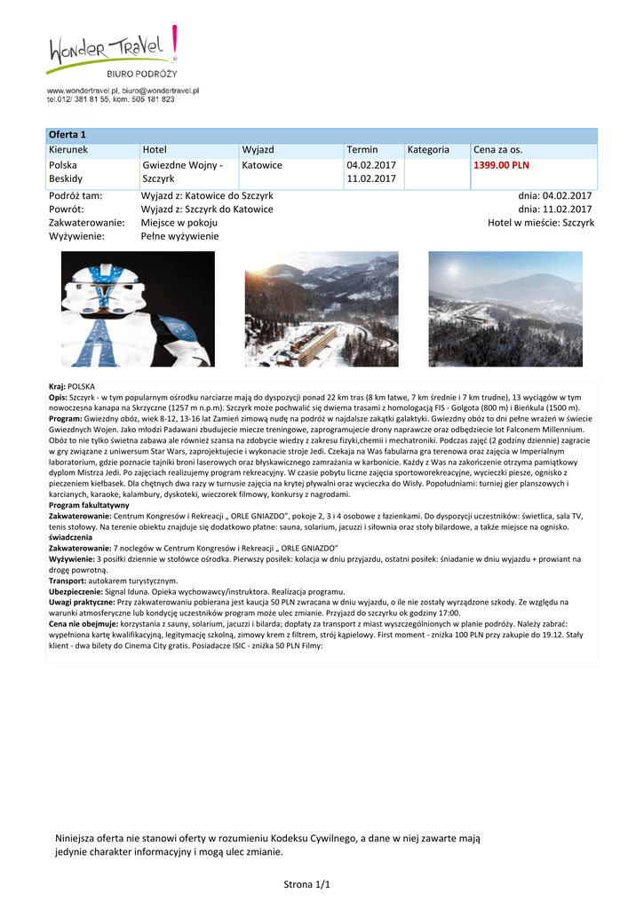 Oferta 1 Kierunek Polska Beskidy Hotel Gwiezdne Wojny Szczyrk Podróż tam: Powrót: Zakwaterowanie: Wyżywienie: Wyjazd z: Katowice do Szczyrk Wyjazd z: Szczyrk do Katowice Miejsce w pokoju Pełne wyżywienie Wyjazd Katowice Termin 04.02.2017 11.02.2017 Kategoria Cena za os. 1399.00 PLN dnia: 04.02.2017 dnia: 11.02.2017 Hotel w mieście: Szczyrk Kraj: POLSKA Opis: Szczyrk - w tym popularnym ośrodku narciarze mają do dyspozycji ponad 22 km tras (8 km łatwe, 7 km średnie i 7 km trudne), 13 wyciągów w tym nowoczesna kanapa na Skrzyczne (1257 m n.p.m). Szczyrk może pochwalić się dwiema trasami z homologacją FIS - Golgota (800 m) i Bieńkula (1500 m). Program: Gwiezdny obóz, wiek 8-12, 13-16 lat Zamień zimową nudę na podróż w najdalsze zakątki galaktyki. Gwiezdny obóz to dni pełne wrażeń w świecie Gwiezdnych Wojen. Jako młodzi Padawani zbudujecie miecze treningowe, zaprogramujecie drony naprawcze oraz odbędziecie lot Falconem Millennium. Obóz to nie tylko świetna zabawa ale również szansa na zdobycie wiedzy z zakresu fizyki,chemii i mechatroniki. Podczas zajęć (2 godziny dziennie) zagracie w gry związane z uniwersum Star Wars, zaprojektujecie i wykonacie stroje Jedi. Czekaja na Was fabularna gra terenowa oraz zajęcia w Imperialnym laboratorium, gdzie poznacie tajniki broni laserowych oraz błyskawicznego zamrażania w karbonicie. Każdy z Was na zakończenie otrzyma pamiątkowy dyplom Mistrza Jedi. Po zajęciach realizujemy program rekreacyjny. W czasie pobytu liczne zajęcia sportoworekreacyjne, wycieczki piesze, ognisko z pieczeniem kiełbasek. Dla chętnych dwa razy w turnusie zajęcia na krytej pływalni oraz wycieczka do Wisły. Popołudniami: turniej gier planszowych i karcianych, karaoke, kalambury, dyskoteki, wieczorek filmowy, konkursy z nagrodami. Program fakultatywny Zakwaterowanie: Centrum Kongresów i Rekreacji „ ORLE GNIAZDO”, pokoje 2, 3 i 4 osobowe z łazienkami. Do dyspozycji uczestników: świetlica, sala TV, tenis stołowy. Na terenie obiektu znajduje się dodatkowo płatne: sauna, solarium, jacuzzi i siłownia oraz stoły bilardowe, a także miejsce na ognisko. świadczenia Zakwaterowanie: 7 noclegów w Centrum Kongresów i Rekreacji „ ORLE GNIAZDO” Wyżywienie: 3 posiłki dziennie w stołówce ośrodka. Pierwszy posiłek: kolacja w dniu przyjazdu, ostatni posiłek: śniadanie w dniu wyjazdu + prowiant na drogę powrotną. Transport: autokarem turystycznym. Ubezpieczenie: Signal Iduna. Opieka wychowawcy/instruktora. Realizacja programu. Uwagi praktyczne: Przy zakwaterowaniu pobierana jest kaucja 50 PLN zwracana w dniu wyjazdu, o ile nie zostały wyrządzone szkody. Ze względu na warunki atmosferyczne lub kondycję uczestników program może ulec zmianie. Przyjazd do szczyrku ok godziny 17:00. Cena nie obejmuje: korzystania z sauny, solarium, jacuzzi i bilarda; dopłaty za transport z miast wyszczególnionych w planie podróży. Należy zabrać: wypełniona kartę kwalifikacyjną, legitymację szkolną, zimowy krem z filtrem, strój kąpielowy. First moment - zniżka 100 PLN przy zakupie do 19.12. Stały klient - dwa bilety do Cinema City gratis. Posiadacze ISIC - zniżka 50 PLN Filmy: Niniejsza oferta nie stanowi oferty w rozumieniu Kodeksu Cywilnego, a dane w niej zawarte mają jedynie charakter informacyjny i mogą ulec zmianie. Strona 1/1 Powered by TCPDF (www.tcpdf.org)