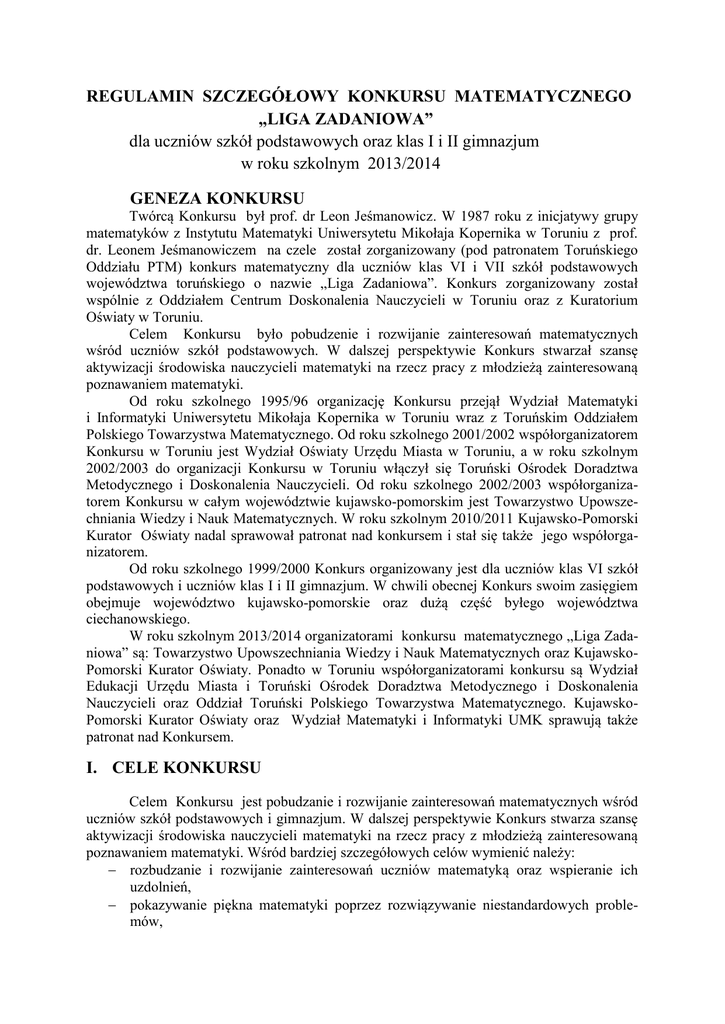 REGULAMIN SZCZEGÓŁOWY KONKURSU MATEMATYCZNEGO „LIGA ZADANIOWA” dla uczniów szkół podstawowych oraz klas I i II gimnazjum w roku szkolnym 2013/2014 GENEZA KONKURSU Twórcą Konkursu był prof. dr Leon Jeśmanowicz. W 1987 roku z inicjatywy grupy matematyków z Instytutu Matematyki Uniwersytetu Mikołaja Kopernika w Toruniu z prof. dr. Leonem Jeśmanowiczem na czele został zorganizowany (pod patronatem Toruńskiego Oddziału PTM) konkurs matematyczny dla uczniów klas VI i VII szkół podstawowych województwa toruńskiego o nazwie „Liga Zadaniowa”. Konkurs zorganizowany został wspólnie z Oddziałem Centrum Doskonalenia Nauczycieli w Toruniu oraz z Kuratorium Oświaty w Toruniu. Celem Konkursu było pobudzenie i rozwijanie zainteresowań matematycznych wśród uczniów szkół podstawowych. W dalszej perspektywie Konkurs stwarzał szansę aktywizacji środowiska nauczycieli matematyki na rzecz pracy z młodzieżą zainteresowaną poznawaniem matematyki. Od roku szkolnego 1995/96 organizację Konkursu przejął Wydział Matematyki i Informatyki Uniwersytetu Mikołaja Kopernika w Toruniu wraz z Toruńskim Oddziałem Polskiego Towarzystwa Matematycznego. Od roku szkolnego 2001/2002 współorganizatorem Konkursu w Toruniu jest Wydział Oświaty Urzędu Miasta w Toruniu, a w roku szkolnym 2002/2003 do organizacji Konkursu w Toruniu włączył się Toruński Ośrodek Doradztwa Metodycznego i Doskonalenia Nauczycieli. Od roku szkolnego 2002/2003 współorganizatorem Konkursu w całym województwie kujawsko-pomorskim jest Towarzystwo Upowszechniania Wiedzy i Nauk Matematycznych. W roku szkolnym 2010/2011 Kujawsko-Pomorski Kurator Oświaty nadal sprawował patronat nad konkursem i stał się także jego współorganizatorem. Od roku szkolnego 1999/2000 Konkurs organizowany jest dla uczniów klas VI szkół podstawowych i uczniów klas I i II gimnazjum. W chwili obecnej Konkurs swoim zasięgiem obejmuje województwo kujawsko-pomorskie oraz dużą część byłego województwa ciechanowskiego. W roku szkolnym 2013/2014 organizatorami konkursu matematycznego „Liga Zadaniowa” są: Towarzystwo Upowszechniania Wiedzy i Nauk Matematycznych oraz KujawskoPomorski Kurator Oświaty. Ponadto w Toruniu współorganizatorami konkursu są Wydział Edukacji Urzędu Miasta i Toruński Ośrodek Doradztwa Metodycznego i Doskonalenia Nauczycieli oraz Oddział Toruński Polskiego Towarzystwa Matematycznego. KujawskoPomorski Kurator Oświaty oraz Wydział Matematyki i Informatyki UMK sprawują także patronat nad Konkursem. I. CELE KONKURSU Celem Konkursu jest pobudzanie i rozwijanie zainteresowań matematycznych wśród uczniów szkół podstawowych i gimnazjum. W dalszej perspektywie Konkurs stwarza szansę aktywizacji środowiska nauczycieli matematyki na rzecz pracy z młodzieżą zainteresowaną poznawaniem matematyki. Wśród bardziej szczegółowych celów wymienić należy: rozbudzanie i rozwijanie zainteresowań uczniów matematyką oraz wspieranie ich uzdolnień, pokazywanie piękna matematyki poprzez rozwiązywanie niestandardowych problemów, promowanie osiągnięć uczniów, ich nauczycieli i szkół, motywowanie szkół do podejmowania różnorodnych działań w pracy z uczniem zainteresowanym matematyką, promowanie wartości pracy nad rozwojem swoich uzdolnień, stwarzanie sytuacji pobudzających uczniów do twórczego myślenia. II. ORGANIZACJA I PRZEBIEG KONKURSU 1. Konkurs na terenie województwa kujawsko-pomorskiego organizuje Komitet Organizacyjny powołany przez Dziekana Wydziału Matematyki i Informatyki Uniwersytetu Mikołaja Kopernika w Toruniu. Skład Komitetu Organizacyjnego zawarty jest w załączniku nr 1 do niniejszego regulaminu. 2. Organizacja konkursu odbywa się z wykorzystaniem portalu o nazwie „Liga Zadaniowa”. Informacje o przebiegu konkursu i podstawowych dokumentach zamieszczane są na stronie internetowej Wydziału Matematyki i Informatyki UMK, w tym: regulamin konkursu, tematyka zadań na poszczególnych poziomach i na kolejne spotkania , zadania przygotowawcze do poszczególnych spotkań, archiwum zadań z lat poprzednich oraz aktualne informacje. 3. Konkurs jest trzyetapowy i składa się z etapu szkolnego i pięciu spotkań rozłożonych równomiernie w ciągu roku szkolnego. 4. Etap pierwszy – szkolny polega na przeprowadzeniu konkursu w szkołach w oparciu o dostarczone przez organizatorów konkursu propozycje zadań konkursowych: test dla klasy VI oraz zadania ćwiczenia dla klas I i II gimnazjum. Szkoły mogą przeprowadzić etap szkolny w oparciu o własne zadania. Etap szkolny powinien odbyć się do 31.10.2013 r. Szkoły zgłaszają uczniów do udziału w konkursie na etapie rejonowym. Ostateczny termin zgłoszeń upływa dnia 06.11.2013 r. Zgłoszenia należy przesyłać na adres przewodniczącego odpowiedniego Komitetu Rejonowego konkursu (nazwiska i adresy przewodniczących Komitetów Rejonowych podane są w załączniku nr 2 do niniejszego regulaminu). Jednocześnie szkolni opiekunowie Konkursu powinni dokonać rejestracji zgłoszonych uczniów na stronach portalu „Liga Zadaniowa” w podobny sposób jak w poprzedniej edycji konkursu. Opiekunowie szkolni ze szkół startujących po raz pierwszy w konkursie w celu dokonania rejestracji na portalu powinni skontaktować się z organizatorem regionalnym (adresy Komitetów Rejonowych podane są w załączniku nr 2 do niniejszego regulaminu). Komitet Organizacyjny może dopuścić do etapu rejonowego także uczniów ze szkół, w których nie przeprowadzono etapu pierwszego. Prawo wyrażenia zgody na udział w konkursie dla uczniów, którzy nie zostali zgłoszeni przez szkołę, mają przewodniczący Komitetów Rejonowych. Etap drugi – rejonowy składa się z trzech oddzielnych spotkań konkursowych. W roku szkolnym 2013/2014 terminy spotkań etapu rejonowego są następujące: 16.11.2013 r, 11.01.2014 r.– wszystkie terminy wspólne dla szkół podstawowych i gimnazjum, natomiast trzecie s