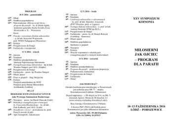 PROGRAM 12 X 2016 – środa 10 X 2016 – poniedziałek 7 – Jutrznia 800 – Śniadanie 900 – Celebracja miłosierdzia w sakramentach – ks. prof. dr hab. Stanisław Araszczuk (PWT Wrocław, prob. w Legnicy) 1030 – Teologia diakonii miłosierdzia – o. prof. dr hab. Andrzej Derdziuk OFMCap (KUL) 1145 – Przygotowanie do liturgii 1200 – Eucharystia – przew. ks. dr Henryk Bolczyk (Carlsberg – Katowice) 1330 – Obiad, spacer 1600 – Modlitwa popołudniowa Spotkania w grupach 00 18 – Nieszpory 1830 – Kolacja 1930 – Wieczór wspomnień o rekolekcjach ewangelizacyjnych w różnych środowiskach 13 – Obiad 1500 – Modlitwa popołudniowa 1515 – Wprowadzenie: Miłosierni jak Ojciec – program dla parafii – ks. dr Marek Sędek, moderator generalny Ruchu Światło-Życie (Krościenko n. D. – Warszawa) Kawa 1700 – Prawda i wyzwolenie dziełem miłosierdzia – p. dr hab. Krzysztof Wojcieszek, prof. WSNS Pedagogium (Warszawa) 1830 – Kolacja 1915 – Przygotowanie do liturgii 1930 – Eucharystia z nieszporami 30 11 X 2016 – wtorek 730 – Jutrznia 800 – Śniadanie 900 – Modlitwa przedpołudniowa Adoracja Najświętszego Sakramentu 1030 – Ewangelizacja misją miłosierdzia – bp dr hab. Wiesław Śmigiel, prof. KUL (Pelplin) 1145 – Przygotowanie do liturgii 1200 – Eucharystia – przew. bp Wiesław Śmigiel 1330 – Obiad, spacer 1530 – Praca w grupach – krąg liturgiczny 1700 – Kolacja Przejazd samochodami do WSD Przejście przez Bramę Miłosierdzia Archikatedry Łódzkiej 40 LAT REKOLEKCJI EWANGELIZACYJNYCH Aula Wyższego Seminarium Duchownego 1800 – Nieszpory – przew. bp Marek Marczak (Łódź) 1830 – Rekolekcje ewangelizacyjne w koncepcji ks. Franciszka Blachnickiego – ks. dr hab. Piotr Kulbacki, prof. KUL (Łódź) 1900 – Świadkowie i owoce – prowadzenie ks. prob. Paweł Lisowski (Łódź) 2100 – Apel Jasnogórski. Zakończenie 30 13 X 2016 – czwartek 7 – Jutrznia 800 – Śniadanie 845 – Modlitwa przedpołudniowa 900 – Program dla parafii – praktyczne propozycje. Podsumowanie, komunikaty 1030 – Przygotowanie do liturgii 1045 – Eucharystia 1145 – Obiad 30 XXV SYMPOZJUM KOINONIA MIŁOSIERNI JAK OJCIEC – PROGRAM DLA PARAFII JAK DOJECHAĆ? Ośrodek konferencyjno-rekolekcyjny w Porszewicach jest położony przy DK 71 – między Konstantynowem Łódzkim i Pabianicami. Dojazd najprostszy – z S8 skręcić na S14 i na DK 71 (kierunek Zgierz). Można do S8 dojechać A1 (nowo otwartą wschodnią obwodnicą Łodzi). Busy kursują z Konstantynowa i Pabianic. Z dworca PKP i PKS Łódź Kaliska przez Konstantynów jest tylko kilkanaście kilometrów. Adres: Porszewice 24C, 95-200 Pabianice GPS: 51.720954, 19.297517 10–13 PAŹDZIERNIKA 2016 ŁÓDŹ – PORSZEWICE XXV SYMPOZJUM KOINONIA ORGANIZUJĄ: o Ruch Światło-Życie o Instytut Formacji Pastoralno-Liturgicznej (KUL) o Instytut Liturgiki i Homiletyki KUL o Stowarzyszenie „Diakonia Ruchu Światło-Życie” o Stowarzyszenie „Unia Kapłanów Chrystusa Sługi” Sympozja Koinonia, odbywające się od 1977 roku z inicjatywy czcigodnego sługi Bożego ks. Franciszka Blachnickiego, popularyzują posoborowy model parafii oparty na jej wymiarze ewangelizacyjno-inicjacyjnym. Model ten stanowi ważny punkt wyjścia dla podejmowania przez parafię wezwania do nowej ewangelizacji. Sympozja podejmują te zagadnienia zarówno na płaszczyźnie refleksji naukowej, jak i konfrontacji z już istniejącymi doświadczeniami wielu środowisk eklezjalnych. Spotkania mają na celu wspieranie rozwoju posługiwania osób świeckich i duchownych zaangażowanych w odnowę parafii, a przede wszystkim proboszczów (obecnych i przyszłych). Ogłoszony przez papieża Franciszka Nadzwyczajny Jubileusz Miłosierdzia stanowi wezwanie dla całego Kościoła, by uczynić świadectwo wierzących jeszcze mocniejszym i skuteczniejszym (MV 3). Dokładnie w pięćdziesiątą rocznicę zakończenia Vaticanum II – 8 grudnia 2015 roku nastąpiła inauguracja Jubileuszu poprzez otwarcie Drzwi Świętych. Gest ten przywołuje pamięć o Soborze, który dał impulsy do rozpoczęcia wielkiej odnowy Kościoła. W programowej bulli Miserocoridiae Vultus papież wskazał, iż „Ojcowie zgromadzeni na Soborze czuli potrzebę, silną jak prawdziwy powiew Ducha Świętego, mówienia o Bogu do ludzi ich czasów w sposób bardziej zrozumiały. Po rozbiciu murów, które przez zbyt długi czas trzymały Kościół w zamknięciu jak w uprzywilejowanej cytadeli, nadszedł czas na głoszenie Ewangelii w nowy sposób. Nowy etap ewangelizacji, która trwa od zawsze. Nowe zaangażowanie dla wszystkich chrześcijan, aby świadczyć z większym entuzjazmem i przekonaniem o swojej wierze. Kościół czuł odpowiedzialność za bycie w świecie żywym znakiem miłości Ojca” (MV 4). Wobec wyzwań dzisiejszego świata słowa papieża Franciszka przynaglają nas do pogłębienia naszego zaangażowania w budowanie żywego Kościoła. Jego szczególnym znakiem jest Kościół lokalny, a w nim parafia. Stanowi ona podstawową wspólnotę (koinonia), w której aktualizuje się Kościół partykularny – nawet jeśli mówimy dziś o eklezjalnym charakterze wspólnot nie stanowiących parafii. W niej dokonuje się głoszenie słowa (martyria), sprawowanie sakramentów (leiturgia) i posługa miłości (diakonia). Te trzy wymiary Kościoła stanowią miejsce szczególnego doświadczenia miłosierdzia Bożego. Dlatego podczas Sympozjum Koinonia zostaną podjęte zagadnienia związane z ewangelizacją jako realizacją eklezjalnej misji miłosierdzia, urzeczywistnianiem miłosierdzia poprzez celebrację sakramentów oraz teologią posługi miłosierdzia. Czcigodny Sługa Boży ks. Franciszek Blachnicki podkreślał, iż ewangelizacja tylko wtedy staje się owocna, tylko wtedy prowadzi ludzi do Jezusa Chrystusa, gdy proklamuje słowem i świadectwem życia Jego orędzie stanowiące odpowiedź na podstawowe pytania człowieka oczeku