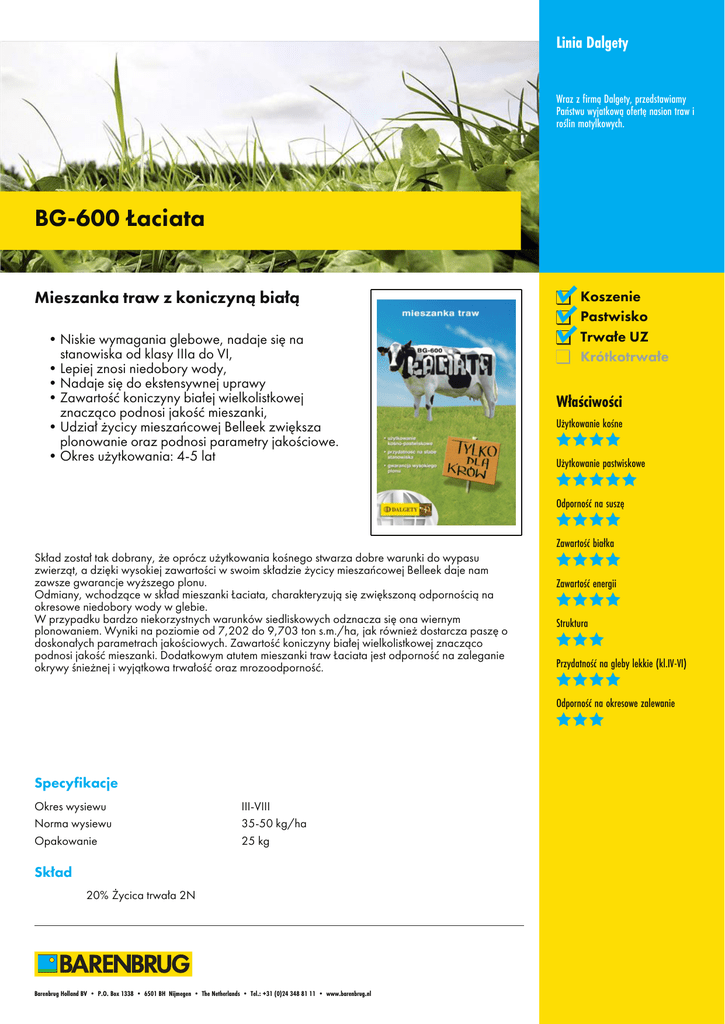 Linia Dalgety Wraz z firmą Dalgety, przedstawiamy Państwu wyjatkową ofertę nasion traw i roślin motylkowych. BG-600 Łaciata Mieszanka traw z koniczyną białą •Niskie wymagania glebowe, nadaje się na stanowiska od klasy IIIa do VI, •Lepiej znosi niedobory wody, •Nadaje się do ekstensywnej uprawy •Zawartość koniczyny białej wielkolistkowej znacząco podnosi jakość mieszanki, •Udział życicy mieszańcowej Belleek zwiększa plonowanie oraz podnosi parametry jakościowe. •Okres użytkowania: 4-5 lat Koszenie Pastwisko Trwałe UZ Krótkotrwałe Właściwości Użytkowanie kośne Użytkowanie pastwiskowe Odporność na suszę Zawartość białka Skład został tak dobrany, że oprócz użytkowania kośnego stwarza dobre warunki do wypasu zwierząt, a dzięki wysokiej zawartości w swoim składzie życicy mieszańcowej Belleek daje nam zawsze gwarancje wyższego plonu. Odmiany, wchodzące w skład mieszanki Łaciata, charakteryzują się zwiększoną odpornością na okresowe niedobory wody w glebie. W przypadku bardzo niekorzystnych warunków siedliskowych odznacza się ona wiernym plonowaniem. Wyniki na poziomie od 7,202 do 9,703 ton s.m./ha, jak również dostarcza paszę o doskonałych parametrach jakościowych. Zawartość koniczyny białej wielkolistkowej znacząco podnosi jakość mieszanki. Dodatkowym atutem mieszanki traw Łaciata jest odporność na zaleganie okrywy śnieżnej i wyjątkowa trwałość oraz mrozoodporność. Specyfikacje Okres wysiewu Norma wysiewu Opakowanie III-VIII 35-50 kg/ha 25 kg Skład 20% Życica trwała 2N Barenbrug Holland BV • P.O. Box 1338 • 6501 BH Nijmegen • The Netherlands • Tel.: +31 (0)24 348 81 11 • www.barenbrug.nl Zawartość energii Struktura Przydatność na gleby lekkie (kl.IV-VI) Odporność na okresowe zalewanie Linia Dalgety 15% Życica mieszańcowa 2N 20% Życica mieszańcowa 4N BELLEEK 15% Kostrzewa łąkowa 15% Tymotka łąkowa 10% Koniczyna biała ALICE 5% Kostrzewa trzcinowa Wraz z firmą Dalgety, przedstawiamy Państwu wyjatkową ofertę nasion traw i roślin motylkowych. Koszenie Pastwisko Trwałe UZ Krótkotrwałe Właściwości Użytkowanie kośne Użytkowanie pastwiskowe Odporność na suszę Zawartość białka Zawartość energii Struktura Przydatność na gleby lekkie (kl.IV-VI) Odporność na okresowe zalewanie Barenbrug Holland BV • P.O. Box 1338 • 6501 BH Nijmegen • The Netherlands • Tel.: +31 (0)24 348 81 11 • www.barenbrug.nl