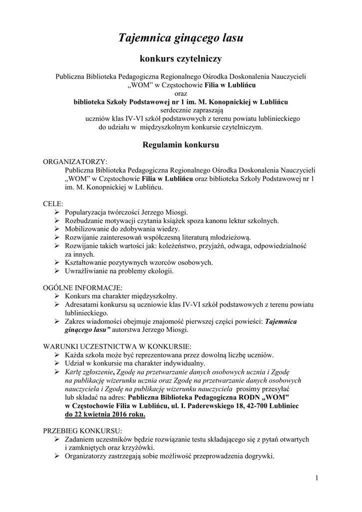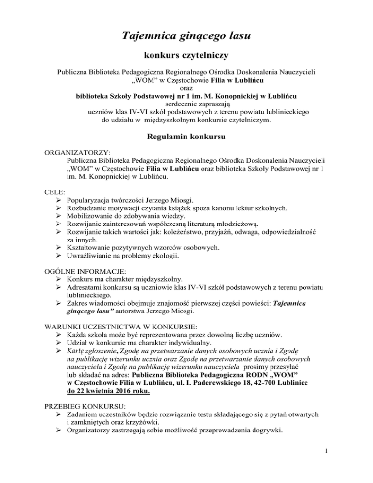 Tajemnica ginącego lasu konkurs czytelniczy Publiczna Biblioteka Pedagogiczna Regionalnego Ośrodka Doskonalenia Nauczycieli „WOM” w Częstochowie Filia w Lublińcu oraz biblioteka Szkoły Podstawowej nr 1 im. M. Konopnickiej w Lublińcu serdecznie zapraszają uczniów klas IV-VI szkół podstawowych z terenu powiatu lublinieckiego do udziału w międzyszkolnym konkursie czytelniczym. Regulamin konkursu ORGANIZATORZY: Publiczna Biblioteka Pedagogiczna Regionalnego Ośrodka Doskonalenia Nauczycieli „WOM” w Częstochowie Filia w Lublińcu oraz biblioteka Szkoły Podstawowej nr 1 im. M. Konopnickiej w Lublińcu. CELE: Popularyzacja twórczości Jerzego Miosgi. Rozbudzanie motywacji czytania książek spoza kanonu lektur szkolnych. Mobilizowanie do zdobywania wiedzy. Rozwijanie zainteresowań współczesną literaturą młodzieżową. Rozwijanie takich wartości jak: koleżeństwo, przyjaźń, odwaga, odpowiedzialność za innych. Kształtowanie pozytywnych wzorców osobowych. Uwrażliwianie na problemy ekologii. OGÓLNE INFORMACJE: Konkurs ma charakter międzyszkolny. Adresatami konkursu są uczniowie klas IV-VI szkół podstawowych z terenu powiatu lublinieckiego. Zakres wiadomości obejmuje znajomość pierwszej części powieści: Tajemnica ginącego lasu” autorstwa Jerzego Miosgi. WARUNKI UCZESTNICTWA W KONKURSIE: Każda szkoła może być reprezentowana przez dowolną liczbę uczniów. Udział w konkursie ma charakter indywidualny. Kartę zgłoszenie, Zgodę na przetwarzanie danych osobowych ucznia i Zgodę na publikację wizerunku ucznia oraz Zgodę na przetwarzanie danych osobowych nauczyciela i Zgodę na publikację wizerunku nauczyciela prosimy przesyłać lub składać na adres: Publiczna Biblioteka Pedagogiczna RODN „WOM” w Częstochowie Filia w Lublińcu, ul. I. Paderewskiego 18, 42-700 Lubliniec do 22 kwietnia 2016 roku. PRZEBIEG KONKURSU: Zadaniem uczestników będzie rozwiązanie testu składającego się z pytań otwartych i zamkniętych oraz krzyżówki. Organizatorzy zastrzegają sobie możliwość przeprowadzenia dogrywki. 1 OCENA PRAC: Komisja konkursowa dokona oceny prac. Oceniana będzie poprawność treści i pisowni uzyskanych odpowiedzi. OGŁOSZENIE WYNIKÓW I WRĘCZENIE NAGRÓD: Wyniki konkursu zostaną ogłoszone bezpośrednio po dokonaniu oceny prac. Dla zwycięzców przewidziano nagrody. TERMIN I MIEJSCE: Konkurs odbędzie się 6 maja 2016 roku o godzinie 10.30 w Szkole Podstawowej nr 1 im. M. Konopnickiej w Lublińcu, ul. Sądowa 9, 42-700 Lubliniec. PLIKI DO POBRANIA: Karta zgłoszenia Zgoda na przetwarzanie danych osobowych nauczyciela i Zgoda na publikację wizerunku nauczyciela Zgoda na przetwarzanie danych osobowych ucznia i Zgoda na publikację wizerunku ucznia Plakat KONTAKT: Małgorzata Goinda, e-mail: [email protected], tel. 34 351 17 98 Anna Bidzińska-Kristof, e-mail: [email protected], tel. 34 351 17 98 Olimpia Zielińska, e-mail: [email protected], tel. 34 351 17 98 Serdecznie zapraszamy! 2