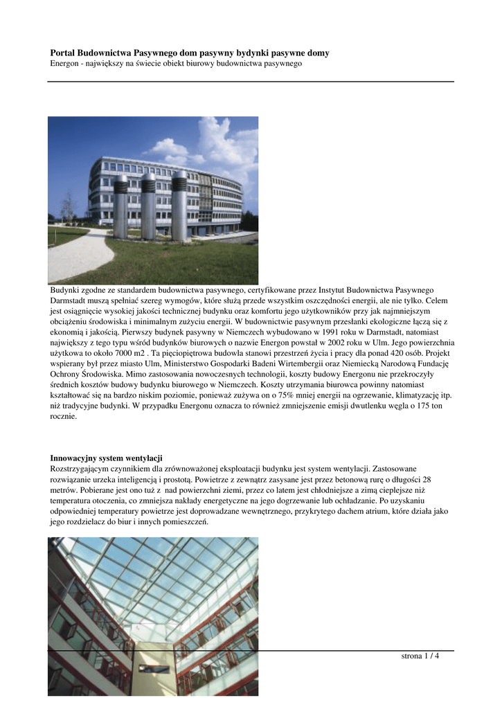 Portal Budownictwa Pasywnego dom pasywny bydynki pasywne domy Energon - największy na świecie obiekt biurowy budownictwa pasywnego Budynki zgodne ze standardem budownictwa pasywnego, certyfikowane przez Instytut Budownictwa Pasywnego Darmstadt muszą spełniać szereg wymogów, które służą przede wszystkim oszczędności energii, ale nie tylko. Celem jest osiągnięcie wysokiej jakości technicznej budynku oraz komfortu jego użytkowników przy jak najmniejszym obciążeniu środowiska i minimalnym zużyciu energii. W budownictwie pasywnym przesłanki ekologiczne łączą się z ekonomią i jakością. Pierwszy budynek pasywny w Niemczech wybudowano w 1991 roku w Darmstadt, natomiast największy z tego typu wśród budynków biurowych o nazwie Energon powstał w 2002 roku w Ulm. Jego powierzchnia użytkowa to około 7000 m2 . Ta pięciopiętrowa budowla stanowi przestrzeń życia i pracy dla ponad 420 osób. Projekt wspierany był przez miasto Ulm, Ministerstwo Gospodarki Badeni Wirtembergii oraz Niemiecką Narodową Fundację Ochrony Środowiska. Mimo zastosowania nowoczesnych technologii, koszty budowy Energonu nie przekroczyły średnich kosztów budowy budynku biurowego w Niemczech. Koszty utrzymania biurowca powinny natomiast kształtować się na bardzo niskim poziomie, ponieważ zużywa on o 75% mniej energii na ogrzewanie, klimatyzację itp. niż tradycyjne budynki. W przypadku Energonu oznacza to również zmniejszenie emisji dwutlenku węgla o 175 ton rocznie. Innowacyjny system wentylacji Rozstrzygającym czynnikiem dla zrównoważonej eksploatacji budynku jest system wentylacji. Zastosowane rozwiązanie urzeka inteligencją i prostotą. Powietrze z zewnątrz zasysane jest przez betonową rurę o długości 28 metrów. Pobierane jest ono tuż z nad powierzchni ziemi, przez co latem jest chłodniejsze a zimą cieplejsze niż temperatura otoczenia, co zmniejsza nakłady energetyczne na jego dogrzewanie lub ochładzanie. Po uzyskaniu odpowiedniej temperatury powietrze jest doprowadzane wewnętrznego, przykrytego dachem atrium, które działa jako jego rozdzielacz do biur i innych pomieszczeń. strona 1 / 4 Portal Budownictwa Pasywnego dom pasywny bydynki pasywne domy Energon - największy na świecie obiekt biurowy budownictwa pasywnego Komfortowa klimatyzacja Inteligentna regulacja klimatyzacji umożliwia stałe utrzymanie komfortowej temperatury. W stropach pięter wmurowanych zostało 350 rur z tworzywa sztucznego, przez które przepływa zimna lub ciepła woda. Działają one więc jak wielkopowierzchniowa klimatyzacja. W razie potrzeby dodatkowe zimno dostarczane jest przez 40 sond wpuszczonych w ziemię naokoło budynku i sięgających do 100 metrów w głąb. Ziemia odbiera nadwyżki ciepła z budynku i zachowuje je, aby gdy to potrzebne oddać do wstępnego ogrzania powietrza. Jest to efektywny magazyn energii funkcjonujący w obu kierunkach. Optymalny udział powierzchni szklanych Wychłodzenie i nagrzanie budynku związane ze zmianami nasłonecznienia i temperatury otoczenia musi być wyrównane przez wymagające wysokich nakładów energetycznych systemy klimatyzacji. Fasada Energonu odznacza się optymalnym, 44- procentowym udziałem powierzchni szklanych aby zminimalizować nakłady na klimatyzację. Dzięki takiemu układowi zwiększa się również widoczność. Przed zbyt dużym nasłoneczeniem chronią sterowane mechanicznie, każda z osobna, zewnętrzne żaluzje. Skuteczna izolacja Elewacja budynku prawie zupełnie nie przewodzi ciepła. Taki efekt uzyskano dzięki 35 centymetrom warstwy izolującej w fasadzie budynku, 20 cm pod płytą fundamentową i aż do 50 cm na dachu. Wysokie właściwości izolacyjne mają również nowoczesne okna z potrójnymi szybami. Inteligentne oświetlenie i zaopatrzenie w prąd Inteligentna koncepcja oświetlenia jest kluczowa w dążeniach do minimalizacji zużycia prądu. strona 2 / 4 Portal Budownictwa Pasywnego dom pasywny bydynki pasywne domy Energon - największy na świecie obiekt biurowy budownictwa pasywnego Ogromny szklany dach atrium dostarcza wystarczającą ilość światła dziennego do leżących wewnątrz pomieszczeń, tak aby zminimalizować wykorzystanie sztucznego oświetlenia. Biorąc pod uwagę sytuacje, w których sztuczne oświetlenie jest konieczne, biura wyposażono w elektronicznie przyciemniane lampy, zapalane lub regulowane na podstawie wyników pomiaru luxów - w zależności od natężenia światła dziennego. Czujniki ruchu również wpływają na zmniejszenie zużycia prądu, przy braku aktywności w pomieszczeniu oświetlenie jest automatycznie wyłączane .Oprócz tego Energon posiada ogniwa fotowoltaiczne o powierzchni 328 m2, zainstalowane na dachu z wyłączeniem atrium. W rezultacie uzyskuje się 12000 kWh rocznie. Do tego dochodzi ogromna instalacja fotowoltaiczna na dachu wielopiętrowego garażu – 125000 kWh rocznie, pozyskiwana w ten sposób energia elektryczna przewyższa potrzeby Energonu ,więc sprzedawana jest jako prąd ekologiczny. Elektroniczne sterowanie Nowoczesna instalacja odpowiedzialna jest za nadzorowanie i regulowanie pozostałych urządzeń obsługujących budynek. Temperatura i jakość powietrza w atrium są stale mierzone i optymalizowane poprzez odpowiednie ustawiania parametrów wentylatora i klap doprowadzających powietrze. Więcej przestrzeni Energon został wybudowany na działce o powierzchni 12000 m2 i zajmuje około 1/3 tej powierzchni. Położony jest w środku parku krajobrazowego i otoczony zbiornikami wodnymi, stawami zbierającymi wody deszczowe, tarasami, mostkami, skarpami oraz innymi różnorodnymi formami rzeźby terenu. To wszystko stwarza wyjątkową atmosferę. Również wewnątrz budynku królują otwarte przestrzenie. Kasyno, kuchnia i powierzchnie seminaryjne ułożone są naokoło piazzy w atrium.Na pozostałych piętrach przygotowane zostały sale seminaryjne i punkty spotkań. Na komfort użytkowania budynku wpływa również zastosowa