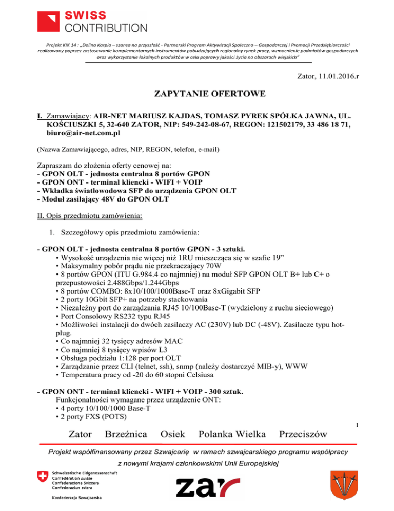 Projekt KIK 14 : „Dolina Karpia – szansa na przyszłość - Partnerski Program Aktywizacji Społeczno – Gospodarczej i Promocji Przedsiębiorczości realizowany poprzez zastosowanie komplementarnych instrumentów pobudzających regionalny rynek pracy, wzmocnienie podmiotów gospodarczych oraz wykorzystanie lokalnych produktów w celu poprawy jakości życia na obszarach wiejskich” Zator, 11.01.2016.r ZAPYTANIE OFERTOWE I. Zamawiający: AIR-NET MARIUSZ KAJDAS, TOMASZ PYREK SPÓŁKA JAWNA, UL. KOŚCIUSZKI 5, 32-640 ZATOR, NIP: 549-242-08-67, REGON: 121502179, 33 486 18 71, [email protected] (Nazwa Zamawiającego, adres, NIP, REGON, telefon, e-mail) Zapraszam do złożenia oferty cenowej na: - GPON OLT - jednosta centralna 8 portów GPON - GPON ONT - terminal kliencki - WIFI + VOIP - Wkładka światłowodowa SFP do urządzenia GPON OLT - Moduł zasilający 48V do GPON OLT II. Opis przedmiotu zamówienia: 1. Szczegółowy opis przedmiotu zamówienia: - GPON OLT - jednosta centralna 8 portów GPON - 3 sztuki. • Wysokość urządzenia nie więcej niż 1RU mieszcząca się w szafie 19” • Maksymalny pobór prądu nie przekraczający 70W • 8 portów GPON (ITU G.984.4 co najmniej) na moduł SFP GPON OLT B+ lub C+ o przepustowości 2.488Gbps/1.244Gbps • 8 portów COMBO: 8x10/100/1000Base-T oraz 8xGigabit SFP • 2 porty 10Gbit SFP+ na potrzeby stackowania • Niezależny port do zarządzania RJ45 10/100Base-T (wydzielony z ruchu sieciowego) • Port Consolowy RS232 typu RJ45 • Możliwości instalacji do dwóch zasilaczy AC (230V) lub DC (-48V). Zasilacze typu hotplug. • Co najmniej 32 tysięcy adresów MAC • Co najmniej 8 tysięcy wpisów L3 • Obsługa podziału 1:128 per port OLT • Zarządzanie przez CLI (telnet, ssh), snmp (należy dostarczyć MIB-y), WWW • Temperatura pracy od -20 do 60 stopni Celsiusa - GPON ONT - terminal kliencki - WIFI + VOIP - 300 sztuk. Funkcjonalności wymagane przez urządzenie ONT: • 4 porty 10/100/1000 Base-T • 2 porty FXS (POTS) 1 Zator Brzeźnica Osiek Polanka Wielka Przeciszów Projekt współfinansowany przez Szwajcarię w ramach szwajcarskiego programu współpracy z nowymi krajami członkowskimi Unii Europejskiej Projekt KIK 14 : „Dolina Karpia – szansa na przyszłość - Partnerski Program Aktywizacji Społeczno – Gospodarczej i Promocji Przedsiębiorczości realizowany poprzez zastosowanie komplementarnych instrumentów pobudzających regionalny rynek pracy, wzmocnienie podmiotów gospodarczych oraz wykorzystanie lokalnych produktów w celu poprawy jakości życia na obszarach wiejskich” • WiFi 2x2 (300Mb/s) dla 802.11n • 2 zewnętrzne anteny minimum 5dB • Dwa loginy i hasła (operator i abonent) • Polski interfejs użytkownika na WWW • Możliwości wgrania do 2 wersji oprogramowania na ONT (1 aktywna, 1 standby) • Monitoring sygnału (1490nm) odbieranego przez ONT oraz nadawanego przez ONT (1310nm) • Możliwość sprawdzenia jakie grupy multicastowe są oglądane oraz na którym porcie LAN • Podgląd statusu portów (prędkość, tryb negocjacji, włączony/wyłączony administracyjnie/z braku podłączonego urządzenia) • Podgląd aktywnych adresów MAC na ONT oraz na poszczególnych portach na ONT • Wsparcie dla powiadamiania o błędach zdefiniowanych w G.984.3 • Możliwość podglądnięcia czasu pracy urządzenia od ostatniego restartu oraz od czasu połączenia z siecią PON • Możliwość sprawdzenia z jaką mocą nadają urządzenia ONT w kierunku OLT • Możliwość sprawdzenia obciążenia procesora na ONT • Możliwość sprawdzenia statusu bramki VoIP (wynegocjowany kodek, status portu) • Wsparcie dla IGMP Snooping v1/v2/v3 • Wsparcie dla dwóch interfejsów IP (jeden dla NAT drugi dla bramki VoIP) • Możliwość dowolnej konfiguracji portów LAN (tryb NAT lub Bridge) • Wsparcie dla 12 aktywnych VLAN-ów • Wsparcie Q-in-Q • Zasilanie AC 100~230V - Wkładka światłowodowa SFP do urządzenia GPON OLT - 24 sztuki. - Moduł zasilający 48V do GPON OLT - 3 sztuki. III. Termin realizacji całości zamówienia: 29.02.2016 IV. Ofertę należy złożyć na formularzu ofertowym według załączonego wzoru - załącznik nr 1 i dostarczyć osobiście lub za pośrednictwem poczty tradycyjnej lub pocztą elektroniczną na podane w punkcie I adresy. V. Nieprzekraczalny termin przedstawienia oferty cenowej do 29.01.2016r. do godz. 15:00 decyduje data wpływu. VI. Wybór oferty nastąpi w oparciu kryterium: cena VII. Oferta najkorzystniejsza będzie podlegała dodatkowo negocjacjom cenowym. VIII. W razie wątpliwości i potrzeby uszczegółowienia zapytania, informacje można uzyskać pod numerem tel. IX. Załączniki : wzór formularza ofertowego. 2 Zator Brzeźnica Osiek Polanka Wielka Przeciszów Projekt współfinansowany przez Szwajcarię w ramach szwajcarskiego programu współpracy z nowymi krajami członkowskimi Unii Europejskiej Projekt KIK 14 : „Dolina Karpia – szansa na przyszłość - Partnerski Program Aktywizacji Społeczno – Gospodarczej i Promocji Przedsiębiorczości realizowany poprzez zastosowanie komplementarnych instrumentów pobudzających regionalny rynek pracy, wzmocnienie podmiotów gospodarczych oraz wykorzystanie lokalnych produktów w celu poprawy jakości życia na obszarach wiejskich” Pieczątka i podpis FORMULARZ OFERTOWY Zamawiający: AIR-NET MARIUSZ KAJDAS, TOMASZ PYREK SPÓŁKA JAWNA, UL. KOŚCIUSZKI 5, 32-640 ZATOR, NIP: 549-242-08-67, REGON: 121502179, 33 486 18 71, [email protected] (Nazwa Zamawiającego, adres, NIP, REGON, telefon, e-mail) 1. Nazwa i adres Wykonawcy ................................................................................................................. .................................................................................................................................................................. ........................................................................................................