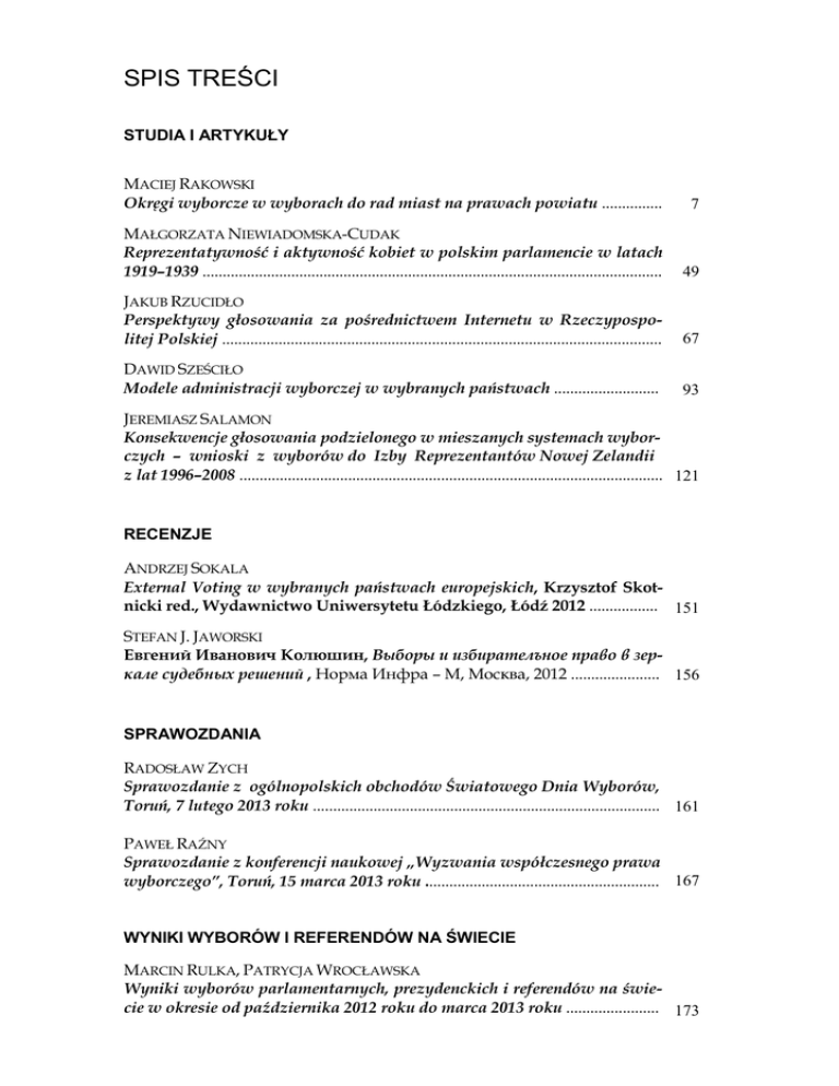 SPIS TREŚCI STUDIA I ARTYKUŁY MACIEJ RAKOWSKI Okręgi wyborcze w wyborach do rad miast na prawach powiatu ............... 7 MAŁGORZATA NIEWIADOMSKA-CUDAK Reprezentatywność i aktywność kobiet w polskim parlamencie w latach 1919–1939 .................................................................................................................. 49 JAKUB RZUCIDŁO Perspektywy głosowania za pośrednictwem Internetu w Rzeczypospolitej Polskiej ............................................................................................................. 67 DAWID SZEŚCIŁO Modele administracji wyborczej w wybranych państwach .......................... 93 JEREMIASZ SALAMON Konsekwencje głosowania podzielonego w mieszanych systemach wyborczych – wnioski z wyborów do Izby Reprezentantów Nowej Zelandii z lat 1996–2008 ......................................................................................................... 121 RECENZJE ANDRZEJ SOKALA External Voting w wybranych państwach europejskich, Krzysztof Skotnicki red., Wydawnictwo Uniwersytetu Łódzkiego, Łódź 2012 ................. 151 STEFAN J. JAWORSKI Eвгений Иванович Колюшин, Выборы и избирателъное право в зеркале судебных решений , Норма Инфра – М, Москва, 2012 ...................... 156 SPRAWOZDANIA RADOSŁAW ZYCH Sprawozdanie z ogólnopolskich obchodów Światowego Dnia Wyborów, Toruń, 7 lutego 2013 roku ...................................................................................... 161 PAWEŁ RAŹNY Sprawozdanie z konferencji naukowej „Wyzwania współczesnego prawa wyborczego”, Toruń, 15 marca 2013 roku .......................................................... 167 WYNIKI WYBORÓW I REFERENDÓW NA ŚWIECIE MARCIN RULKA, PATRYCJA WROCŁAWSKA Wyniki wyborów parlamentarnych, prezydenckich i referendów na świecie w okresie od października 2012 roku do marca 2013 roku ....................... 173 Maciej Rakowski Dr, Katedra Powszechnej Historii Państwa i Prawa, Wydział Prawa i Administracji, Uniwersytet Łódzki, POLAND, [email protected] OKRĘGI WYBORCZE W WYBORACH DO RAD MIAST NA PRAWACH POWIATU W Polsce jest 65 miast na prawach powiatu, to jest gmin, w których rada miejska wybierana jest w wyborach proporcjonalnych. Zgodnie z ustawą kodeks wyborczy z 5 stycznia 2011 r. gminy te podzielone są na okręgi wyborcze, w których wybieranych jest od 5 do 10 radnych. Ostatnie wybory samorządowe zostały przeprowadzone jeszcze na podstawie ordynacji wyborczej z 1998 r. W gminach tworzono wówczas okręgi wyborcze, w których obsadzano od 5 do 8 mandatów. Podział na okręgi dokonywany był przez radę gminy, przy czym ustawodawca sformułował zasadę stałości okręgów wyborczych. Autor artykułu przedstawia praktyczne aspekty podziału gmin będących miastami na prawach powiatu w wyborach samorządowych z 2010 r. Najmniejsze (pięciomandatowe) okręgi były wówczas zdecydowanie najpopularniejsze (161 na łączną liczbę 298 okręgów), zaś największych (ośmiomandatowych) było zaledwie 14 w całej Polsce. W gminach, w których utworzono najmniejsze okręgi wyborcze, zdarzało się, że 8% – a nawet 10% – głosów uzyskanych przez listę nie przekładało się na mandaty w radzie. Wykazano również, że im mniejsze były okręgi wyborcze, tym silniejsza była nadreprezentacja ugrupowania zwycięskiego. Związane z tym silne deformacje wyniku wyborczego występowały m. in. w Bytomiu, Szczecinie, Gdańsku, Łodzi i Chorzowie. Autor wyraził pogląd, że zdecydowanie bardziej sprawiedliwy byłby rozdział mandatów dokonywany w okręgu ogólnomiejskim, czyli bez podziału miasta na okręgi (przykładowa symulacja rozdziału mandatów w takich wyborach została przedstawiona w pracy). ELECTORAL DISTRICTS IN THE CITIES WITH COUNTY RIGHTS (summary) In Poland there are 65 cities which are communities with county rights, in which the city council is elected in the proportional elections. In accordance with the electoral code of 5th January 2011 in these cities the electoral districts elect from 5 to 10 members of the city council. The last local elections were conducted in accordance with the electoral law of 1998 and the communities were divided into districts electing from 5 to 8 councilors each. The division into electoral districts is done by the city council, and the principle of immutability of districts is declared by law. The author of the article presents the practical aspects of the division into electoral districts done in the cities with county rights – for the elections of 2010. The smallest districts were the most common (161 for the total number of 298), and the biggest ones – of 8 seats – the most rare (only 14 in all Poland). Where the elections were held in the small districts, 8% of votes for the list (and somewhere even 10%) wasn’t enough to get the representation in the council. It was also proved, that the smaller districts were in the community, the stronger was the overrepresentation of the winning party. The strong deformations of the results could be observed in cities like Bytom, Szczecin, Gdańsk, Łódź, Chorzów. The author presents the opinion, that much better and just would be the elections without dividing the town into electoral districts, so with one district for the whole city (the simulation of the results of the elections without districts was also presented in the text). Małgorzata Niewiadomska-Cudak Dr, adiunkt, Wyższa Szkoła Finansów i Zarządzania w Warszawie, POLAND [email protected] REPREZENTATYWNOŚĆ I AKTYWNOŚĆ KOBIET W POLSKIM PARLAMENCIE W LATACH 1919–1939 Artykuł poświęcony jest udziałowi i działalności pierwszych polskich posłanek na niwie parlamentarnej. Ukazano w nim również aktywność parlamentarzystek w trudnym okresie przemian pokoleniowych. Przełamywanie barier męskiej dominacji w gremiach parlamentarnych było dla 