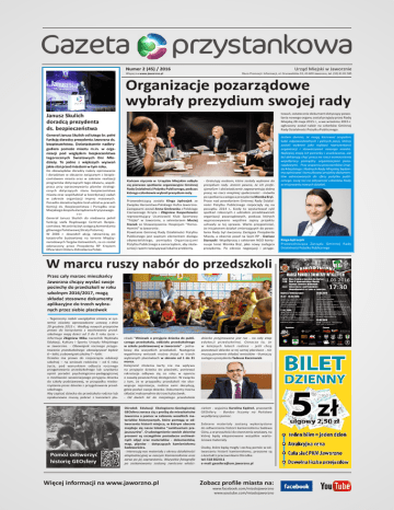 Gazeta przystankowa Urząd Miejski w Jaworznie Numer 2 (45) / 2016 Więcej na www.jaworzno.pl Biuro Promocji i Informacji, ul. Grunwaldzka 33, 43-600 Jaworzno, tel. (32) 61 81 585 Organizacje pozarządowe wybrały prezydium swojej rady towań, ostatecznie dokument dotyczący powołania nowego organu został przyjęty przez Radę Miejską 28 maja 2015 r., a we wrześniu 2015 r. ogłoszony został nabór na członków Gminnej Rady Działalności Pożytku Publicznego. Janusz Skulich doradcą prezydenta ds. bezpieczeństwa Generał Janusz Skulich od lutego br. pełni funkcję doradcy prezydenta Jaworzna ds. bezpieczeństwa. Doświadczenie nadbrygadiera pomoże miastu m.in. w organizacji pod względem bezpieczeństwa tegorocznych Światowych Dni Młodzieży. To jedno z większych wyzwań jakie stoi przed miastem w tym roku. Do obowiązków doradcy należy opiniowanie i doradztwo w obszarze związanym z bezpieczeństwem miasta oraz w zakresie realizacji programów dotyczących tego obszaru, współpraca przy opracowywaniu planów strategicznych dotyczących stanu bezpieczeństwa miasta oraz współudział w koordynacji zadań w zakresie organizacji imprez masowych. Ponadto doradca będzie brał udział w pracach Komisji ds. Bezpieczeństwa i Porządku oraz Miejskiego Zespołu Zarządzania Kryzysowego. *** Generał Janusz Skulich do niedawna pełnił funkcję szefa Rządowego Centrum Bezpieczeństwa. Wcześniej był zastępcą komendanta głównego Państwowej Straży Pożarnej. W 2006 r. dowodził akcją ratowniczą po katastrofie budowlanej na terenie Międzynarodowych Targów Katowickich, za co został odznaczony przez Prezydenta RP Krzyżem Oficerskim Orderu Odrodzenia Polski. Końcem stycznia w Urzędzie Miejskim odbyło się pierwsze spotkanie organizacyjne Gminnej Rady Działalności Pożytku Publicznego, podczas którego członkowie wybrali prezydium rady. Przewodniczącą została Kinga Jędrzejek ze Związku Harcerstwa Polskiego Hufca Jaworzno. Zastępcami zostali Anna Grelowska z Polskiego Czerwonego Krzyża i Zbigniew Kasperkowicz reprezentujący Uczniowski Klub Sportowy "Trójka” w Jaworznie, a sekretarzem Maciej Stanek ze Stowarzyszenia Hospicjum "HomoHomini” w Jaworznie. Powstanie Gminnej Rady Działalności Pożytku Publicznego jest ważnym elementem dialogu obywatelskiego, pomiędzy Organizacjami Pożytku Publicznego a samorządem, aby skuteczniej i razem rozwiązywać lokalne problemy. - Gratuluję osobom, które zostały wybrane do prezydium rady. Jestem pewna, że ich profesjonalizm i doświadczenie zagwarantują dobrą pracę na rzecz miejskiej społeczności - mówiła po spotkaniu zastępca prezydenta Monika Bryl. Prace nad powołaniem Gminnej Rady Działalności Pożytku Publicznego rozpoczęły się na początku 2014 r., kiedy to wystartował cykl spotkań roboczych z udziałem przedstawicieli organizacji pozarządowych, podczas których wypracowywano wspólnie zapisy projektu uchwały w tej sprawie. Warto przypomnieć, że inicjatorem działań zmierzających do powołania Rady był ówczesny Zastępca Prezydenta Miasta, a obecnie poseł na Sejm RP - Dariusz Starzycki. Współpracę z sektorem NGO kontynuuje teraz Monika Bryl, jako nowy zastępca prezydenta. Po okresie negocjacji i przygo- W marcu ruszy nabór do przedszkoli Przez cały marzec mieszkańcy Jaworzna chcący wysłać swoje pociechy do przedszkoli w roku szkolnym 2016/2017, mogą składać stosowne dokumenty aplikacyjne do trzech wybranych przez siebie placówek - Tegoroczny nabór uwzględnia zmiany w systemie oświaty wprowadzone ustawą z dnia 29 grudnia 2015 r. Według nowych przepisów prawo do korzystania z wychowania przedszkolnego mają dzieci od 3 do 5 roku życia – informuje Zbigniew Mika naczelnik Wydziału Edukacji, Kultury i Sportu Urzędu Miejskiego w Jaworznie. - Obowiązek rocznego przygotowania przedszkolnego obowiązywał będzie 6 – latki, a obowiązek szkolny 7 – latki. Dziecko ma prawo do rozpoczęcia edukacji szkolnej – na wniosek rodziców – od 6 roku życia, pod warunkiem odbycia rocznego przygotowania przedszkolnego lub uzyskania opinii poradni psychologiczno-pedagogicznej o możliwości wcześniejszego przyjęcia dziecka do szkoły podstawowej, w przypadku nieskorzystania przez dziecko z przygotowania przedszkolnego. Aby zapisać dziecko do przedszkola rodzice lub opiekunowie muszą pobrać z kancelarii pla- Pomóż odtworzyć historię GEOsfery cówki "Wniosek o przyjęcie dziecka do publicznego przedszkola, oddziału przedszkolnego w szkole podstawowej w Jaworznie" - jednakowy dla wszystkich przedszkoli. Następnie wypełniony wniosek można złożyć w trzech wybranych placówkach w okresie od 1 do 31 marca. Kolejność złożenia karty nie ma wpływu na przyjęcie dziecka do placówki, ponieważ rekrutacja odbywa się co roku w oparciu o zasadę powszechnej dostępności. W związku z tym, że w przypadku przedszkoli nie obowiązuje rejonizacja, rodzice sami decydują, gdzie posłać swoje dziecko. Dokumenty można składać maksymalnie do trzech placówek. - Od dwóch lat do miejskiego przedszkola dziecko przyjmowane jest raz - na cały etap edukacji przedszkolnej. Oznacza to, że w kolejnych latach rodzice - jeśli chcą pozostawić dziecko w tej samej placówce - nie muszą ponownie składać wniosków - tłumaczy zastępca prezydenta Tadeusz Kaczmarek. Ośrodek Edukacji Ekologiczno-Geologicznej GEOsfera zwraca się z prośbą do mieszkańców Jaworzna o pomoc w zebraniu wszelkich materiałów historycznych, które pomogą w odtworzeniu historii miejsca, w którym obecnie znajduje się nasze lokalne "sanktuarium prajaszczurów". O udostępnienie swoich zbiorów proszeni są szczególnie posiadacze archiwalnych zdjęć oraz materiałów - dokumentów, map, planów - dotyczących kamieniołomu Sadowa Góra. - Interesują nas materiały z okresu działalności eksploatacyjnej w naszym Kamieniołomie oraz zaraz po jej zaprzestaniu. Wszystkie fotografie po zeskanow