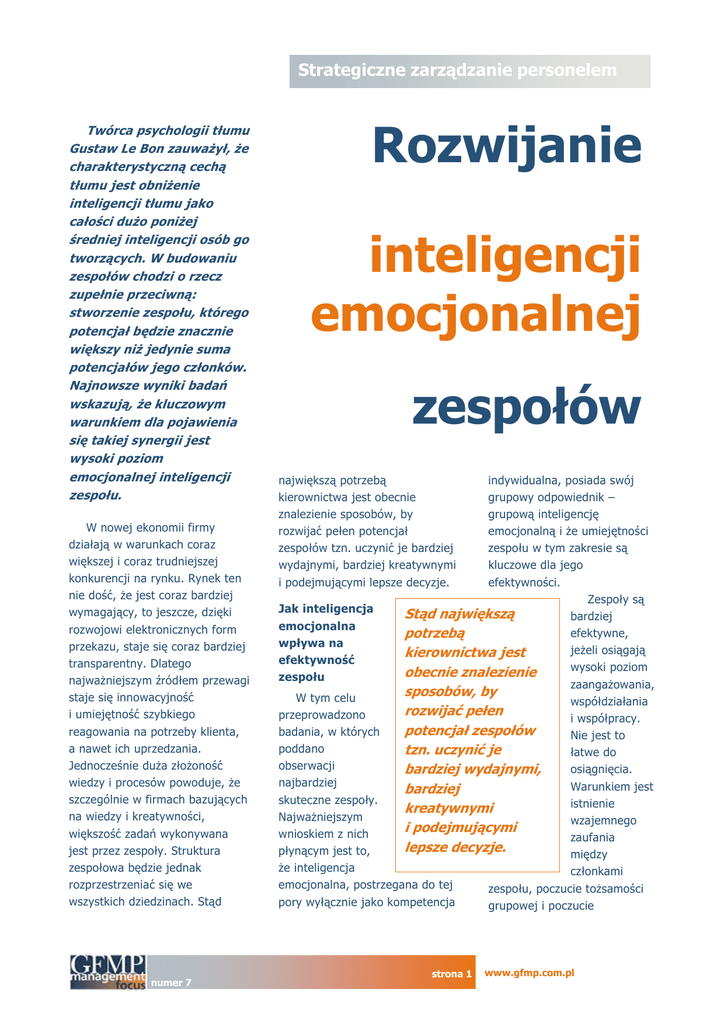 Strategiczne zarządzanie personelem Twórca psychologii tłumu Gustaw Le Bon zauważył, że charakterystyczną cechą tłumu jest obniżenie inteligencji tłumu jako całości dużo poniżej średniej inteligencji osób go tworzących. W budowaniu zespołów chodzi o rzecz zupełnie przeciwną: stworzenie zespołu, którego potencjał będzie znacznie większy niż jedynie suma potencjałów jego członków. Najnowsze wyniki badań wskazują, że kluczowym warunkiem dla pojawienia się takiej synergii jest wysoki poziom emocjonalnej inteligencji zespołu. W nowej ekonomii firmy działają w warunkach coraz większej i coraz trudniejszej konkurencji na rynku. Rynek ten nie dość, że jest coraz bardziej wymagający, to jeszcze, dzięki rozwojowi elektronicznych form przekazu, staje się coraz bardziej transparentny. Dlatego najważniejszym źródłem przewagi staje się innowacyjność i umiejętność szybkiego reagowania na potrzeby klienta, a nawet ich uprzedzania. Jednocześnie duża złożoność wiedzy i procesów powoduje, że szczególnie w firmach bazujących na wiedzy i kreatywności, większość zadań wykonywana jest przez zespoły. Struktura zespołowa będzie jednak rozprzestrzeniać się we wszystkich dziedzinach. Stąd numer 7 Rozwijanie inteligencji emocjonalnej zespołów największą potrzebą kierownictwa jest obecnie znalezienie sposobów, by rozwijać pełen potencjał zespołów tzn. uczynić je bardziej wydajnymi, bardziej kreatywnymi i podejmującymi lepsze decyzje. indywidualna, posiada swój grupowy odpowiednik – grupową inteligencję emocjonalną i że umiejętności zespołu w tym zakresie są kluczowe dla jego efektywności. Zespoły są Jak inteligencja Stąd największą bardziej emocjonalna efektywne, potrzebą wpływa na jeżeli osiągają kierownictwa jest efektywność wysoki poziom obecnie znalezienie zespołu zaangażowania, sposobów, by W tym celu współdziałania rozwijać pełen przeprowadzono i współpracy. potencjał zespołów badania, w których Nie jest to poddano tzn. uczynić je łatwe do obserwacji osiągnięcia. bardziej wydajnymi, najbardziej Warunkiem jest bardziej skuteczne zespoły. istnienie kreatywnymi Najważniejszym wzajemnego i podejmującymi wnioskiem z nich zaufania lepsze decyzje. płynącym jest to, między że inteligencja członkami emocjonalna, postrzegana do tej zespołu, poczucie tożsamości pory wyłącznie jako kompetencja grupowej i poczucie strona 1 www.gfmp.com.pl Strategiczne zarządzanie personelem skuteczności, czyli przekonanie, Trzy poziomy interakcji że zespół jest dobry i razem w zespołach może osiągnąć więcej niż każdy W koncepcji indywidualnej z jego członków inteligencji Inteligencja z osobna. emocjonalnej Tego typu emocjonalna, Daniel Goleman przekonania wprowadza postrzegana do tej powstają rozróżnienie na pory wyłącznie jako w zespołach, które kompetencje kompetencja dobrze radzą sobie osobiste indywidualna, z emocjami (zdolność posiada swój (indywidualnymi rozpoznawania, grupowy i zbiorowymi). Takie brania pod zespoły potrafią odpowiednik – uwagę rozpoznawać emocje i regulowania grupową inteligencję i rozumieć, w jaki własnych emocjonalną i że sposób wpływają emocji) umiejętności zespołu one na pracę i kompetencje w tym zakresie są zespołu. Potrafią też społeczne kluczowe dla jego budować dobre (zdolność efektywności. relacje wewnątrz rozpoznawania, zespołu jak brania pod i w otoczeniu. Są inteligentne uwagę i wpływania na emocje emocjonalnie, to znaczy innych). rozpoznają emocje swoje Grupowa inteligencja i innych, potrafią je regulować emocjonalna natomiast odnosi i na nie wpływać oraz się do interakcji na trzech wykorzystywać w codziennej poziomach: pracy. numer 7 strona 2 • • • indywidualnym (zespół wobec członka zespołu), grupowym (zespół wobec samego siebie), związanym z otoczeniem (zespół wobec innych grup). Po pierwsze zespół powinien rozumieć i regulować emocje swoich członków. Po drugie zespół powinien rozpoznawać to, jaka panuje w nim atmosfera i wiedzieć, jak można ją poprawić. Po trzecie zespół powinien rozumieć osoby spoza zespołu i wpływać na ich emocje. Nie zawsze to, co robi zespół odnosi się do wszystkich trzech poziomów. Oznacza to, że zespół z inteligentnymi emocjonalnie członkami jeszcze nie koniecznie musi być inteligentny emocjonalnie – może zaniedbać relacje na dwóch pozostałych poziomach. www.gfmp.com.pl Strategiczne zarządzanie personelem Normy grupowe rozwijające inteligencję emocjonalną Rozwijanie grupowej inteligencji emocjonalnej polega na tworzeniu umiejętności i chęci rozpoznawania i brania pod uwagę, jak również regulowania emocji na wszystkich trzech poziomach. Sprzyja temu tworzenie odpowiednich norm grupowych. Zachowania zespołów, jak wszystkich grup społecznych, regulowane są przez normy. Normy powstają najczęściej w sposób nieświadomy, kiedy pewne działania regularnie powtarzają się w grupie i członkowie uznają je za skuteczne sposoby osiągania celów, kiedy pewne zachowania są naśladowane, lub są wynikiem norm istniejących w szerszym otoczeniu. Normy mogą również być świadomie kształtowane i propagowane przez kierowników poprzez konsekwentne przejawianie pewnych zachowań, chwalenie, ganienie, egzekwowanie określonych zachowań u pracowników, wprowadzanie pewnych zasad. Szkolenia i treningi są również dobrymi sposobami na rozwijanie określonych umiejętności, nastawień i wrażliwości na emocje innych. Wyróżnić zatem można pięć głównych źródeł, skąd pochodzą normy: • od formalnych liderów zespołu, • od liderów nieformalnych, • od ich odważnych naśladowców, • przez treningi, numer 7 • z szerszej kultury organizacyjnej. Rozwinął on normę nakazującą członkom zespołu zwracać uwagę i rozumieć uczucia Istnieje kilka łatwych do innych. Aby doprowadzić do wprowadzeni
