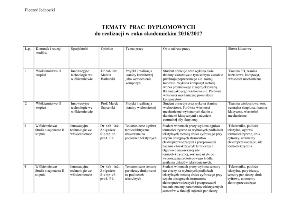 Pieczęć Jednostki TEMATY PRAC DYPLOMOWYCH do realizacji w roku akademickim 2016/2017 L.p. Kierunek i rodzaj studiów Specjalność Opiekun Temat pracy Opis zakresu pracy Słowa kluczowe 1 Włókiennictwo II stopień Innowacyjne technologie we włókiennictwie Dr hab. inż. Marcin Barburski Projekt i realizacja tkaniny kształtowej jako wzmocnienie kompozytu Tkanina 3D, tkanina kształtowa, kompozyt, własności mechaniczne 2 Włókiennictwo II stopień Innowacyjne technologie we włókiennictwie Prof. Marek Snycerski Projekt i realizacja tkaniny wieloosiowej Student opracuje oraz wykona dwie tkaniny kształtowe o tym samym kształcie przekroju poprzecznego ale różnej budowie. Wykona kompozyt metodą worka próżniowego z zaprojektowaną tkaniną jako jego wzmocnienie. Porówna własności mechaniczne powstałych kompozytów Student opracuje oraz wykona tkaniny wieloosiowe. Porówna własności mechaniczne wykonanych tkanin z tkaninami klasycznymi z użyciem centralnej siły skupionej 3 Włókiennictwo Studia stacjonarne II stopnia Innowacyjne technologie we włókiennictwie Dr hab. inż. Zbigniew Stempień, prof. PŁ Tekstroniczne ogniwa termoelektryczne drukowane na podłożach tekstylnych Tekstronika, podłoża tekstylne, ogniwo termoelektryczne, druk cyfrowy, atramenty elektroprzewodzące, siła termoelektryczna 4 Włókiennictwo Studia stacjonarne II stopnia Innowacyjne technologie we włókiennictwie Dr hab. inż. Zbigniew Stempień, prof. PŁ Tekstroniczne sensory par cieczy drukowane na podłożach tekstylnych Student w ramach pracy wykona ogniwa termoelektryczne na wybranych podłożach tekstylnych metodą druku cyfrowego przy użyciu dostępnych atramentów elektroprzewodzących i przeprowadzi badania charakterystyk termicznych. Ogniwo o największej sile termoelektrycznej, zostanie użyte do wytworzenia prototypowego źródła zasilania układów tekstronicznych. Student w ramach pracy wykona sensory par cieczy na wybranych podłożach tekstylnych metodą druku cyfrowego przy użyciu dostępnych atramentów elektroprzewodzących i przeprowadzi badania zmiany parametrów elektrycznych sensorów w funkcji stężenia par cieczy. Tkanina wieloosiowa, test, centralna skupiona, tkanina klasyczna, własności mechaniczne Tekstronika, podłoża tekstylne, pary cieczy, sensory par cieczy, druk cyfrowy, atramenty elektroprzewodzące 5 Włókiennictwo Studia stacjonarne II stopnia Innowacyjne technologie we włókiennictwie Dr inż. Agnieszka Cichocka Innowacyjne technologie w odzieżownictwie a proces masscustomization 6 Włókiennictwo Studia stacjonarne II stopnia Innowacyjne technologie we włókiennictwie Dr inż. Agnieszka Cichocka Proces projektowania a mass-customization wyrobów odzieżowych 7 Włókiennictwo Studia stacjonarne II stopnia Innowacyjne technologie we włókiennictwie Dr inż. Agnieszka Cichocka 8 Włókiennictwo Studia stacjonarne II stopnia Innowacyjne technologie we włókiennictwie Dr inż. Agnieszka Cichocka 9 Włókiennictwo Studia stacjonarne II stopnia Innowacyjne technologie we włókiennictwie Dr inż. Agnieszka Cichocka 10 Włókiennictwo Studia stacjonarne II stopnia Innowacyjne technologie we włókiennictwie Dr inż. Agnieszka Cichocka Projekt wyrobu włókienniczego odzieży przekształcalnej z wykorzystaniem systemu CAD Wykorzystanie CAD w opracowywaniu technologii wykonania kolekcji wyrobów odzieżowych wybranej bazy konstrukcyjnej odzieży Wpływ procesu obróbki technologicznej odzieży na stopień dopasowania odzieży na przykładzie wybranego asortymentu odzieży Wpływ układalności wybranych pakietów materiałów włókienniczych na stopień dopasowania i układania się odzieży na użytkowniku Celem pracy jest podjęcie próby odpowiedzi na pytanie o zaawansowaniu innowacyjnych technologii w odzieżownictwie i przyszłych trendach w myśl idei mass-customization, na przykładzie wybranego wyrobu odzieżowego. Celem pracy jest ocena wpływu powstawania wybranych wyrobów odzieżowych jako produktów masscustomization na proces projektowania odzieży przy użyciu CAD. Celem pracy jest realizacja prototypu oraz opracowanie skróconej dokumentacji techniczno-technologicznej wybranego projektu odzieży przekształcalnej z wykorzystaniem systemu CAD oraz nowoczesnych technologii skanowania 3D Celem pracy jest projektowanie wzorów odzieży oraz technologii wykonania kolekcji wyrobów odzieżowych, opartych na wspólnej bazie konstrukcyjnej z wykorzystaniem systemu CAD. mass-customization, innowacyjne technologie w odzieżownictwie Celem pracy jest analiza wpływu wybranych procesów obróbki technologicznej (np. prasowania, podklejenia) odzieży na stopień dopasowania odzieży do użytkownika na przykładzie wybranego asortymentu odzieży Procesy obróbki technologicznej odzieży, stopień dopasowania odzieży do użytkownika Celem pracy jest ocena układalności wybranych pakietów materiałów włókienniczych i jej wpływu na stopień dopasowania i układania się wytypowanej odzieży na użytkowniku, wykonanej z wytypowanych materiałów Układalność materiałów włókienniczych, stopień dopasowania odzieży do użytkownika, układalność odzieży na użytkowniku System CAD, proces projektowania wyrobów odzieżowych, masscustomization Odzież przekształcalna, system CAD, skanowanie 3D System CAD, technologia odzieży 11 Włókiennictwo Studia stacjonarne II stopnia Innowacyjne technologie we włókiennictwie Dr inż. Agnieszka Cichocka Wpływ personalizacji odzieży na komfort cieplny użytkownika 12 Włókiennictwo Studia stacjonarne II stopnia Innowacyjne technologie we włókiennictwie Doc. dr inż. Janusz Zieliński Wykorzystanie techniki CAD do opracowania projektu technologicznego wzorca odzieży jednowarstwowej 13 Włókiennictwo Studia stacjonarne II stopnia Innowacyjne technologie we włókiennictwie Prof. Iwona Frydrych Dobór nici do szycia tkanin bazaltowych i analiza sprawności otrzymanych szwów 14 Włókiennictwo