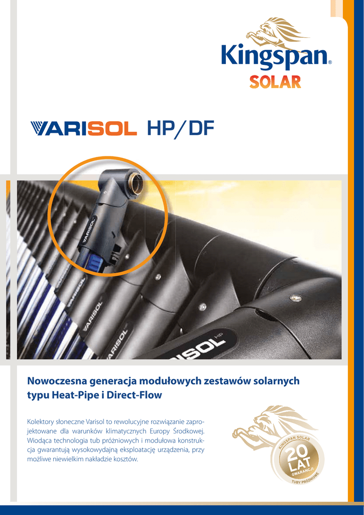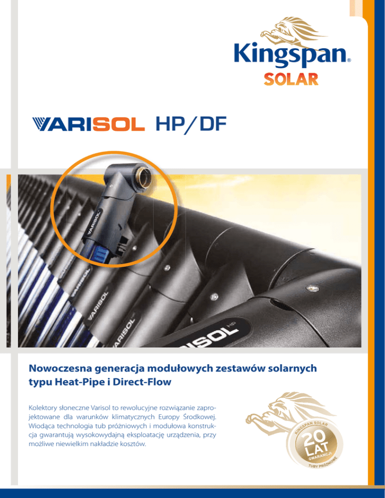 HP/DF / Kolejna generacja próżniowych kolektorów słonecznych oparta na technologii Heat Pipe I Direct Flow Nowoczesna generacja modułowych zestawów solarnych typu Heat-Pipe i Direct-Flow Kolektory słoneczne Varisol to rewolucyjne rozwiązanie zaprojektowane dla warunków klimatycznych Europy Środkowej. Wiodąca technologia tub próżniowych i modułowa konstrukcja gwarantują wysokowydajną eksploatację urządzenia, przy możliwe niewielkim nakładzie kosztów. / HP/DF Kolejna generacja próżniowych kolektorów słonecznych oparta na technologii Heat Pipe I Direct Flow Kolektory próżniowe Varisol to nowoczesne rozwiązanie produkowane z wykorzystaniem technologii Heat-Pipe lub Direct-Flow. Kolektory Varisol HP zawierają system miedzianych rurek wypełnionych cieczą. W trakcie obiegu ciecz paruje pod wpływem temperatury przenosząc energię do chłodnego końca rurki, aby po przekazaniu energii powrócić do ciepłego końca. Cały proces powtarza się cyklicznie, natomiast energia jest transportowana dalej przez modułową głowicę i system rur do wymiennika ciepła. Kolektory Varisol DF wykorzystują system bezpośredniego przepływu. Zimny płyn solarny wpływa centralną rurką, jest ogrzewany przez absorber, a następnie przemieszcza się w górę rurki. Dalej jest transportowany przez modułową głowicę kolektora i system rur do wymiennika ciepła. WYJĄTKOWY PROJEKT I WYSOKA JAKOŚĆ System zaprojektowany i wyprodukowany w 100% w Europie, w pełni dostosowany do klimatu północnej i środkowej Europy. Modułowa konstrukcja daje możliwość zamontowania określonej ilości tub dla osiągnięcia najbardziej optymalnego efektu instalacji. Wysoka próżnia w rurach szklanych zapewnia doskonałą izolację cieplną, dzięki czemu kolektory mogą wykorzystywać nawet niewielkie ilości promieni słonecznych. Rury próżniowe zostały wykonane z najwyższej jakości szkła, z wapna sodowanego o niskiej zawartości żelaza, wysokiej przepuszczalności i odporności mechanicznej. Doskonała absorbcja promieni słonecznych dzięki zastosowaniu powłoki TINOX. ŁATWY MONTAŻ I EKONOMICZNA EKSPLOATAC JA Modułowy system pozwala na instalację dowolnej ilości tub próżniowych, w różnych płaszczyznach. Poszczególne kolektory są montowane pojedynczo, dzięki zastosowaniu nowoczesnego systemu „clik-fit”. Możliwość zamontowania od 1 do 150 tub próżniowych w jednym rzędzie. Brak tradycyjnej głowicy oraz zastosowanie polimeru powoduje, że system jest lżejszy od tradycyjnych kolektorów. Prawidłowa instalacja systemu solarnego gwarantuje długoletnią, zoptymalizowaną pracę, oraz maksymalną ilość ciepłej wody w warunkach lokalnego promieniowania słonecznego. Możliwość zastosowania w każdym budynku zapewniają różnorodne typy mocowań dachowych, oraz mocowanie w poziomie np. elewacja czy dach płaski. Varisol V Vari sol HP wyposażone wy są w unikatowy t bezpiecznik termiczny, który zapewnia dodatkowe zabezpieczenie układu przed przegrzaniem. Dostępne są do wyboru czujniki: HP400 (90°) oraz HP450 (135°) Miedziana kieszeń jest uformowana w polimerowej głowicy żeby pomieścić kondensator i zapewnić suche połączenie tub kolektora. KOLEKTORY SŁONECZNE VARISOL Unikatowa modułowa konstrukcja gwarantuje 100% precyzji w doborze rozmiaru kolektora w instalacjach domowych i komercyjnych. Nieograniczone możliwości montażu i rozbudowy systemu. Zastosowanie wysokiej jakości materiałów polimerowych. Prosta i szybka instalacja dzięki połączeniu „click-fit”. Pełna wydajność systemu dzięki niskim stratom ciepła. Opatentowane połączenie szkła i metalu zapewnia wytrzymałość i szczelność systemu. Start systemu w 3 minuty. Certyfikat Solar Keymark. 20 lat gwarancji na utrzymanie próżni w tubach w przypadku montażu przez autoryzowanego instalatora. 5 lat gwarancji odporności na skutki gradobicia potwierdzone certyfikatem. Parametry VARISOL DF Liczba rur Powierzchnia apertury Całkowite wymiary VARISOL HP 1 rura 40 rur 1 rura 40 rur 0,105 m² 4,20 m² 0,11 m² 4,26 m² 1965 x 2840 x 80 mm 1950 x 70,9 x 71 mm 1950 x 2847 x 71 mm 1965 x 71 x 80 mm Powierzchnia całkowita 0,138 m² 5,52 m² 0,14 m² 5,58 Długość tuby 1950 mm 1950 mm 1965 mm 1965 mm Pojemność płynu 0,19 litra 7,6 litra 0,05 litra Przyłącze (miedź) 22 mm 2 litry 22 mm Waga 2,2 kg 88 kg 2,13 kg 85,2 kg Zalecana instalacja 0÷90° 0÷90° 20÷70° 20÷70° HP135 Efektywność w odniesieniu Apertura HP90 Eta 0 0,783 0,76 0,78 a1 [W/m²K] 1,061 1,621 2,112 0,008 0,006 a2 [W/m²K] 0,023 Zalecany wskaźnik przepływu [l/h] - 240 Maksymalne ciśnienie robocze - 240 6 bar 6 bar Temperatura stagnacji 240,4°C Ogranicznik temp. zabezpiecza przed stagnacją. Cieplny transfer ciepła Glikol Glikol Skład absorberu Miedź Miedź Warstwa pokrycia Selektywne pokrycie - Tinox Selektywne pokrycie - Tinox Abrorbcja 95% 95% Emisja 5% 5% Stal nierdzewna, Alu, EPDM Szkło solarne z wapna sodowanego o niskiej zawartości żelaza - transm. 0,92 Wyższa niż 10¯⁶ bar Stal nierdzewna, Alu, EPDM Szkło solarne z wapna sodowanego o niskiej zawartości żelaza - transm. 0,92 Wyższa niż 10¯⁶ bar tak tak Rama mocująca i uchwyty Materiał Próżnia Certyfikat Solar Keymark Możliwości montażu VARISOL DF VARISOL HP 1 1 1. Dach skośny 45° 2. Dach skośny 45° (montaż poziomy) 3. Fasada (montaż poziomy) 4. Dach płaski lub konstrukcja wolnostojąca 5. Montaż poziomy 6. Dach skośny + 20° 7. Fasada (montaż pionowy) 3 2 4 6 5 6 7 4 / HP/DF Kolejna generacja próżniowych kolektorów słonecznych oparta na technologii Heat Pipe I Direct Flow Nowoczesna generacja kolektorów słonecznych oparta na technologii HeatPipe i Direct Flow. Instalacja kolektora nigdy nie była tak prosta! 1. Dołącz tubę Varisol. 2. Przekręć ją w dół. 3. Klik i gotowe. Przykłady instalacji: Dom jednorodzinny w Pradze. Zakład produkcyjny w Rokietnicy. Zapytania prosimy kierować pod adres ema
