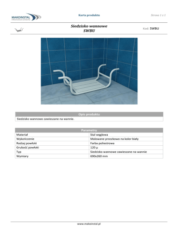 Karta produktu Siedzisko wannowe SWBU Strona 1 z 1 Kod: SWBU Opis produktu Siedzisko wannowe zawieszane na wannie. Parametry Materiał Wykończenie Rodzaj powłoki Grubość powłoki Typ Wymiary Stal węglowa Malowane proszkowo na kolor biały Farba poliestrowa 120 µ Siedzisko wannowe zawieszane na wannie 690x260 mm www.makoinstal.pl