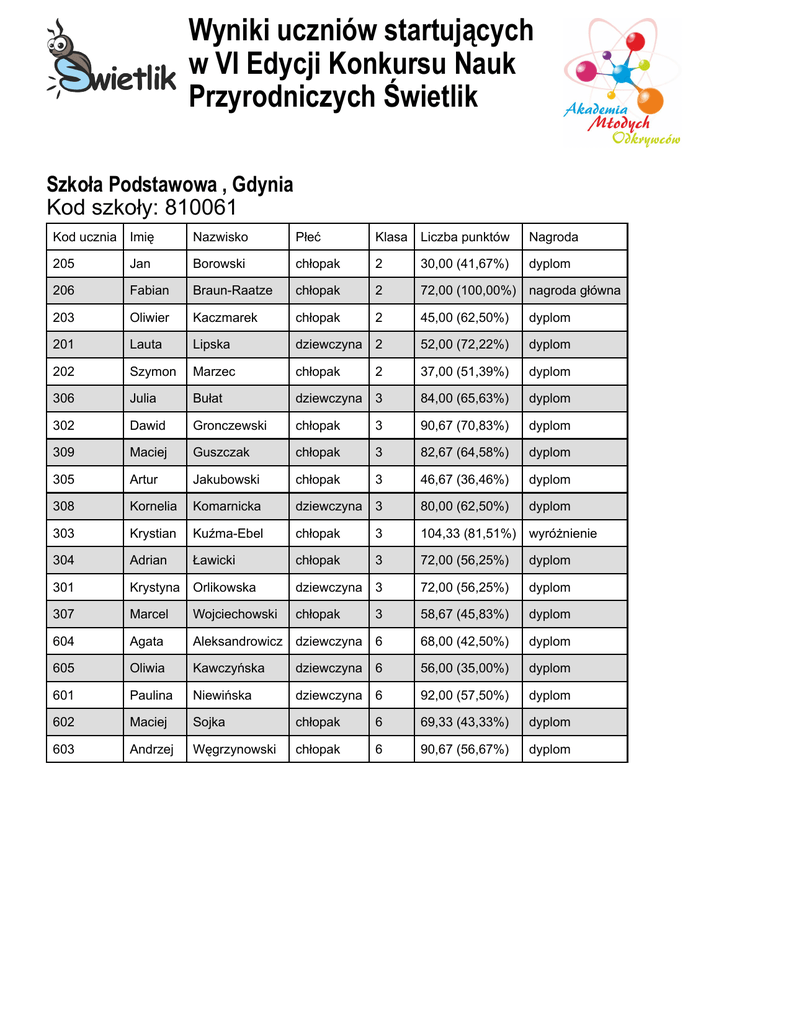 Wyniki uczniów startujących w VI Edycji Konkursu Nauk Przyrodniczych Świetlik Szkoła Podstawowa , Gdynia Kod szkoły: 810061 Kod ucznia Imię Nazwisko Płeć Klasa Liczba punktów Nagroda 205 Jan Borowski chłopak 2 30,00 (41,67%) dyplom 206 Fabian Braun-Raatze chłopak 2 72,00 (100,00%) nagroda główna 203 Oliwier Kaczmarek chłopak 2 45,00 (62,50%) dyplom 201 Lauta Lipska dziewczyna 2 52,00 (72,22%) dyplom 202 Szymon Marzec chłopak 2 37,00 (51,39%) dyplom 306 Julia Bułat dziewczyna 3 84,00 (65,63%) dyplom 302 Dawid Gronczewski chłopak 3 90,67 (70,83%) dyplom 309 Maciej Guszczak chłopak 3 82,67 (64,58%) dyplom 305 Artur Jakubowski chłopak 3 46,67 (36,46%) dyplom 308 Kornelia Komarnicka dziewczyna 3 80,00 (62,50%) dyplom 303 Krystian Kuźma-Ebel chłopak 3 104,33 (81,51%) wyróżnienie 304 Adrian Ławicki chłopak 3 72,00 (56,25%) dyplom 301 Krystyna Orlikowska dziewczyna 3 72,00 (56,25%) dyplom 307 Marcel Wojciechowski chłopak 3 58,67 (45,83%) dyplom 604 Agata Aleksandrowicz dziewczyna 6 68,00 (42,50%) dyplom 605 Oliwia Kawczyńska dziewczyna 6 56,00 (35,00%) dyplom 601 Paulina Niewińska dziewczyna 6 92,00 (57,50%) dyplom 602 Maciej Sojka chłopak 6 69,33 (43,33%) dyplom 603 Andrzej Węgrzynowski chłopak 6 90,67 (56,67%) dyplom