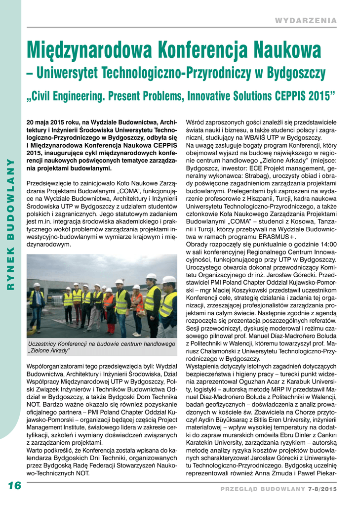 WYDA RZEN I A Międzynarodowa Konferencja Naukowa – Uniwersytet Technologiczno-Przyrodniczy w Bydgoszczy R YNE K BUDOWLANY „Civil Engineering. Present Problems, Innovative Solutions CEPPIS 2015” 20 maja 2015 roku, na Wydziale Budownictwa, Architektury i Inżynierii Środowiska Uniwersytetu Technologiczno-Przyrodniczego w Bydgoszczy, odbyła się I Międzynarodowa Konferencja Naukowa CEPPIS 2015, inaugurująca cykl międzynarodowych konferencji naukowych poświęconych tematyce zarządzania projektami budowlanymi. Przedsięwzięcie to zainicjowało Koło Naukowe Zarządzania Projektami Budowlanymi „COMA”, funkcjonujące na Wydziale Budownictwa, Architektury i Inżynierii Środowiska UTP w Bydgoszczy z udziałem studentów polskich i zagranicznych. Jego statutowym zadaniem jest m.in. integracja środowiska akademickiego i praktycznego wokół problemów zarządzania projektami inwestycyjno-budowlanymi w wymiarze krajowym i międzynarodowym. Uczestnicy Konferencji na budowie centrum handlowego „Zielone Arkady” Współorganizatorami tego przedsięwzięcia byli: Wydział Budownictwa, Architektury i Inżynierii Środowiska, Dział Współpracy Międzynarodowej UTP w Bydgoszczy, Polski Związek Inżynierów i Techników Budownictwa Oddział w Bydgoszczy, a także Bydgoski Dom Technika NOT. Bardzo ważne okazało się również pozyskanie oficjalnego partnera – PMI Poland Chapter Oddział Kujawsko-Pomorski – organizacji będącej częścią Project Management Institute, światowego lidera w zakresie certyfikacji, szkoleń i wymiany doświadczeń związanych z zarządzaniem projektami. Warto podkreślić, że Konferencja została wpisana do kalendarza Bydgoskich Dni Techniki, organizowanych przez Bydgoską Radę Federacji Stowarzyszeń Naukowo-Technicznych NOT. 16 Wśród zaproszonych gości znaleźli się przedstawiciele świata nauki i biznesu, a także studenci polscy i zagraniczni, studiujący na WBAiIŚ UTP w Bydgoszczy. Na uwagę zasługuje bogaty program Konferencji, który obejmował wyjazd na budowę największego w regionie centrum handlowego „Zielone Arkady” (miejsce: Bydgoszcz, inwestor: ECE Projekt management, generalny wykonawca: Strabag), uroczysty obiad i obrady poświęcone zagadnieniom zarządzania projektami budowlanymi. Prelegentami byli zaproszeni na wydarzenie profesorowie z Hiszpanii, Turcji, kadra naukowa Uniwersytetu Technologiczno-Przyrodniczego, a także członkowie Koła Naukowego Zarządzania Projektami Budowlanymi „COMA” – studenci z Kosowa, Tanzanii i Turcji, którzy przebywali na Wydziale Budownictwa w ramach programu ERASMUS+. Obrady rozpoczęły się punktualnie o godzinie 14:00 w sali konferencyjnej Regionalnego Centrum Innowacyjności, funkcjonującego przy UTP w Bydgoszczy. Uroczystego otwarcia dokonał przewodniczący Komitetu Organizacyjnego dr inż. Jarosław Górecki. Przedstawiciel PMI Poland Chapter Oddział Kujawsko-Pomorski – mgr Maciej Koszykowski przedstawił uczestnikom Konferencji cele, strategię działania i zadania tej organizacji, zrzeszającej profesjonalistów zarządzania projektami na całym świecie. Następnie zgodnie z agendą rozpoczęła się prezentacja poszczególnych referatów. Sesji przewodniczył, dyskusję moderował i reżimu czasowego pilnował prof. Manuel Díaz-Madroñero Boluda z Politechniki w Walencji, któremu towarzyszył prof. Mariusz Chalamoński z Uniwersytetu Technologiczno-Przyrodniczego w Bydgoszczy. Wystąpienia dotyczyły istotnych zagadnień dotyczących bezpieczeństwa i higieny pracy – turecki punkt widzenia zaprezentował Oguzhan Acar z Karabuk University, logistyki – autorską metodę MRP IV przedstawił Manuel Diaz-Madroñero Boluda z Politechniki w Walencji, badań geofizycznych – doświadczenia z analiz prowadzonych w kościele św. Zbawiciela na Chorze przytoczył Aydin Büyüksaraç z Bitlis Eren University, inżynierii materiałowej – wpływ wysokiej temperatury na dodatki do zapraw murarskich omówiła Ebru Dinler z Cankırı Karatekin University, zarządzania ryzykiem – autorską metodę analizy ryzyka kosztów projektów budowlanych scharakteryzował Jarosław Górecki z Uniwersytetu Technologiczno-Przyrodniczego. Bydgoską uczelnię reprezentowali również Anna Żmuda i Paweł PiekarPRzeg l Ąd bu d owl any 7-8/2015 WYDAR ZEN I A Otwarcia obrad Konferencji dokonał dr inż. Jarosław Górecki PR zeglĄ d bu d ow l an y 7-8/2015 nizacyjny konferencji w konkursie na najlepszy referat studencki. Konferencję zakończyła obietnica dalszych cyklicznych spotkań w sprawie doskonalenia zarządzania projektami inwestycyjno-budowlanymi. Zgodnie z zapowiedziami organizatorów Konferencji przyszłoroczne spotkanie z cyklu „Civil Engineering. Present Problems, Innovative Solutions” CEPPIS 2016 zostanie poświęcone zrównoważonemu rozwojowi – na które już dziś serdecznie zapraszamy! Więcej informacji: www.ceppis.pl Opiekun KN ZPB „COMA”: dr inż. Jarosław Górecki Członek Komitetu Organizacyjnego CEPPIS 2015: mgr inż. Anna Żmuda R YNE K BUDOWLANY ski, którzy przedstawili sytuację rynku mieszkaniowego w Bydgoszczy, a projekty budowlane w specyficznym ujęciu architektury wnętrz zaprezentował Oğuzhan Uzun. Po pierwszej części sesji, w której debatowano nad prezentacjami przygotowanymi przez kadrę naukową przyszedł czas wystąpienia studentów. Charakterystykę realizacji wybranych projektów budowlanych realizowanych w Turcji przedstawili Mehmet Servet Ebe i Kübra Haykir, z kolei Haytham Hazza omówił specyfikę zarządzania projektami budowlanymi w Tanzanii, a Fatih Erguler skupił się na wybranych przedsięwzięciach drogowych realizowanych w Kosowie. Wszyscy wymienieni studenci są członkami KN ZPB „COMA”. Dodatkowo zostali oni wyróżnieni przez Komitet Orga- Obrady konferencyjne 17