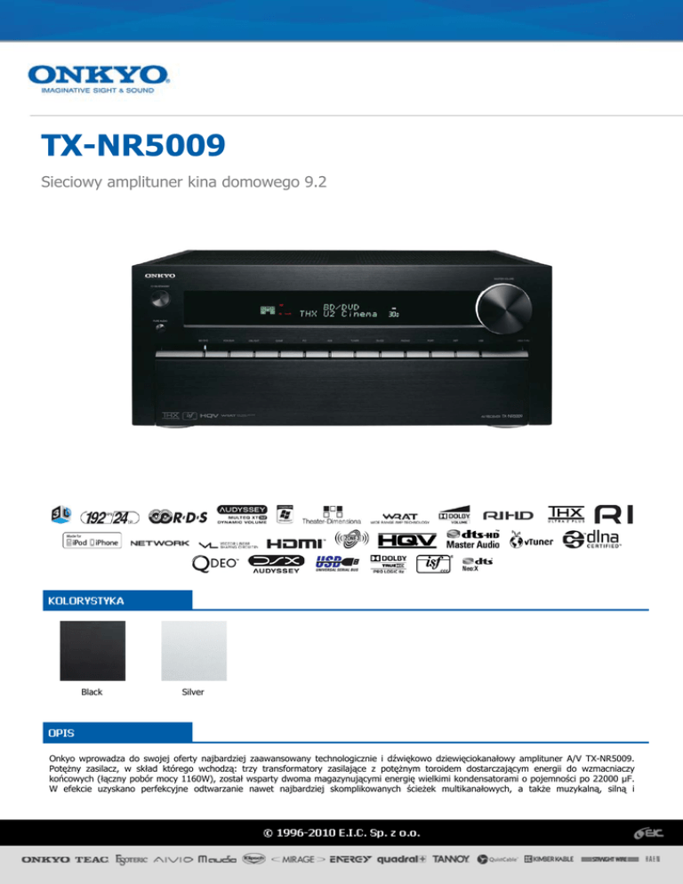 TX-NR5009 Sieciowy amplituner kina domowego 9.2 Black Silver Onkyo wprowadza do swojej oferty najbardziej zaawansowany technologicznie i dźwiękowo dziewięciokanałowy amplituner A/V TX-NR5009. Potężny zasilacz, w skład którego wchodzą: trzy transformatory zasilające z potężnym toroidem dostarczającym energii do wzmacniaczy końcowych (łączny pobór mocy 1160W), został wsparty dwoma magazynującymi energię wielkimi kondensatorami o pojemności po 22000 μF. W efekcie uzyskano perfekcyjne odtwarzanie nawet najbardziej skomplikowanych ścieżek multikanałowych, a także muzykalną, silną i precyzyjną stereofonię. Odporność wzmacniaczy na skomplikowane przebiegi impedancji podłączonych kolumn powoduje, że TX-NR5009 może współpracować z każdym dostępnym dzisiaj systemem nagłaśniającym. Za przetwarzanie sygnału audio z formy cyfrowej na analogową odpowiedzialnych jest sześć przetworników Texas Instruments Burr-Brown (PCM 1795) pracujących z rozdzielczością 32 Bitów. Amplituner umożliwia dostęp do niemal niezliczonej liczby stacji radiowych działających w Internecie (pamięć 40 stacji). Przy wykorzystaniu dodatkowego adaptera UWF-1 możliwe jest łączenie z siecią bezprzewodowo. Dodatkowo użytkownik ma dostęp do plików muzycznych znajdujących się na dyskach komputerów wpiętych w domową sieć i może odtworzyć je z jakością o której wcześniej nawet nie śnił. Najnowszy Onkyo wyposażony jest w DTS-Neo:X. System pozwala wytworzyć dźwięk w systemie 11.1 dodając do standardu 7.1 dodatkowe kanały przednie high i wide. TX-NR5009 wyposażony jest, w 8 wejść (jedno na froncie) HDMI v 1.4 oraz w 2 wyjścia, a także łącza takie jak: RS232, IR In/Out, Trigger 12V (Zone 2/3 ) co pozwala wpiąć go w zewnętrzny system sterowania tzw. „Inteligentny dom”. Urządzenie wyposażone jest w 11 par pozłacanych wyjść głośnikowych umieszczonych w jednym szeregu na dole tylnej ścianki co ułatwia montaż nawet bardzo grubych przewodów głośnikowych. Amplituner posiada prestiżowy certyfikat THX Ultra2 Plus™, który świadczy o tym, że urządzenie zapewnia odtwarzanie filmowej ścieżki dźwiękowej ze wzorcową jakością i wysoką głośnością, w pomieszczeniach o powierzchni do 34m2 (przy wysokości pomieszczenia 2.5m) zakładając, że kolumny oddalone są od słuchacza o 3.6 m lub więcej. Certyfikat THX nadawany jest urządzeniom domowym, ale odnajdziemy go także w kilku tysiącach doskonale nagłośnionych sal kinowych na całym świecie. W TX-NR5009 zastosowano zaawansowany technologicznie procesor wizyjny HQV® Vida™ VHD1900, który potrafi wygładzić każdy obraz. Dodatkowo dostępna jest rozbudowana regulacja obrazu ISF dla każdego wejścia, a sygnał z HDMI można upskalować do postaci 4k (3840x2160) wykorzystując procesor Marvell Qdeo™. Dla miłośników odtwarzaczy iPod/iPhone przygotowano kilka opcji wykorzystania dźwięku i obrazu generowanego przez urządzenie. Dzięki USB znajdującemu się na panelu przednim możliwe jest bezpośrednie podłączenie i sterowanie odtwarzaczem. Natomiast na tylnej ściance znajduje się uniwersalny port Onkyo do którego można podłączyć jednym przewodem opcjonalną stację dokującą. Najnowszy jej model DS-A4 obsługuje również iPhone 4. Nowy dziewięciokanałowy amplituner posiada wydajne wzmacniacze audio o mocy 220W / kanał / 6Ω / 1kHz / 1% (wysterowany jeden kanał) zbudowane wyłącznie z wykorzystaniem elementów dyskretnych, zrealizowane jako trójstopniowe odwrócone obwody Darlingtona. Na pokładzie znajduje się komplet dekoderów dźwięku przestrzennego z Dolby® TrueHD i DTS-HD Master Audio™, a pełną konfigurację systemu można bardzo łatwo wykonać wykorzystując korekcję akustyki pomieszczenia AudysseyMultEQ XT32, która dzięki bardzo precyzyjnej analizie całego pasma akustycznego pozwala perfekcyjnie dopasować system kina domowego do dowolnego pomieszczenia. Dodatkowo TX-NR5009 wyposażony jest w procesor Audyssey DSX i dekoder DolbyPro Logic IIz dodające do tradycyjnej ścieżki multikanałowej dodatkowe informacje przeznaczone dla kanałów przednich High i Wide. Onkyo posiada 8 wejść HDMI i 2 wyjścia, obsługujące bardzo realistyczny obraz przestrzenny 3D z Audio Return Channel, Deep Color™, x.v.Color™ oraz LipSync. Dzięki trybowi Zone 2/3 możliwe jest nagłośnienie dodatkowych pomieszczeń wykorzystując dwa lub cztery z dziewięciu wzmacniaczy znajdujących się w amplitunerze. W każdym z nich możemy słuchać innego źródła sygnału. Urządzenie pozwala na dodatkowe przesłanie sygnału wizji do Zone 2. TX-NR5009 wyposażony jest w technologię Jitter-Clining oczyszczającą obwody cyfrowe ze wszelkich zakłóceń, a także, w zaawansowany tryb poprawiający odsłuch dźwięku skompresowanego Advanced Music Optimizer. Dostępne jest wyświetlanie funkcji na ekranie telewizora dopiętego przewodem HDMI. Amplituner posiada tuner radiowy FM/AM z RDS (PS/RT/PTY/TP) z pamięcią 40 stacji. Pilot zdalnego sterowania jest programowalny, pracuje w trybie Bi-directional, posiada tryby makro i podświetlane klawisze. Doskonałego wyposażenia dopełnia: wejście gramofonowe i wyjście z przedwzmacniacza 9.2 dzięki któremu można wykorzystać amplituner do stworzenia systemu 11.2 i dodatkowo Zone 2 i Zone 3 oczywiście wykorzystując dodatkowe wzmacniacze. Właściwości Onkyo TX-NR5009 • Dziewięć wzmacniaczy audio • Certyfikat THX Ultrat2 Plus™ • 8 wejść / 2 wyjścia (sub lub main (sub i main)*) HDMI z obsługą: 3D z Audio Return Channel, Deep Color™, x.v.Color™, LipSync, Dolby® TrueHD, DTS-HD Master Audio™, DVD-Audio, Super Audio CD, Multichannel PCM i CEC (RIHD) • VLSC™ (Vector Linear Shaping Circuitry) dla wszystkich kanałów • Przetworniki TI Burr-Brown 192kHz/32-bit (PCM1795) dla wszystkich kanałów • Potężny toroidalny transformator zasilający stopnie końcowe • Dwa dodatkowe tran