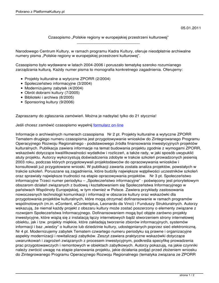 Pobrano z PlatformaKultury.pl 05.01.2011 Czasopismo „Polskie regiony w europejskiej przestrzeni kulturowej” ____________________________ Narodowego Centrum Kultury, w ramach programu Kadra Kultury, oferuje nieodpłatnie archiwalne numery pisma „Polskie regiony w europejskiej przestrzeni kulturowej”. Czasopismo było wydawane w latach 2004-2006 i poruszało tematykę szeroko rozumianego zarządzania kulturą. Każdy numer pisma to monografia konkretnego zagadnienia. Oferujemy: Projekty kulturalne a wytyczne ZPORR (2/2004) Społeczeństwo informacyjne (3/2004) Modernizujemy zabytek (4/2004) Obrót dobrami kultury (7/2005) Biblioteki i archiwa (8/2005) Sponsoring kultury (9/2006) Zapraszamy do zgłaszania zamówień. Można je nadsyłać tylko do 21 stycznia! Jeśli chcesz zamówić czasopismo wypełnij formularz on-line Informacje o archiwalnych numerach czasopisma Nr 2 pt. Projekty kulturalne a wytyczne ZPORR Tematem drugiego numeru czasopisma jest przygotowywanie wniosków do Zintegrowanego Programu Operacyjnego Rozwoju Regionalnego - podstawowego źródła finansowania inwestycyjnych projektów kulturalnych. Publikacja zawiera informacje na temat budowania projektu zgodnie z wymogami ZPORR, wskazówki dotyczące kwalifikowalności wydatków i rozliczeń, a także rady, w jaki sposób uwypuklić atuty projektu. Autorzy wykorzystują doświadczenia zdobyte w trakcie szkoleń prowadzonych jesienią 2003 roku, podczas których przygotowywali projektodawców do opracowywania wniosków i konsultowali już przygotowane wnioski. W publikacji zawarta została analiza projektów, powstałych w trakcie szkoleń. Poruszane są zagadnienia, które budziły największe wątpliwości uczestników szkoleń oraz sprawiały największe trudności na etapie opracowywania projektów. Nr 3 pt. Społeczeństwo informacyjne Trzeci numer periodyku – „Społeczeństwo informacyjne” - poświęcony jest priorytetowym obszarom działań związanych z budową i kształtowaniem się Społeczeństwa Informacyjnego w państwach Wspólnoty Europejskiej, w tym również w Polsce. Zawiera przykłady zastosowania nowoczesnych technologii komunikacji i informacji w obszarze kultury oraz wskazówki dla przygotowania projektów kulturalnych, które mogą otrzymać dofinansowanie w ramach programów wspólnotowych (m.in. eContent, eContentplus, Leonardo da Vinci) i Funduszy Strukturalnych. Autorzy wskazują, że niemal każdy projekt z obszaru kultury może zostać poszerzony o elementy związane z rozwojem Społeczeństwa Informacyjnego. Dofinansowaniem mogą być objęte zarówno projekty inwestycyjne, które wiążą się z instalacją łączy internetowych bądź stworzeniem strony internetowej obiektu, jak i tzw. projekty miękkie, które zakładają tworzenie zbiorów informacyjnych, systemów informacji i baz „wiedzy” o kulturze lub dziedzinie kultury, udostępnianych poprzez sieć elektroniczną. Nr 4 pt. Modernizujemy zabytek Tematem czwartego numeru periodyku są prawne i organizacyjne aspekty modernizacji i rewitalizacji zabytków. Zeszyt zawiera praktyczne wskazówki dotyczące uwarunkowań i zagrożeń związanych z procesem inwestycyjnym, podkreśla specyfikę prowadzenia prac przygotowawczych i remontowych w obiektach zabytkowych. Autorzy pokazują, na jakie czynniki należy zwrócić uwagę na etapie planowania projektu, jakie działania podjąć przed złożeniem wniosku do Zintegrowanego Programu Operacyjnego Rozwoju Regionalnego (tematyka związana ze ZPORR strona 1 / 2 Pobrano z PlatformaKultury.pl została obszernie omówiona w numerze drugim periodyku) oraz przekazują praktyczne porady dotyczące procesu modernizacji. Nr 7 pt. Obrót dobrami kultury Siódmy numer czasopisma, poświecony zagadnieniom obrotu dóbr kultury, przedstawia praktyczne uwagi dotyczące legalnego wywozu dóbr kultury z Polski do krajów Unii Europejskiej i krajów trzecich (np. związanych z organizacją wystaw międzynarodowych), jak również omawia negatywne zjawisko nielegalnego handlu tymi dobrami. Pierwszy z prezentowanych artykułów opiera się na materiałach Regionalnego Biura Łącznikowego Wywiadu Celnego dla Europy Wschodniej i Środkowej Światowej Organizacji Ceł (Regional Intelligence Liaison Office for Eastern and Central Europe – RILO ECE), zlokalizowanego w Ministerstwie Finansów przy Departamencie Ceł i przedstawia zagadnienia dotyczące kontroli, przepływu informacji o skradzionych zabytkach i dziełach sztuki oraz innym działaniom zapobiegającym nielegalnemu obrotowi dobrami kultury. Drugi artykuł ma on stanowić czytelny poradnik dotyczący zasad i procedur wywozu dóbr kultury z Polski do krajów Unii Europejskiej oraz do krajów trzecich.. Podano w nim kategoryzację przedmiotów objętych ochroną w Polsce oraz na terenie całej Wspólnoty, przedstawiono instytucje wydające ekspertyzy i stosowne dokumenty wywozowe oraz określono zakres ich kompetencji. Omówione zostały również poszczególne formularze celne. Nr 8 pt. Biblioteki i archiwa W ósmym numerze czasopisma pragniemy zwrócić Państwa uwagę na kulturotwórczą rolę bibliotek oraz archiwów. W publikacji zostały przedstawione trzy artykuły przedstawiające te instytucje, jako placówki sprzyjające podtrzymaniu lokalnych tradycji. Pierwszy, zatytułowany Biblioteki publiczne jako miejsce zdobywania wiedzy i integracji społeczno – kulturalnej podejmuje temat roli bibliotek w budowie społeczeństwa obywatelskiego, na przykładzie środowisk małych miast i wsi. Drugi – Książnica Kopernikańska w Toruniu – jest przykładem zastosowania idei w praktyce. Trzeci atrykuł, Archiwa polskie w dobie społeczeństwa informacyjnego, omawia potencjał archiwów w zakresie budowy społeczeństwa opartego na wiedzy. Nr 9 pt. Sponsoring kultury Dziewiąty numer czasopisma porusza tematykę sponsoringu kultury. Sponsoring otwiera nowe perspektywy zarówno dla podmiotów funkcjonujących w sektorze kultury, jak i dla f