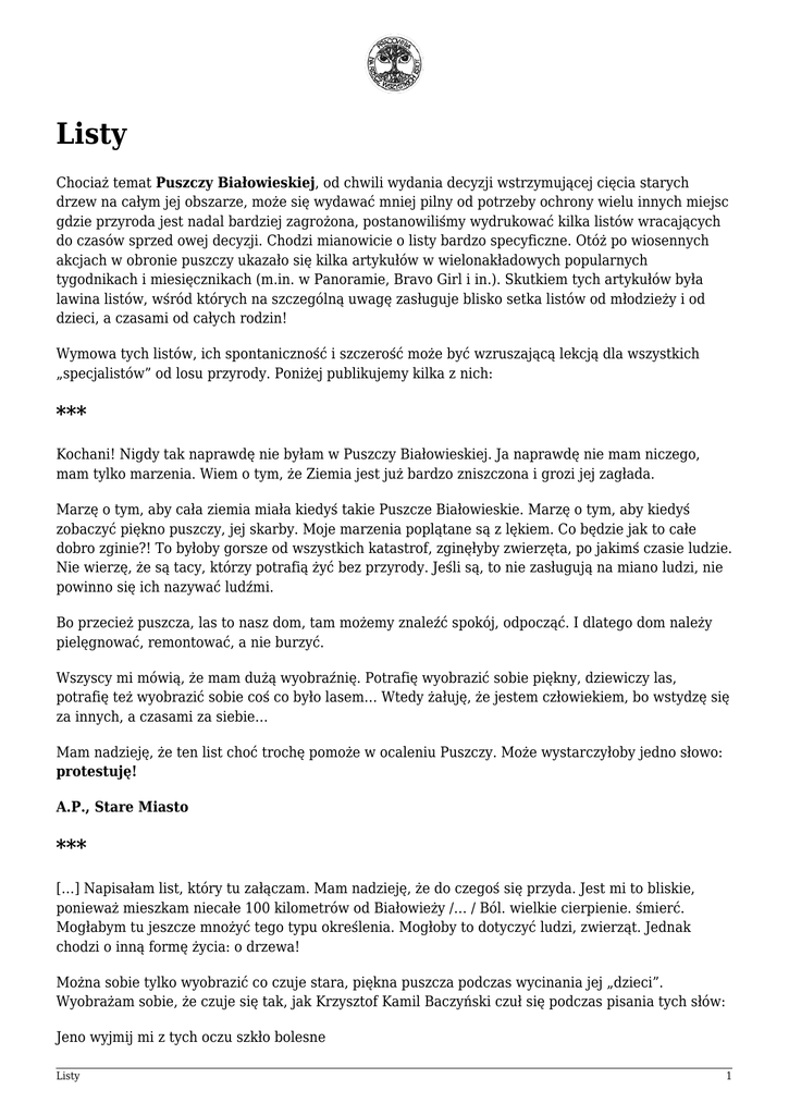 Listy Chociaż temat Puszczy Białowieskiej, od chwili wydania decyzji wstrzymującej cięcia starych drzew na całym jej obszarze, może się wydawać mniej pilny od potrzeby ochrony wielu innych miejsc gdzie przyroda jest nadal bardziej zagrożona, postanowiliśmy wydrukować kilka listów wracających do czasów sprzed owej decyzji. Chodzi mianowicie o listy bardzo specyficzne. Otóż po wiosennych akcjach w obronie puszczy ukazało się kilka artykułów w wielonakładowych popularnych tygodnikach i miesięcznikach (m.in. w Panoramie, Bravo Girl i in.). Skutkiem tych artykułów była lawina listów, wśród których na szczególną uwagę zasługuje blisko setka listów od młodzieży i od dzieci, a czasami od całych rodzin! Wymowa tych listów, ich spontaniczność i szczerość może być wzruszającą lekcją dla wszystkich „specjalistów” od losu przyrody. Poniżej publikujemy kilka z nich: *** Kochani! Nigdy tak naprawdę nie byłam w Puszczy Białowieskiej. Ja naprawdę nie mam niczego, mam tylko marzenia. Wiem o tym, że Ziemia jest już bardzo zniszczona i grozi jej zagłada. Marzę o tym, aby cała ziemia miała kiedyś takie Puszcze Białowieskie. Marzę o tym, aby kiedyś zobaczyć piękno puszczy, jej skarby. Moje marzenia poplątane są z lękiem. Co będzie jak to całe dobro zginie?! To byłoby gorsze od wszystkich katastrof, zginęłyby zwierzęta, po jakimś czasie ludzie. Nie wierzę, że są tacy, którzy potrafią żyć bez przyrody. Jeśli są, to nie zasługują na miano ludzi, nie powinno się ich nazywać ludźmi. Bo przecież puszcza, las to nasz dom, tam możemy znaleźć spokój, odpocząć. I dlatego dom należy pielęgnować, remontować, a nie burzyć. Wszyscy mi mówią, że mam dużą wyobraźnię. Potrafię wyobrazić sobie piękny, dziewiczy las, potrafię też wyobrazić sobie coś co było lasem… Wtedy żałuję, że jestem człowiekiem, bo wstydzę się za innych, a czasami za siebie… Mam nadzieję, że ten list choć trochę pomoże w ocaleniu Puszczy. Może wystarczyłoby jedno słowo: protestuję! A.P., Stare Miasto *** […] Napisałam list, który tu załączam. Mam nadzieję, że do czegoś się przyda. Jest mi to bliskie, ponieważ mieszkam niecałe 100 kilometrów od Białowieży /… / Ból. wielkie cierpienie. śmierć. Mogłabym tu jeszcze mnożyć tego typu określenia. Mogłoby to dotyczyć ludzi, zwierząt. Jednak chodzi o inną formę życia: o drzewa! Można sobie tylko wyobrazić co czuje stara, piękna puszcza podczas wycinania jej „dzieci”. Wyobrażam sobie, że czuje się tak, jak Krzysztof Kamil Baczyński czuł się podczas pisania tych słów: Jeno wyjmij mi z tych oczu szkło bolesne Listy 1 obraz dni, które czaszki białe toczy przez płonące łąki krwi. Jeno odmień czas kaleki, zakryj groby płaszczem rzeki; zetrzyj z włosów pył bitewny, tych lat gniewnych – czarny pył. To, co teraz napiszę jest bardzo oklepane, ale cóż: Fakt, że każdy kiedyś umrze. My umrzemy za x lat, ale po nas zostaną nasze dzieci, wnuki. I co dla nich zostanie? Jeśli ktoś tego nie rozumie, albo nie chce zrozumieć, to jest wielkim PROSTAKIEM. Przepraszam, ale nie mogę się powstrzymać. Błagam wszystkich tych, którzy są odpowiedzialni za te zbrodnie i tych, którzy mogą im zapobiec Nie bądźcie prostakami! Nie zabijajcie! I już na zakończenie dodam tylko, że Hitler kiedyś powiedział: „Żeby zabić naród, trzeba mu najpierw odebrać kulturę i pamięć o przeszłości”. A żeby zabić drzewo wystarczy je ściąć. Ono umrze szybciej niż jakikolwiek naród. Dorota, Siemiatycze *** Zastanawiam się, jak będzie wyglądał XXV wiek? Moim zdaniem, jeśli nie zaczniemy żyć inaczej, słowo „drzewo” będzie dla młodego pokolenia czymś tak odległym, jak dla nas dinozaury. Mam 16 lat i patrząc co się wokół dzieje mam wrażenie, że starsze pokolenie chce nas zniszczyć. Wycinając lasy okaleczacie Ziemię! Dlaczego chcecie przerobić na deski piękne stare dęby, które pamiętają jeszcze czasy królów polskich? Czy naprawdę przeszkadzają wam zwierzęta żyjące w puszczy? Błagam, zostawcie w spokoju całą Puszczę Białowieską, pozwólcie cieszyć się życiem żubrom, sarnom, dzikom. Wtargnęliście w ich życie, niszczycie ich dom i ich samych. Czy naprawdę nikt nie dostrzega, że przyroda woła o pomoc? Od was zależy, czy pozwolicie jej zginąć, czy też pomożecie. Gośka, Augustów *** Zwracamy się do Państwa, gdyż bardzo poruszyła nas cała akcja protestacyjna propagująca ochronę Puszczy Białowieskiej […] Czyż nie jest ironią fakt, że my Polacy, którym dane zostało żyć w jednej z ostatnich „zielonych oaz” na tej ziemi, zamiast bronić tego co jeszcze nam pozostało, sami bezmyślnie niszczymy przyrodę? Przecież postęp winien chyba wiązać się z coraz to bardziej ekonomicznymi, a przede wszystkim ekologicznymi posunięciami, a nie jak to było praktykowane z coraz mniej przemyślanymi decyzjami będącymi skutkiem zniewalającej roli pieniądza! Jeszcze raz więc podkreślamy swój stanowczy protest przeciwko niszczeniu czegoś co należy do wszystkich ludzi. Jakim prawem ktoś wycina las, który jest taką samą własnością moją, naszą, waszą, jak i tych drwali i właścicieli tartaków. Zostawcie w spokoju nasze wspólne dobra. Nie zabijajcie naszych zielonych płuc! Magdalena, Marta, Alicja, Bogdan, Kraków Listy 2 *** Postanowiłam, że do Was napiszę. Przecież oni wszystko zniszczą! Kiedy będą tak strzelać do zwierząt i wycinać drzewa, w Polsce nie będzie w ogóle ładnych lasów. Przecież to wszystko daje tylko natura, tylko natura, nic więcej! Wiem to, bo mam już legitymację Ligi Ochrony Przyrody. Niedaleko mojego domu jest las i mała rzeczka. Chodzę tam czasami i podobno w tych lasach są łosie! Z., Grotniki *** W tym liście chcę zaprotestować i równocześnie prosić o to, aby ludzie, którzy niszczą lasy i zabijają tamtejs