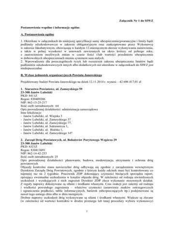 Załącznik Nr 1 do SIWZ Postanowienia wspólne i informacje ogólne A. Postanowienia ogólne 1. Określone w załącznikach do niniejszej specyfikacji sumy ubezpieczenia/gwarancyjne i limity bądź podlimity odszkodowawcze w zakresie obligatoryjnym oraz zaakceptowane przez Wykonawcę w zakresie fakultatywnym, obowiązują w każdym 12-miesięcznym okresie wykonywania zamówienia, a także w pełnej wysokości w umowach zawieranych na okres krótszy od pełnego roku, z zastrzeżeniem możliwych zmian w czasie ilości i/lub wartości przedmiotu ubezpieczenia w dobrowolnych ubezpieczeniach mienia systemem sum stałych. 2. Wprowadzenie dla poszczególnych ryzyk lub rozszerzeń zakresu ubezpieczenia limitów bądź podlimitów odszkodowawczych innych albo dodatkowych niż określone w załącznikach do SIWZ jest niedopuszczalne B. Wykaz jednostek organizacyjnych Powiatu Janowskiego Projektowany budżet Powiatu Janowskiego na dzień 12.11.2014 r. wynosi – 42 696 417,01 zł 1. Starostwo Powiatowe, ul. Zamoyskiego 59 23-300 Janów Lubelski PKD: 8411Z Regon: 830409206 NIP: 862-15-25-217 Ilość osób zatrudnionych: 64 Opis prowadzonej działalności: administracja samorządowa Inne lokalizacje: - Janów Lubelski, ul. Wiejska 3 - Janów Lubelski, ul. Zamoyskiego 37 - Janów Lubelski, ul. Zamoyskiego 77, - Janów Lubelski, ul. Sukiennicza 1, - Janów Lubelski, ul. Bialska 1, - Janów Lubelski, ul. Zamoyskiego 147 2. Zarząd Dróg Powiatowych, ul. Bohaterów Porytowego Wzgórza 29 23-300 Janów Lubelski PKD: 6321Z Regon: 830413691 NIP: 862-14-42-253 Ilość osób zatrudnionych: 25 Opis prowadzonej działalności: planowanie, budowa, modernizacja, utrzymanie i ochrona dróg powiatowych Objazdy kontrolne stanu nawierzchni dróg odbywają się zgodnie z zarządzeniem wewnętrznym Dyrektora Zarządu Dróg Powiatowych, zgodnie z którym każdy odcinek musi być kontrolowany co najmniej raz na 2 tygodnie. Pracownik ZDP dokonujący czynności bieżących sporządza raport, opisujący ewentualne uszkodzenia w księdze objazdu dróg. W zależności od rodzaju stwierdzonych uszkodzeń i wynikających z nich zagrożeń Dyrektor ZDP zleca wykonanie stosownych działań. Z reguły naprawy dokonywane są siłami i środkami własnymi. Czas reakcji jest zależny od rodzaju i wielkości powstałego zagrożenia – właściwe czynności (ustawienie znaków ostrzegawczych i ograniczenia prędkości, tablic informacyjnych, barierek zabezpieczających itp.) podejmowane są nawet tego samego dnia albo w dniu następnym. Drobne naprawy uszkodzeń dróg wykonywane są siłami i środkami własnymi. Większe są zlecane (w zależności od wartości kontraktu w drodze przetargu lub innej procedury wyboru wykonawcy) 1 podmiotom zewnętrznym, od których żąda się posiadania ubezpieczenia odpowiedzialności cywilnej. Nie ma stałych wykonawców robót – na każde wybierani są w drodze odrębnej procedury. 3. Powiatowy Urząd Pracy, ul. Zamoyskiego 70 23-300 Janów Lubelski PKD: 7513 Z Regon: 431205613 NIP: 862-100-75-92 Ilość osób zatrudnionych: 24,5 etatu Opis prowadzonej działalności: usługi dla ludności dotyczące rynku pracy 4. Powiatowy Inspektorat Nadzoru Budowlanego, ul. Zamoyskiego 59 23-300 Janów Lubelski PKD: 7513Z Regon: 830414035 NIP:862-144-31-23 Ilość osób zatrudnionych: 5 Opis prowadzonej działalności: działalność usługowa – nadzór budowlany 5. „BARKA” Dom Pomocy Społecznej im. Jana Pawła II , ul. Wiejska 12 23-300 Janów Lubelski PKD: 8531Z / 8790Z Regon: 0000294131 NIP:862-111-15-04 Ilość osób zatrudnionych: 95 Opis prowadzonej działalności: całodobowa opieka nad osobami niepełnosprawnymi wraz z wyżywieniem. 6. Poradnia Psychologiczno-Pedagogiczna, ul. Zamoyskiego 77 23-300 Janów Lubelski PKD: 8560Z Regon: 000902665 NIP:862-10-07-617 Ilość osób zatrudnionych: 11, w tym 9 nauczycieli Opis prowadzonej działalności: diagnoza i terapia dzieci i młodzieży, udzielenie pomocy rodzicom, nauczycielom, wychowawcom, dzieciom od urodzenia do 25 r. życia 7. Powiatowe Centrum Pomocy Rodzinie, ul. Ogrodowa 20 23-300 Janów Lubelski PKD : 8899Z Regon : 830414041 NIP : 862 14 43 672 Ilość osób zatrudnionych: 9 Opis prowadzonej działalności : pozostała opieka wychowawcza i społeczna bez zakwaterowania 8. Placówka Opiekuńczo- Wychowawcza „PROMYK” w Janowie Lubelskim, ul. Jana Pawła II 10 23-300 Janów Lubelski Regon: 060020929 NIP: 8621581813 Ilość osób zatrudnionych: 20 Opis prowadzonej działalności: całodobowa opieka wychowawcza z zakwaterowaniem i wyżywieniem. 9. Liceum Ogólnokształcące im. Bohaterów portowego Wzgórza , ul. Jana Pawła II nr 1 2 23-300 Janów Lubelski PKD: 8531B Regon: 00071905600000 NIP:862-10-10-186 Ilość osób zatrudnionych: 64, w tym 54 nauczycieli Opis prowadzonej działalności: edukacyjna i wychowawcza, kształcenie młodzieży. 10. Zespół Szkół ul. Zamoyskiego 68, ul. Wyszyńskiego 33 23-300 Janów Lubelski PKD: 8560Z Regon: 830184724 NIP:862-10-07-793 Ilość osób zatrudnionych: 53, w tym 47 nauczycieli Opis prowadzonej działalności: edukacyjna, wychowawca, kształcenie młodzieży. 11. Zespół Szkół Zawodowych, ul. Ogrodowa 20 23-300 Janów Lubelski PKD: 8560Z Regon: 000184862 NIP:862-100-6546 Ilość osób zatrudnionych: 67, w tym 51 nauczycieli Opis prowadzonej działalności: działalność edukacyjna, wychowawcza i opiekuńcza. 12. Środowiskowy Dom Samopomocy w Janowie Lubelskim, ul. Kilińskiego 30 23-300 Janów Lubelski PKD: 8899Z Regon: 060299529 NIP: 862-161-17-50 Ilość osób zatrudnionych: 10 Opis prowadzonej działalności: pomoc społeczna – ośrodek wsparcia dla osób z zaburzeniami psychicznymi 13. Powiatowy Zespół Obsługi Szkół i Placówek Oświatowych, ul. Zamoyskiego 59 23-300 Janów Lubelski PKD: 6920Z Regon: 060354122 NIP: 862-161-52-22 Ilość osób zatrudnionych: 6 Opis prowadzonej działalności: obsługa księgowa szkół i placówek oświatowych, obsługa finansowa 14. Ośrodek 