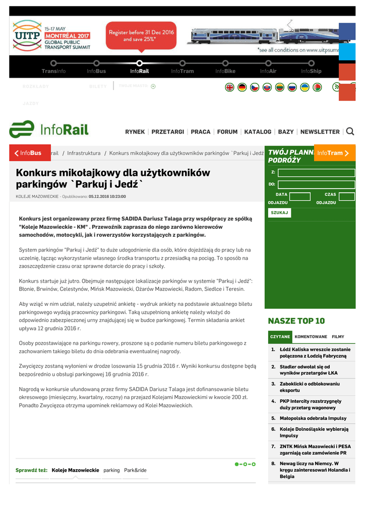 TransInfo ROZKŁADY InfoBus InfoRail BILETY TWOJE MIASTO: InfoTram InfoBike InfoAir InfoShip r g JAZDY RYNEK PRZETARGI PRACA FORUM KATALOG BAZY NEWSLETTER Jesteś InfoBus tutaj: Inforail / Infrastruktura / Konkurs mikołajkowy dla użytkowników parkingów `Parkuj i Jedź` TWÓJ PLANNER InfoTram PODRÓŻY Konkurs mikołajkowy dla użytkowników parkingów `Parkuj i Jedź` Z: DO: DATA CZAS ODJAZDU ODJAZDU KOLEJE MAZOWIECKIE - Opublikowano: 05.12.2016 10:23:00 SZUKAJ Konkurs jest organizowany przez firmę SADIDA Dariusz Talaga przy współpracy ze spółką "Koleje Mazowieckie - KM" . Przewoźnik zaprasza do niego zarówno kierowców samochodów, motocykli, jak i rowerzystów korzystających z parkingów. System parkingów "Parkuj i Jedź" to duże udogodnienie dla osób, które dojeżdżają do pracy lub na uczelnię, łącząc wykorzystanie własnego środka transportu z przesiadką na pociąg. To sposób na zaoszczędzenie czasu oraz sprawne dotarcie do pracy i szkoły. Konkurs startuje już jutro. Obejmuje następujące lokalizacje parkingów w systemie "Parkuj i Jedź": Błonie, Brwinów, Celestynów, Mińsk Mazowiecki, Ożarów Mazowiecki, Radom, Siedlce i Teresin. Aby wziąć w nim udział, należy uzupełnić ankietę - wydruk ankiety na podstawie aktualnego biletu parkingowego wydają pracownicy parkingowi. Taką uzupełnioną ankietę należy włożyć do odpowiednio zabezpieczonej urny znajdującej się w budce parkingowej. Termin składania ankiet upływa 12 grudnia 2016 r. NASZE TOP 10 CZYTANE KOMENTOWANE FILMY Osoby pozostawiające na parkingu rowery, proszone są o podanie numeru biletu parkingowego z zachowaniem takiego biletu do dnia odebrania ewentualnej nagrody. 1. Zwycięzcy zostaną wyłonieni w drodze losowania 15 grudnia 2016 r. Wyniki konkursu dostępne będą bezpośrednio u obsługi parkingowej 16 grudnia 2016 r. 2. Stadler odwołał się od wyników przetargów ŁKA Nagrodą w konkursie ufundowaną przez firmy SADIDA Dariusz Talaga jest dofinansowanie biletu okresowego (miesięczny, kwartalny, roczny) na przejazd Kolejami Mazowieckimi w kwocie 200 zł. Ponadto Zwycięzca otrzyma upominek reklamowy od Kolei Mazowieckich. Łódź Kaliska wreszcie zostanie połączona z Łodzią Fabryczną 3. Zaboklicki o odblokowaniu eksportu 4. PKP Intercity rozstrzygnęły duży przetarg wagonowy 5. Małopolska odebrała Impulsy 6. Koleje Dolnośląskie wybierają Impulsy 7. ZNTK Mińsk Mazowiecki i PESA zgarniają całe zamówienie PR Sprawdź też: Koleje Mazowieckie parking Park&ride 8. Newag liczy na Niemcy. W kręgu zainteresowań Holandia i Belgia 9. PaFaWag – wizytówka Wrocławia w PRL 10. Jakubas: Nie zamierzam sprzedawać akcji Newagu 28.11.2016 28.11.2016 24.11.2016 22.11.2016 15.11.2016 Co nowego w rozkładzie jazdy Kolei Mazowieckich? Dragon i Słoneczny w nowym rozkładzie jazdy Myjnia Kolei Mazowieckich doceniona za Koleje Mazowieckie szykują przetarg przewyższający 21 zmodernizowanych ezt-ów na linii do NEWSLETTER ZAPISZ Komentarze przez FB Komentarze (0) REDAKCJA Aleksander Kierecki Redaktor naczelny [email protected] +48 506 03 71 71 +48 71 750 19 76 Dodaj komentarz TWÓJ KOMENTARZ: AUTOR: Karol Wach Redaktor prowadzący [email protected] +48 506 506 226 +48 71 750 19 76 WYŚLIJ PRZEGLĄD PRASY INFORMACJA PRZETARGOWA InfoBus nie ponosi odpowiedzialności za treść zamieszczanych komentarzy. Mechanizm komentowania służy merytorycznej dyskusji dotyczącej informacji oraz materiałów umieszczanych w portalu infobus.pl. Pragnąc przestrzegać obowiązującego prawa oraz zachować merytoryczny charakter dyskusji informujemy, że komentarze pozamerytoryczne, obraźliwe, utrzymane w tonie lekceważącym osoby trzecie lub zawierające jednoznaczne oskarżenia wobec tych osób będą usuwane. InfoBus zastrzega również sobie prawo redakcji bądź skrótów pojawiających się na portalu opinii. Firma „JMK analizy rynku transportowego” oferuje na bieżąco aktualizowaną informację przetargową w zakresie dostaw taboru szynowego, autobusowego oraz obsługi linii komunikacyjnych. Wykup dostęp on-line! ANALIZA RYNKOWA Aktualizowane co miesiąc raporty na temat liczby zarejestrowanych nowych oraz używanych autobusów w Polsce to kompendium wiedzy na temat tego segmentu gospodarki. Analizy zawierają m.in. szczegółowe... REKLAMA Sprawdź nasz nowy cennik reklamowy na rok 2017 InfoBus ma 15 lat.Portal TransInfo.pl działa od 2001 roku. Początkowo - pod nazwą InfoBus.pl zajmował się tylko tematyką autobusową. Wraz z rosną... KATALOGI 2016 2015 FOTO 2014 VIDEO 2013 2012 2011 2010 2009 2008 2007 2006 2005 Luxtorpeda 2.0 - czy doczekamy się szybkich i tanich pociągów? [FILM] Na przejeździe [FILM] PESA podpisuje list intencyjny z PKP Intercity [FILM] Połączenie kolejowe, które zbliża do siebie dwa kontynenty [FILM] 21.10.2016 12.10.2016 06.10.2016 30.09.2016 RYNEK PRZETARGI PRACA BLOGI FORUM KATALOGI NEWSLETTER @ 2015 Wszystkie prawa zastrzeżone Monolit Media REDAKCJA