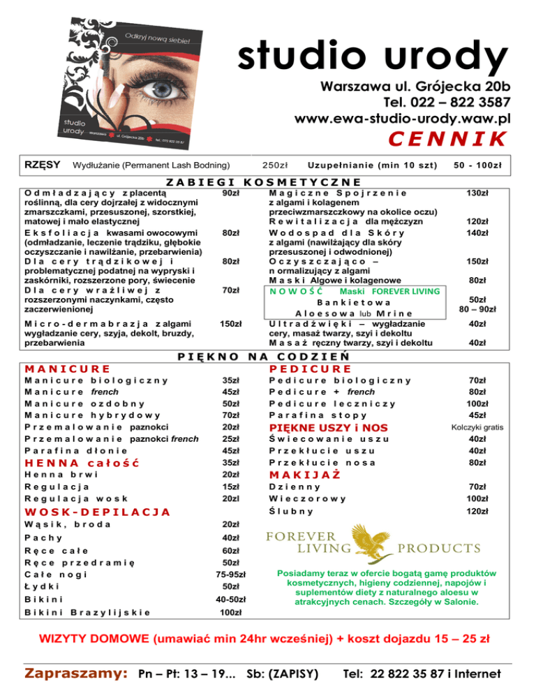 studio urody Warszawa ul. Grójecka 20b Tel. 022 – 822 3587 www.ewa-studio-urody.waw.pl CENNIK RZĘSY Wydłużanie (Permanent Lash Bodning) 250zł Uzu p eł n i an i e (min 10 szt ) 50 - 100zł ZABIEGI KOSMETYCZNE O d m ł a d z a j ą c y z placentą roślinną, dla cery dojrzałej z widocznymi zmarszczkami, przesuszonej, szorstkiej, matowej i mało elastycznej E k s f o l i a c j a kwasami owocowymi (odmładzanie, leczenie trądziku, głębokie oczyszczanie i nawilżanie, przebarwienia) Dla cery trądzikowej i problematycznej podatnej na wypryski i zaskórniki, rozszerzone pory, świecenie Dla cery wrażliwej z rozszerzonymi naczynkami, często zaczerwienionej 90zł M i c r o - d e r m a b r a z j a z algami wygładzanie cery, szyja, dekolt, bruzdy, przebarwienia 150zł MANICURE Henna brwi Regulacja Regulacja wosk 80zł 70zł Bankietowa A l o e s o w a lub M r i n e 35zł 45zł 50zł 70zł 20zł 25zł 45zł 35zł 20zł 15zł 20zl WOSK-DEPILACJA Wąsik, broda 20zł Pachy 40zł Ręce całe Ręce przedramię Całe nogi Łydki 60zł 50zł 75-95zł 50zł Bikini 40-50zł Bikini Brazylijskie U l t r a d ź w i ę k i – wygładzanie cery, masaż twarzy, szyi i dekoltu M a s a ż ręczny twarzy, szyi i dekoltu 130zł 120zł 140zł 150zł 80zł 50zł 80 – 90zł 40zł 40zł PIĘKNO NA CODZIEŃ PEDICURE Manicure biologiczny M a n i c u r e french Manicure ozdobny Manicure hybrydowy P r z e m a l o w a n i e paznokci P r z e m a l o w a n i e paznokci french Parafina dłonie HENNA całość 80zł Magiczne Spojrzenie z algami i kolagenem przeciwzmarszczkowy na okolice oczu) R e w i t a l i z a c j a dla mężczyzn Wodospad dla Skóry z algami (nawilżający dla skóry przesuszonej i odwodnionej) Oczyszczająco – n ormalizujący z algami M a s k i Algowe i kolagenowe NOWOŚĆ Maski FOREVER LIVING P P P P edicure edicure edicure arafina biologiczny + french leczniczy stopy 70zł 80zł 100zł 45zł PIĘKNE USZY i NOS Kolczyki gratis Świecowanie uszu Przekłucie uszu Przekłucie nosa 40zł 40zł 80zł MAKIJAŻ Dzienny Wieczorowy 70zł 100zł Ślubny 120zł Posiadamy teraz w ofercie bogatą gamę produktów kosmetycznych, higieny codziennej, napojów i suplementów diety z naturalnego aloesu w atrakcyjnych cenach. Szczegóły w Salonie. 100zł WIZYTY DOMOWE (umawiać min 24hr wcześniej) + koszt dojazdu 15 – 25 zł Zapraszamy: Pn – Pt: 13 – 19... Sb: (ZAPISY) Tel: 22 822 35 87 i Internet