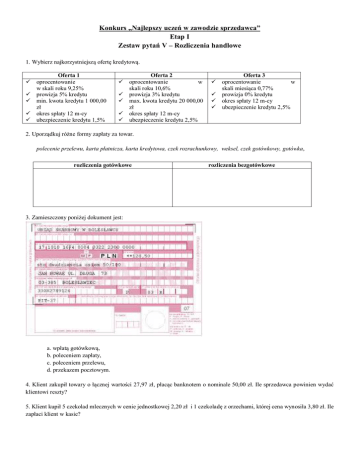 Konkurs „Najlepszy ucze w zawodzie sprzedawca” Etap I Zestaw pyta V – Rozliczenia handlowe 1. Wybierz najkorzystniejsz ofert kredytow . Oferta 1 oprocentowanie w skali roku 9,25% prowizja 5% kredytu min. kwota kredytu 1 000,00 Oferta 2 oprocentowanie w skali roku 10,6% prowizja 3% kredytu max. kwota kredytu 20 000,00 okres sp aty 12 m-cy ubezpieczenie kredytu 1,5% okres sp aty 12 m-cy ubezpieczenie kredytu 2,5% Oferta 3 oprocentowanie w skali miesi ca 0,77% prowizja 0% kredytu okres sp aty 12 m-cy ubezpieczenie kredytu 2,5% 2. Uporz dkuj ró ne formy zap aty za towar. polecenie przelewu, karta p atnicza, karta kredytowa, czek rozrachunkowy, weksel, czek gotówkowy, gotówka, rozliczenia gotówkowe rozliczenia bezgotówkowe 3. Zamieszczony poni ej dokument jest: a. wp at gotówkow , b. poleceniem zap aty, c. poleceniem przelewu, d. przekazem pocztowym. 4. Klient zakupi towary o klientowi reszty? cznej warto ci 27,97 z , p ac c banknotem o nominale 50,00 z . Ile sprzedawca powinien wyda 5. Klient kupi 5 czekolad mlecznych w cenie jednostkowej 2,20 z i 1 czekolad z orzechami, której cena wynosi a 3,80 z . Ile zap aci klient w kasie? 6. Faktur koryguj wystawia si w sytuacji, gdy na fakturze sprzeda y b dnie wpisano: a. numer kolejny faktury, b. numer NIP nabywcy, c. ceny sprzedanych towarów, d. adres nabywcy. 7. Zgodnie z poni szym rozliczeniem kasjer na zako czenie dnia pracy powinien mie w kasie: - stan pocz tkowy gotówki w kasie – - inkaso nale no ci gotówk – - p atno ci kart kredytow - wyp ata gotówki z kasy (zap ata za faktur VAT nr 13/2015) – - zwrot gotówki klientom – 150,00 z 1500,00 z 800,00 z 550,00 z 20,00 z stan ko cowy gotówki w kasie to: a. 1080,00 z , b. 1880,00 z , c. 2980,00 z , d. 3000,00 z . 8. Potwierdzeniem sprzeda y towarów jest: a. faktura VAT, b. raport kasowy, c. polecenie zap aty, d. polecenie przelewu. 9. Sprzedawca, który nie jest podatnikiem podatku VAT, jako potwierdzenie sprzeda y wystawia: a. rachunek, b. faktur pro forma, c. faktur VAT, d. polecenie przelewu. 10.Odprowadzenie utargu do banku za po rednictwem poczty wymaga wype nienia: a. polecenia zap aty, b. polecenia przelewu, c. przekazu pocztowego na rachunek, d. przekazu pocztowego na adres odbiorcy. Odpowiedzi na pytania konkursu mo na dostarcza w jednej wersji (do wyboru): napisane w asnor cznie, lub przesy aj c je na adres e-mail [email protected] Uczestnik musi poda swoje imi i nazwisko, klas . Termin zg osze : 3 marca 2015r. Organizator konkursu: Anna Bara ska
