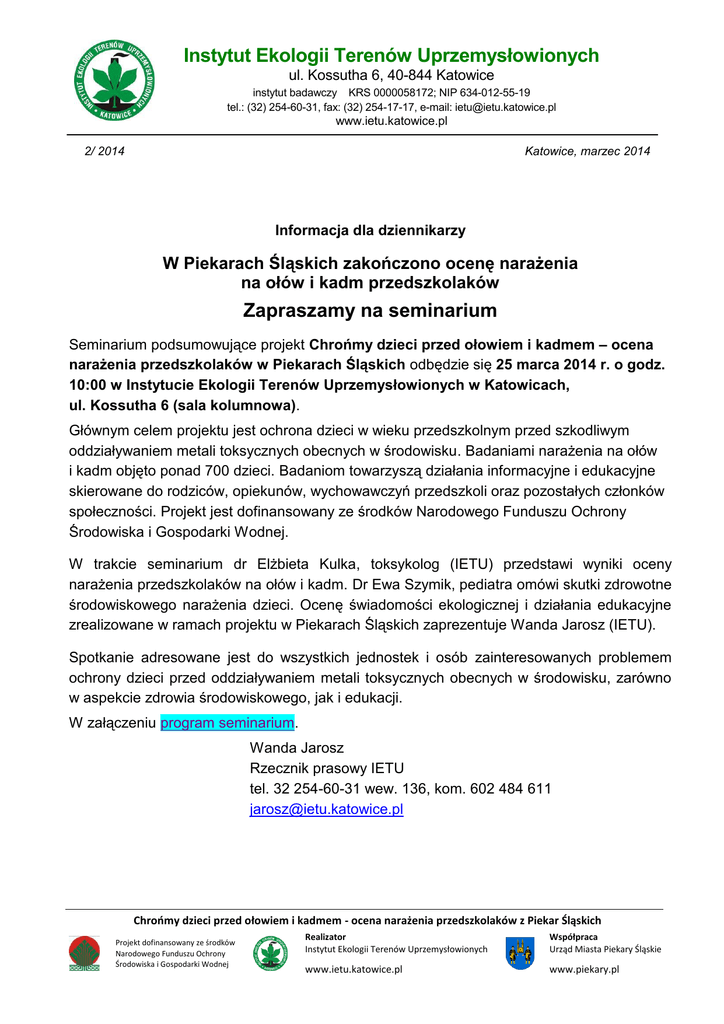 Instytut Ekologii Terenów Uprzemysłowionych ul. Kossutha 6, 40-844 Katowice instytut badawczy KRS 0000058172; NIP 634-012-55-19 tel.: (32) 254-60-31, fax: (32) 254-17-17, e-mail: [email protected] www.ietu.katowice.pl 2/ 2014 Katowice, marzec 2014 Informacja dla dziennikarzy W Piekarach Śląskich zakończono ocenę narażenia na ołów i kadm przedszkolaków Zapraszamy na seminarium Seminarium podsumowujące projekt Chrońmy dzieci przed ołowiem i kadmem – ocena narażenia przedszkolaków w Piekarach Śląskich odbędzie się 25 marca 2014 r. o godz. 10:00 w Instytucie Ekologii Terenów Uprzemysłowionych w Katowicach, ul. Kossutha 6 (sala kolumnowa). Głównym celem projektu jest ochrona dzieci w wieku przedszkolnym przed szkodliwym oddziaływaniem metali toksycznych obecnych w środowisku. Badaniami narażenia na ołów i kadm objęto ponad 700 dzieci. Badaniom towarzyszą działania informacyjne i edukacyjne skierowane do rodziców, opiekunów, wychowawczyń przedszkoli oraz pozostałych członków społeczności. Projekt jest dofinansowany ze środków Narodowego Funduszu Ochrony Środowiska i Gospodarki Wodnej. W trakcie seminarium dr Elżbieta Kulka, toksykolog (IETU) przedstawi wyniki oceny narażenia przedszkolaków na ołów i kadm. Dr Ewa Szymik, pediatra omówi skutki zdrowotne środowiskowego narażenia dzieci. Ocenę świadomości ekologicznej i działania edukacyjne zrealizowane w ramach projektu w Piekarach Śląskich zaprezentuje Wanda Jarosz (IETU). Spotkanie adresowane jest do wszystkich jednostek i osób zainteresowanych problemem ochrony dzieci przed oddziaływaniem metali toksycznych obecnych w środowisku, zarówno w aspekcie zdrowia środowiskowego, jak i edukacji. W załączeniu program seminarium. Wanda Jarosz Rzecznik prasowy IETU tel. 32 254-60-31 wew. 136, kom. 602 484 611 [email protected] Chrońmy dzieci przed ołowiem i kadmem - ocena narażenia przedszkolaków z Piekar Śląskich Projekt dofinansowany ze środków Narodowego Funduszu Ochrony Środowiska i Gospodarki Wodnej Realizator Instytut Ekologii Terenów Uprzemysłowionych Współpraca Urząd Miasta Piekary Śląskie www.ietu.katowice.pl www.piekary.pl Background Instytut Ekologii Terenów Uprzemysłowionych w Katowicach (IETU) we współpracy z Urzędem Miasta w Piekarach Śląskich realizuje projekt „Chrońmy dzieci przed ołowiem i kadmem - ocena narażenia przedszkolaków w Piekarach Śląskich”. Projekt jest dofinansowany ze środków Narodowego Funduszu Ochrony Środowiska i Gospodarki Wodnej. Ołów i kadm to metale wyjątkowo toksyczne dla organizmu człowieka, a więc każda ich ilość w organizmie jest niepożądana. Badaniami objęto ponad 700 dzieci w wieku 4-6 lat, uczęszczających do przedszkoli w Piekarach Śląskich. Stężenia ołowiu i kadmu oznaczone w próbce krwi oraz badanie lekarskie stanowią najlepszą podstawę do oceny narażenia dziecka. Ponadto rodzice wypełnili ankietę na temat warunków bytowych. Badaniom towarzyszą działania informacyjne i edukacyjne skierowane do rodziców, opiekunów, wychowawczyń przedszkolnych oraz dzieci. Wskaźnikami narażenia organizmu na metale toksyczne są ich stężenia w materiale biologicznym we krwi i w moczu. Wyniki badań monitoringu biologicznego umożliwiają definiowanie działań ochronnych ukierunkowanych na określone grupy populacji lub poszczególne osoby. Zagrożenie dla organizmu dziecka wynika z obecności metali w poszczególnych elementach środowiska, w glebie, pyle ulicznym, piasku w piaskownicach, powietrzu atmosferycznym i wewnątrz pomieszczeń, kurzu w mieszkaniach, szkołach, przedszkolach. Narażenie dziecka nawet na niskie stężenia tych metali może powodować trwałe zaburzenia zdrowia oraz ograniczać rozwój umysłowy i fizyczny dziecka. Metale toksyczne działają w organizmie dziecka na wiele układów i narządów, ale najbardziej niebezpieczny jest ich wpływ na funkcjonowanie układu nerwowego (mózgu) i układu krwiotwórczego. Działania ołowiu i kadmu w organizmie dziecka określane są jako podstępne, ponieważ względnie niskie dawki metali wnikające do organizmu dziecka na ogół nie wywołują specyficznych objawów chorobowych, a obserwowane zaburzenia funkcjonowania organizmu bardzo często przypisywane są innym czynnikom. Informacja o realizatorze Instytut Ekologii Terenów Uprzemysłowionych od 40. lat prowadzi badania zanieczyszczenia środowiska metalami ciężkimi, głównie ołowiem, kadmem i rtęcią, oraz narażenia zdrowia ludzi, a szczególnie dzieci na oddziaływanie tych metali. Jednocześnie podejmuje działania zmierzające do włączenia procedur analizy, oceny ryzyka do zarządzania środowiskiem w celu ograniczenia narażenia na zanieczyszczenia środowiskowe. Chrońmy dzieci przed ołowiem i kadmem - ocena narażenia przedszkolaków z Piekar Śląskich Projekt dofinansowany ze środków Narodowego Funduszu Ochrony Środowiska i Gospodarki Wodnej Realizator Instytut Ekologii Terenów Uprzemysłowionych Współpraca Urząd Miasta Piekary Śląskie www.ietu.katowice.pl www.piekary.pl