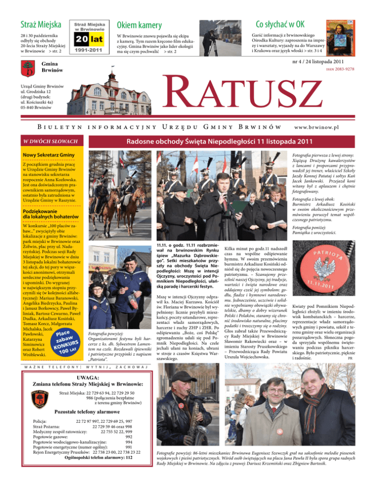 Straż Miejska Okiem kamery 28 i 30 października odbyły się obchody 20-lecia Straży Miejskiej w Brwinowie > str. 2 W Brwinowie znowu pojawiła się ekipa z kamerą. Tym razem kręcono film edukacyjny. Gmina Brwinów jako lider ekologii ma się czym pochwalić > str. 2 Co słychać w OK Garść informacji z brwinowskiego Ośrodka Kultury: zaproszenia na imprezy i warsztaty, wyjazdy na do Warszawy i Krakowa oraz język włoski > str. 3 i 4 nr 4 / 24 listopada 2011 RAtusz Gmina Brwinów Urząd Gminy Brwinów ul. Grodziska 12 (drugi budynek: ul. Kościuszki 4a) 05-840 Brwinów Biuletyn informacyjny Urzędu Gminy Brwinów Nowy Sekretarz Gminy Fotografia pierwsza z lewej strony: Xiążęcą Drużynę kawalerzystów z lancami i proporcami przyprowadził jej trener, właściciel Szkoły Jazdy Konnej Patataj i sołtys Kań Jacek Jankowski. Przejazd koni witany był z aplauzem i chętnie fotografowany. Z początkiem grudnia pracę w Urzędzie Gminy Brwinów na stanowisku sekretarza rozpocznie Anna Kozłowska. Jest ona doświadczonym pracownikiem samorządowym, ostatnio była zatrudniona w Urzędzie Gminy w Raszynie. Fotografia z lewej obok: Burmistrz Arkadiusz Kosiński w swoim okolicznościowym przemówieniu poruszył temat współczesnego patriotyzmu. Podziękowanie dla lokalnych bohaterów W konkursie „100 placów zabaw...” zwyciężyły obie lokalizacje z gminy Brwinów: park miejski w Brwinowie oraz Żółwin, plac przy ul. Nadarzyńskiej. Podczas sesji Rady Miejskiej w Brwinowie w dniu 3 listopada lokalni bohaterowie tej akcji, do tej pory w więszkości anonimowi, otrzymali serdeczne podziękowania i upominki. Do wygranej w największym stopniu przyczynili się (w kolejności alfabetycznej): Mariusz Baranowski, Angelika Biedrzycka, Paulina i Janusz Borkowscy, Paweł Byliniak, Bartosz Czwarno, Paweł Dudka, Arkadiusz Kosiński, Tomasz Korcz, Małgorzata Michalska, Jacek e Pawłowski, Plac w Katarzyna zaba RS Siminowicz KU KON lat oraz Robert 100 Wróblewski. t e l e f o n y w w w. br w i now. pl Radosne obchody Święta Niepodległości 11 listopada 2011 w dwóch Słowach w a ż n e issn 2083-9278 : Fotografia poniżej: Pamiątka z uroczystości. 11.11. o godz. 11.11 rozbrzmiewał na brwinowskim Rynku śpiew „Mazurka Dąbrowskiego”. Setki mieszkańców przyszły na obchody Święta Niepodległości: Mszę w intencji Ojczyzny, uroczystości pod Pomnikiem Niepodległości, ułańską paradę i harcerski festyn. Fotografia powyżej: Organizatorami festynu byli harcerze z ks. dh. Sylwestrem Lamentem na czele. Rozdawali śpiewniki i patriotyczne przypinki z napisem „Patriota”. w y t n i j , Mszę w intencji Ojczyzny odprawił ks. Maciej Kurzawa. Kościół św. Floriana w Brwinowie był wypełniony: licznie przybyli mieszkańcy, poczty sztandarowe, reprezentaci władz samorządowych, harcerze i zuchy ZHP i ZHR. Po odśpiewaniu „Boże, coś Polskę” zgromadzeniu udali się pod Pomnik Niepodległości. Na czele jechali ułani na koniach, ubrani w stroje z czasów Księstwa Warszawskiego. Kilka minut po godz.11 nadszedł czas na wspólne odśpiewanie hymnu. W swoim przemówieniu burmistrz Arkadiusz Kosiński odniósł się do pojęcia nowoczesnego patriotyzmu. – Szanujemy przeszłość naszej Ojczyzny, jej tradycje, wartości i święta narodowe oraz oddajemy cześć jej symbolom: godłu, fladze i hymnowi narodowemu. Jednocześnie, uczciwie i solidnie wypełniamy obowiązki obywatelskie, dbamy o dobry wizerunek Polski i Polaków, staramy się chronić środowisko naturalne, płacimy podatki i troszczymy się o rodziny. Głos zabrał także Przewodniczący Rady Miejskiej w Brwinowie Sławomir Rakowiecki oraz – w imieniu Starosty Pruszkowskiego – Przewodnicząca Rady Powiatu Urszula Wojciechowska. Kwiaty pod Pomnikiem Niepodległości złożyli: w imieniu środowisk kombatanckich – harcerze, reprezentacje władz samorządowych gminy i powiatu, szkół z terenu gminy oraz wielu organizacji pozarządowych. Słoneczna pogoda sprzyjała wspólnemu świętowaniu podczas pikniku harcerskiego. Było patriotycznie, pięknie i radośnie. PR z a c h o w a j UWAGA: Zmiana telefonu Straży Miejskiej w Brwinowie: Straż Miejska: 22 729 63 94, 22 729 29 50 986 (połączenia bezpłatne z terenu gminy Brwinów) Pozostałe telefony alarmowe Policja: 22 72 97 997, 22 729 69 25,997 Straż Pożarna: 22 729 59 46 oraz 998 Medyczny zespół ratowniczy: 22 755 52 22, 999 Pogotowie gazowe: 992 Pogotowie wodociągowo-kanalizacyjne: 994 Pogotowie energetyczne (numer ogólny): 991 Rejon Energetyczny Pruszków: 22 738 23 00, 22 738 23 22 Ogólnopolski telefon alarmowy: 112 Fotografie powyżej: 86-letni mieszkaniec Brwinowa Eugeniusz Szewczyk grał na saksofonie melodie piosenek wojskowych i pieśni patriotycznych. Wśród osób świętujących na placu Jana Pawła II była spora grupa radnych Rady Miejskiej w Brwinowie. Na zdjęciu z prawej: Dariusz Krzemiński oraz Zbigniew Bartosik. 2 ratusz Biuletyn informacyjny Urzędu Gminy Brwinów nr 4 2 4 l i stopa da 2 0 1 1 „ „Z większone podatki wrócą do mieszkańców w formie konkretnych inwestycji i remontów. W projekcie budżetu na 2012 proponuję na ten cel (poza „Czystym życiem”) ok. 12 mln zł, czyli ponad 2 mln więcej niż w 2011 r. - Arkadiusz Kosiński, burmistrz gminy Brwinów w dwóch Słowach Jubileusz Straży Miejskiej Lokalne podatki w 2012 Podatki od nieruchomości w przyszłym roku wzrosną średnio o 9,08 %: - od budynków mieszkalnych z 0,61 zł do 0,66 zł - od budynków związanych z działalnością gospodarczą z 19,75 zł do 21,90 zł - od budynków związanych z działalnością zdrowotną z 3,98 zł do 4,45 zł - od budynków pozostałych z 6,62 zł do 6,99 zł Wiedza kluczem do przyszłości W sumie 400 uczniów z dwóch szkół z terenu gminy Brwinów – ZS nr 1 w Brwinowie oraz ZS w Żółwinie – skorzysta z pozalekcyjnych zajęć edukacyjnych, które będą prowadzone w ramach projektu "Wiedza kluczem do przysz