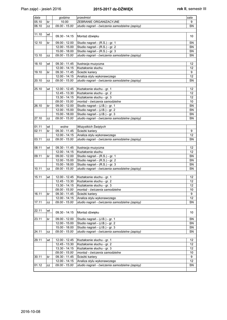 Plan zajęć - jesień 2016 2015-2017 dz