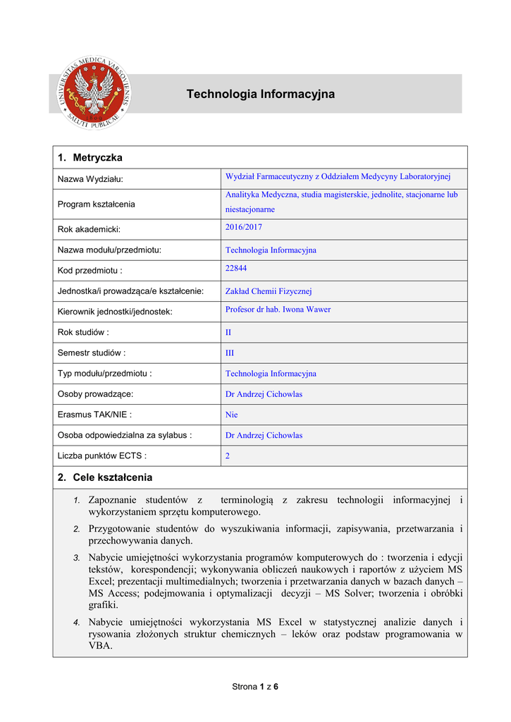 Technologia Informacyjna 1. Metryczka Nazwa Wydziału: Wydział Farmaceutyczny z Oddziałem Medycyny Laboratoryjnej Analityka Medyczna, studia magisterskie, jednolite, stacjonarne lub Program kształcenia niestacjonarne Rok akademicki: 2016/2017 Nazwa modułu/przedmiotu: Technologia Informacyjna Kod przedmiotu : 22844 Jednostka/i prowadząca/e kształcenie: Zakład Chemii Fizycznej Kierownik jednostki/jednostek: Profesor dr hab. Iwona Wawer Rok studiów : II Semestr studiów : III Typ modułu/przedmiotu : Technologia Informacyjna Osoby prowadzące: Dr Andrzej Cichowlas Erasmus TAK/NIE : Nie Osoba odpowiedzialna za sylabus : Dr Andrzej Cichowlas Liczba punktów ECTS : 2 2. Cele kształcenia 1. Zapoznanie studentów z terminologią z zakresu technologii informacyjnej i wykorzystaniem sprzętu komputerowego. 2. Przygotowanie studentów do wyszukiwania informacji, zapisywania, przetwarzania i przechowywania danych. 3. Nabycie umiejętności wykorzystania programów komputerowych do : tworzenia i edycji tekstów, korespondencji; wykonywania obliczeń naukowych i raportów z użyciem MS Excel; prezentacji multimedialnych; tworzenia i przetwarzania danych w bazach danych – MS Access; podejmowania i optymalizacji decyzji – MS Solver; tworzenia i obróbki grafiki. 4. Nabycie umiejętności wykorzystania MS Excel w statystycznej analizie danych i rysowania złożonych struktur chemicznych – leków oraz podstaw programowania w VBA. Strona 1 z 6 3. Wymagania wstępne 1. Student powinien posiadać podstawową umiejętność posługiwania się komputerem. 2. Student powinien posiadać podstawową wiedzę z zakresu znajomości środowiska Windows oraz narzędzi biurowych. 3. Student zna matematyczne podstawy statystyki. 4. Przedmiotowe efekty kształcenia Lista efektów kształcenia Symbol przedmiotowego efektu kształcenia W1 W2 W3 U1 U2 U3 K1 Treść przedmiotowego efektu kształcenia zna elementy rachunku prawdopodobieństwa i statystyki matematycznej (zdarzenia i prawdopodobieństwo, zmienne losowe, dystrybuanta zmiennej losowej, wartość przeciętna i wariancja), podstawowych rozkładów zmiennych losowych, estymacji punktowej i przedziałowej parametrów; wykorzystanie programów komputerowych - MS Excel do przeprowadzenia obliczeń i wizualizacji zna podstawy technik informatycznych oraz zasady pracy z edytorami tekstu, arkuszami kalkulacyjnymi i programami graficznymi; tworzy bazy danych oraz korzysta z internetowych baz danych. obsługuje komputer w zakresie edycji tekstu, grafiki, analizy statystycznej, gromadzenia i wyszukiwania danych oraz przygotowania prezentacji wykorzystuje narzędzia informatyczne do opracowywania i przedstawiania wyników doświadczeń wykorzystuje technologie informacyjne do wyszukiwania potrzebnych informacji oraz do samodzielnego i twórczego rozwiązywania problemów. posiada nawyk korzystania z technologii informacyjnych do wyszukiwania i selekcjonowania informacji. Odniesienie do efektu kierunkowego (numer) B.W24 B.W26 B.W27 B.U15 B.U16 M2_U06 B.K1 5. Formy prowadzonych zajęć Forma Liczba godzin Liczba grup Wykład - - Strona 2 z 6 Minimalna liczba osób w grupie Seminarium - - Ćwiczenia 30 3 6. Tematy zajęć i treści kształcenia C1-C2 Edytor tekstu Microsoft Word a. kopiowanie/przenoszenie tekstu b. paski narzędzi - wstawienie/usuwanie określonej ikony do paska narzędzi c. operacje zapisywania pliku, drukowania d. formatowanie czcionki, indeksy górny/dolny, symbole e. listy numerowane, punktowe f. formatowanie tekstu – ustawienia stylu, marginesów, orientacji strony, akapity g. tabulatory, tworzenie kolumn, style h. tabele – wstawianie, scalanie komórek, style tabeli i. podział dokumentu na sekcje, nagłówki i stopki j. tworzenie przypisów, spisu treści, indeksy k. edytor równań Microsoft l. rysowanie i wstawianie grafiki m. tworzenie bibliografii - EndNote; bazy literaturowe C3 Program BIOVIA Draw a. rysowanie struktur chemicznych b. korzystanie z szablonów c. struktury DNA i białek d. określenie właściwości związków i nazwy chemicznej e. łączenie z dokumentami tekstowymi C3 Program PowerPoint/Prezi a. tworzenie prezentacji, master slajd b. wstawianie tekstu, wykresów i grafiki do slajdów c. ustawienie slajdów do pokazu d. tworzenie animacji i przejść między slajdami e. sposoby poprawnego wystąpienia i przygotowania prezentacji C4-C8 Arkusz kalkulacyjny Microsoft Excel a. pojęcia i opis środowiska arkusza kalkulacyjnego b. wprowadzanie danych liczbowych i tekstu, formatowanie c. wstawianie funkcji – matematycznych, statystycznych, logicznych, daty i czasu d. adresowanie względne, bezwzględne i mieszane w formułach Strona 3 z 6 e. stosowanie sortowania i filtrowania danych, listy, konspekty f. rozwiązywanie problemów decyzyjnych i optymalizacji przy użyciu modułu Solver g. statystyka opisowa - Analysis Tool Pack, histogramy i funkcje tablicowe h. zagadnienia statystyczne – krzywa Gaussa , generowanie wartości prawdopodobieństwa i. tworzenie i formatowanie wykresów j. tworzenie makr k. Tabele Przestawne w Excelu (i) analiza danych (ii) (iii) (iv) (v) (vi) przygotowanie danych arkusza i tworzenie listy korzystanie z kreatora Tabel Przestawnych dodawanie pól filtrowanie przy użyciu pola strony wykresy przestawne C9-C10 Bazy danych Microsoft Access a. tworzenie bazy danych – podstawy teoretyczne i terminologia b. rodzaje danych i atrybuty pól c. klucz główny, klucz obcy d. filtrowanie danych e. tworzenie tabel f. tabele nadrzędne, podrzędne i przeglądowe g. formularze – kreator, formanty, autoformularze h. sprawdzanie poprawności danych i. kwerendy wybierające, parametryczne podsumowujące aktualizujące j. raporty k. tworzenie relacji między tabelami 7. Sposoby weryfikacji efektów kształcenia Symbol przedmiotowego efektu kształcenia Symbole form prowadzonych zajęć W1-W3 C Kolokwium- zadania z wykorzystaniem programów : Excel, Word, Access, Biovia Draw; wykonanie prezentacji Zalicza 