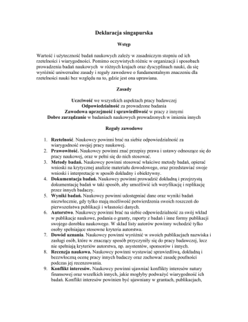 Deklaracja singapurska Wstęp Wartość i użyteczność badań naukowych zależy w zasadniczym stopniu od ich rzetelności i wiarygodności. Pomimo oczywistych różnic w organizacji i sposobach prowadzenia badań naukowych w różnych krajach oraz dyscyplinach nauki, da się wyróżnić uniwersalne zasady i reguły zawodowe o fundamentalnym znaczeniu dla rzetelności nauki bez względu na to, gdzie jest ona uprawiana. Zasady Uczciwość we wszystkich aspektach pracy badawczej Odpowiedzialność za prowadzone badania Zawodowa uprzejmość i sprawiedliwość w pracy z innymi Dobre zarządzanie w badaniach naukowych prowadzonych w imieniu innych Reguły zawodowe 1. Rzetelność. Naukowcy powinni brać na siebie odpowiedzialność za wiarygodność swojej pracy naukowej. 2. Prawowitość. Naukowcy powinni znać przepisy prawa i ustawy odnoszące się do pracy naukowej, oraz w pełni się do nich stosować. 3. Metody badań. Naukowcy powinni stosować właściwe metody badań, opierać wnioski na krytycznej analizie materiału dowodowego, oraz przedstawiać swoje wnioski i interpretacje w sposób dokładny i obiektywny. 4. Dokumentacja badań. Naukowcy powinni prowadzić dokładną i przejrzystą dokumentację badań w taki sposób, aby umożliwić ich weryfikację i replikację przez innych badaczy. 5. Wyniki badań. Naukowcy powinni udostępniać dane oraz wyniki badań niezwłocznie, gdy tylko mają możliwość potwierdzenia swoich roszczeń do pierwszeństwa publikacji i własności danych. 6. Autorstwo. Naukowcy powinni brać na siebie odpowiedzialność za swój wkład w publikacje naukowe, podania o granty, raporty z badań i inne formy publikacji swojego dorobku naukowego. W skład listy autorów powinny wchodzić tylko osoby spełniające stosowne kryteria autorstwa. 7. Dowód uznania. Naukowcy powinni wyróżnić w swoich publikacjach nazwiska i zasługi osób, które w znaczący sposób przyczyniły się do pracy badawczej, lecz nie spełniają kryteriów autorstwa, np. asystentów, sponsorów i innych. 8. Recenzja naukowa. Naukowcy powinni wystawiać sprawiedliwą, dokładną i bezzwłoczną ocenę pracy innych badaczy oraz zachować zasadę poufności podczas jej recenzowania. 9. Konflikt interesów. Naukowcy powinni ujawniać konflikty interesów natury finansowej oraz wszelkich innych, jakie mogłyby podważyć wiarygodność ich badań. Konflikt interesów powinien być ujawniany w grantach, publikacjach, wystąpieniach publicznych, oraz we wszelkiej działalności związanej z recenzowaniem pracy badawczej innych naukowców. 10. Kontakty Publiczne. W publicznej dyskusji o znaczeniu i zastosowaniu nowych odkryć oraz wniosków z badań, naukowcy powinni ograniczyć zakres swoich fachowych opinii i komentarzy do zakresu swojej ekspertyzy naukowej uznanej przez środowisko. Naukowcy powinni również jasno rozróżniać pomiędzy fachową oceną a osobistą opinią. 11. Zgłaszanie Nieodpowiedzialnych Praktyk Badawczych. Naukowcy powinni zgłaszać stosownym władzom wszelkie podejrzewane wykroczenia w zakresie prowadzonych badań, takie jak fabrykacja lub falsyfikacja danych czy plagiat. Powinni również zgłaszać przypadki innych nieodpowiedzialnych praktyk badawczych, które podważają wiarygodność nauki, takich jak nieostrożność, niestosowne przypisywanie autorstwa, zaniechanie relacji o sprzecznych danych, lub stosowanie zwodniczych metod badawczych. 12. Reakcja na Nieodpowiedzialne Praktyki Badawcze. Instytucje badawcze, jak również czasopisma naukowe, stowarzyszenia naukowe i instytucje wspierające działalność badawczą powinny zatwierdzić procedury reagowania na zarzuty o wykroczenia i nieodpowiedzialne praktyki badawcze oraz ochrony osób zgłaszających takie przypadki w dobrej wierze. Jeśli wykroczenie lub nieodpowiedzialna praktyka badawcza zostaną wykazane, stosowna reakcja powinna nastąpić niezwłocznie i rejestr badań powinien być skorygowany. 13. Środowiska Badawcze. Instytucje badawcze powinny tworzyć i promować środowiska badawcze sprzyjające rzetelności i wiarygodności badań naukowych poprzez szkolenie, tworzenie przejrzystych przepisów i stosowanie rozsądnych standardów awansu. Powinny również tworzyć środowisko pracy wspierające rzetelność badań naukowych. 14. Odpowiedzialność Społeczna. Instytucje badawcze i naukowcy powinni mieć stałą świadomość etycznej odpowiedzialności za rozsądzanie pomiędzy dobrem społecznym wynikającym z ich pracy a związanym z nią ryzykiem.