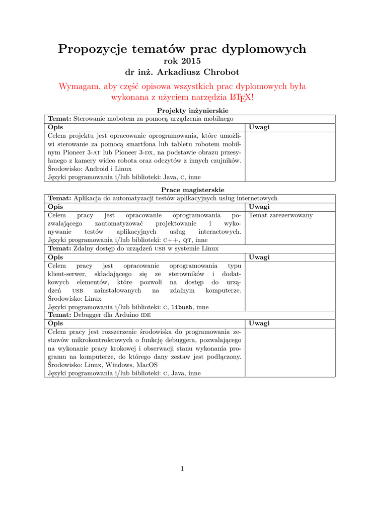 Propozycje tematów prac dyplomowych rok 2015 dr inż. Arkadiusz Chrobot Wymagam, aby część opisowa wszystkich prac dyplomowych była wykonana z użyciem narzędzia LATEX! Projekty inżynierskie Temat: Sterowanie mobotem za pomocą urządzenia mobilnego Opis Celem projektu jest opracowanie oprogramowania, które umożliwi sterowanie za pomocą smartfona lub tabletu robotem mobilnym Pioneer 3-at lub Pioneer 3-dx, na podstawie obrazu przesyłanego z kamery wideo robota oraz odczytów z innych czujników. Środowisko: Android i Linux Języki programowania i/lub biblioteki: Java, c, inne Uwagi Prace magisterskie Temat: Aplikacja do automatyzacji testów aplikacyjnych usług internetowych Opis Uwagi Celem pracy jest opracowanie oprogramowania po- Temat zarezerwowany zwalającego zautomatyzować projektowanie i wykonywanie testów aplikacyjnych usług internetowych. Języki programowania i/lub biblioteki: c++, qt, inne Temat: Zdalny dostęp do urządzeń usb w systemie Linux Opis Uwagi Celem pracy jest opracowanie oprogramowania typu klient-serwer, składającego się ze sterowników i dodatkowych elementów, które pozwoli na dostęp do urządzeń usb zainstalowanych na zdalnym komputerze. Środowisko: Linux Języki programowania i/lub biblioteki: c, libusb, inne Temat: Debugger dla Arduino ide Opis Uwagi Celem pracy jest rozszerzenie środowiska do programowania zestawów mikrokontrolerowych o funkcję debuggera, pozwalającego na wykonanie pracy krokowej i obserwacji stanu wykonania programu na komputerze, do którego dany zestaw jest podłączony. Środowisko: Linux, Windows, MacOS Języki programowania i/lub biblioteki: c, Java, inne 1
