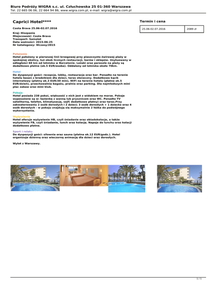 Biuro Podróży WIGRA s.c. ul. Człuchowska 25 01-360 Warszawa Tel. 22 665 06 06, 22 664 94 86, www.wigra.com.pl, e-mail: [email protected] Caprici Hotel**** Costa Brava 25.06-02.07.2016 Termin i cena 25.06-02.07.2016 2089 zł Kraj: Hiszpania Miejscowość: Costa Brava Transport: Samolot Data ważności: 2015-06-25 Nr katalogowy: Wczasy/2015 Położenie Hotel położony w pierwszej linii brzegowej przy piaszczysto żwirowej plaży w spokojnej okolicy, tuż obok licznych restauracji, barów i sklepów. Usytuowany w odległości 60 km od lotniska w Barcelonie. Leżaki oraz parasole na plaży są dodatkowo płatne (ok.5 EUR/osoba). Oddalony od lotniska około 70km. Hotel Do dyspozycji gości: recepcja, lobby, restauracja oraz bar. Ponadto na terenie hotelu basen z brodzikiem dla dzieci, taras słoneczny. Dodatkowo kącik internetowy (płatny ok.3 EUR/30 min), WiFi na terenie hotelu (płatne ok.5 EUR/dzień), przechowalnia bagażu, pralnia oraz parking. Dla najmłodszych mini plac zabaw oraz mini klub. Pokoje Hotel posiada 238 pokoi, większość z nich jest z widokiem na morze. Pokoje wyposażone są w: łazienkę z wanną lub prysznicem oraz WC. Ponadto TV satelitarną, telefon, klimatyzację, sejf( dodatkowo płatny) oraz taras.Przy zakwaterowaniu 2 osób dorosłych i 2 dzieci; 3 osób dorosłych + 1 dziecko oraz 4 osób dorosłych - w pokoju znajdują się maksymalnie 2 łóżka do podwójnego wykorzystania. Wyżywienie Hotel oferuje wyżywienie HB, czyli śniadanie oraz obiadokolacje, a także wyżywienie FB, czyli śniadanie, lunch oraz kolację. Napoje do lunchu oraz kolacji dodatkowo płatne. Sport i relaks Do dyspozycji gości: siłownia oraz sauna (płatna ok.12 EUR/godz.). Hotel organizuje dzienną oraz wieczorną animację dla dzieci oraz dorosłych. Wylot z Warszawy. 1/1 Powered by TCPDF (www.tcpdf.org)