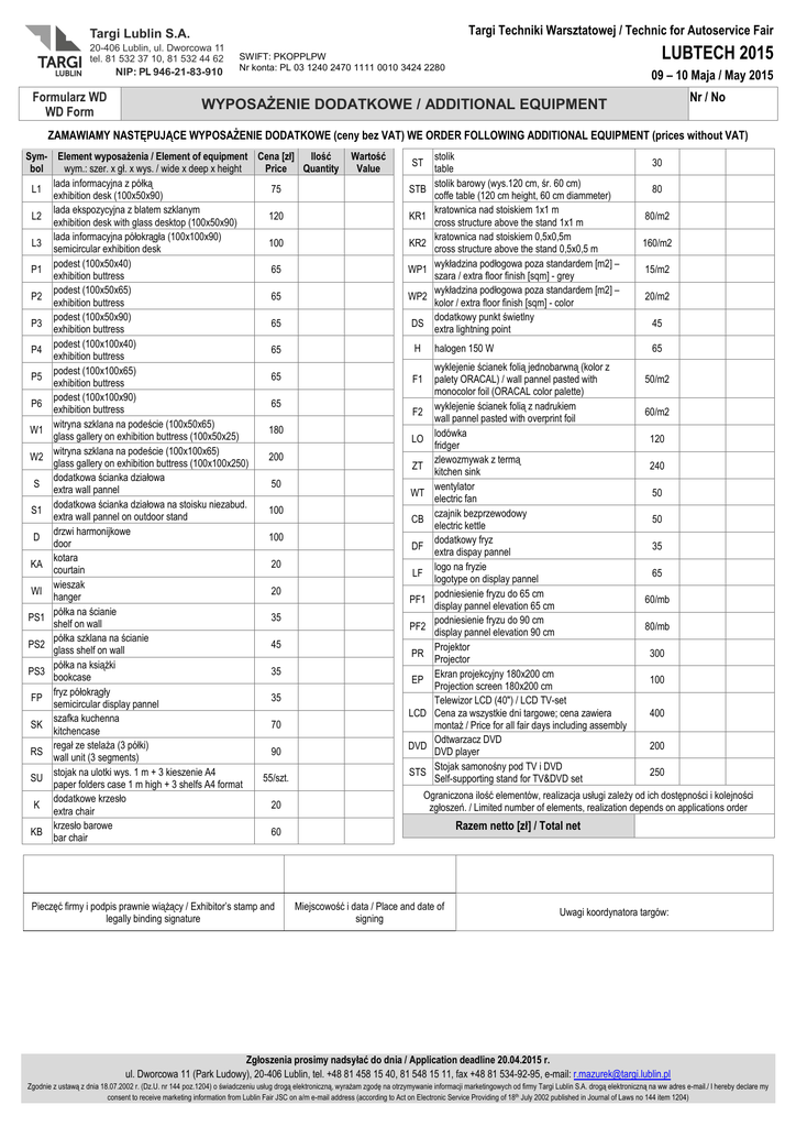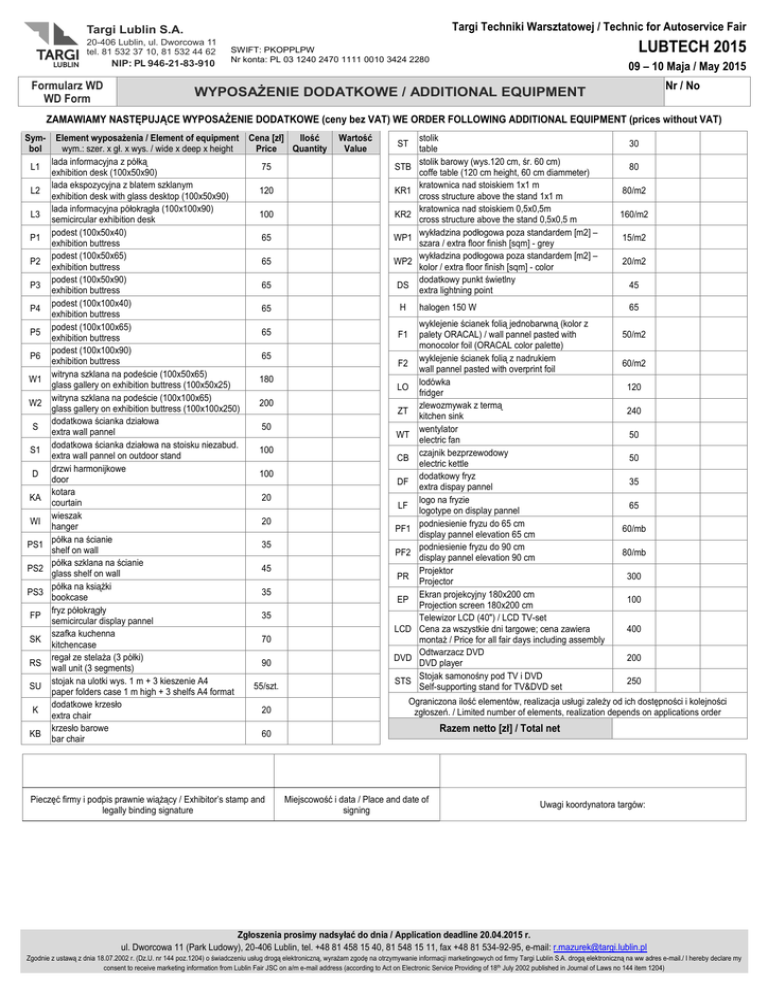 Targi Techniki Warsztatowej / Technic for Autoservice Fair LUBTECH 2015 SWIFT: PKOPPLPW Nr konta: PL 03 1240 2470 1111 0010 3424 2280 Formularz WD WD Form 09 – 10 Maja / May 2015 Nr / No WYPOSAŻENIE DODATKOWE / ADDITIONAL EQUIPMENT ZAMAWIAMY NASTĘPUJĄCE WYPOSAŻENIE DODATKOWE (ceny bez VAT) WE ORDER FOLLOWING ADDITIONAL EQUIPMENT (prices without VAT) Sym- Element wyposażenia / Element of equipment Cena [zł] Ilość bol wym.: szer. x gł. x wys. / wide x deep x height Price Quantity lada informacyjna z półką L1 75 exhibition desk (100x50x90) lada ekspozycyjna z blatem szklanym L2 120 exhibition desk with glass desktop (100x50x90) lada informacyjna półokrągła (100x100x90) L3 100 semicircular exhibition desk podest (100x50x40) P1 65 exhibition buttress podest (100x50x65) P2 65 exhibition buttress podest (100x50x90) P3 65 exhibition buttress podest (100x100x40) P4 65 exhibition buttress podest (100x100x65) P5 65 exhibition buttress podest (100x100x90) P6 65 exhibition buttress witryna szklana na podeście (100x50x65) W1 180 glass gallery on exhibition buttress (100x50x25) witryna szklana na podeście (100x100x65) W2 200 glass gallery on exhibition buttress (100x100x250) dodatkowa ścianka działowa S 50 extra wall pannel dodatkowa ścianka działowa na stoisku niezabud. S1 100 extra wall pannel on outdoor stand drzwi harmonijkowe D 100 door kotara KA 20 courtain wieszak WI 20 hanger półka na ścianie PS1 35 shelf on wall półka szklana na ścianie PS2 45 glass shelf on wall półka na książki PS3 35 bookcase fryz półokrągły FP 35 semicircular display pannel szafka kuchenna SK 70 kitchencase regał ze stelaża (3 półki) RS 90 wall unit (3 segments) stojak na ulotki wys. 1 m + 3 kieszenie A4 55/szt. SU paper folders case 1 m high + 3 shelfs A4 format dodatkowe krzesło K 20 extra chair krzesło barowe KB 60 bar chair Pieczęć firmy i podpis prawnie wiążący / Exhibitor’s stamp and legally binding signature Wartość Value ST STB KR1 KR2 WP1 WP2 DS H stolik table stolik barowy (wys.120 cm, śr. 60 cm) coffe table (120 cm height, 60 cm diammeter) kratownica nad stoiskiem 1x1 m cross structure above the stand 1x1 m kratownica nad stoiskiem 0,5x0,5m cross structure above the stand 0,5x0,5 m wykładzina podłogowa poza standardem [m2] – szara / extra floor finish [sqm] - grey wykładzina podłogowa poza standardem [m2] – kolor / extra floor finish [sqm] - color dodatkowy punkt świetlny extra lightning point halogen 150 W F1 F2 LO ZT WT CB DF LF PF1 PF2 PR EP LCD DVD STS 30 80 80/m2 160/m2 15/m2 20/m2 45 65 wyklejenie ścianek folią jednobarwną (kolor z palety ORACAL) / wall pannel pasted with monocolor foil (ORACAL color palette) wyklejenie ścianek folią z nadrukiem wall pannel pasted with overprint foil lodówka fridger zlewozmywak z termą kitchen sink wentylator electric fan czajnik bezprzewodowy electric kettle dodatkowy fryz extra dispay pannel logo na fryzie logotype on display pannel podniesienie fryzu do 65 cm display pannel elevation 65 cm podniesienie fryzu do 90 cm display pannel elevation 90 cm Projektor Projector Ekran projekcyjny 180x200 cm Projection screen 180x200 cm Telewizor LCD (40") / LCD TV-set Cena za wszystkie dni targowe; cena zawiera montaż / Price for all fair days including assembly Odtwarzacz DVD DVD player Stojak samonośny pod TV i DVD Self-supporting stand for TV&DVD set 50/m2 60/m2 120 240 50 50 35 65 60/mb 80/mb 300 100 400 200 250 Ograniczona ilość elementów, realizacja usługi zależy od ich dostępności i kolejności zgłoszeń. / Limited number of elements, realization depends on applications order Miejscowość i data / Place and date of signing Razem netto [zł] / Total net Uwagi koordynatora targów: Zgłoszenia prosimy nadsyłać do dnia / Application deadline 20.04.2015 r. ul. Dworcowa 11 (Park Ludowy), 20-406 Lublin, tel. +48 81 458 15 40, 81 548 15 11, fax +48 81 534-92-95, e-mail: [email protected] Zgodnie z ustawą z dnia 18.07.2002 r. (Dz.U. nr 144 poz.1204) o świadczeniu usług drogą elektroniczną, wyrażam zgodę na otrzymywanie informacji marketingowych od firmy Targi Lublin S.A. drogą elektroniczną na ww adres e-mail./ I hereby declare my consent to receive marketing information from Lublin Fair JSC on a/m e-mail address (according to Act on Electronic Service Providing of 18th July 2002 published in Journal of Laws no 144 item 1204)