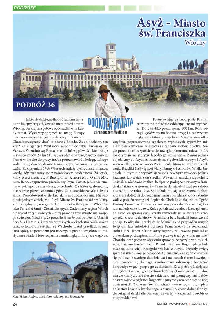 32'5Ïĩ( Asyż - Miasto św. Franciszka Włochy PODRÓŻ 36 Jak to się dzieje, że ilekroć szukam tematu na kolejny artykuł, zawsze mam przed oczami Włochy. Tej kraj ma gotowe opowiadanie na każdy temat. Wystarczy spojrzeć na mapę Europy i wzrok skierować ku jej południowym krańcom. Charakterystyczny „but” to nasze eldorado. Za co kochamy ten kraj? Za elegancję? Wystarczy wspomnieć takie nazwiska jak Versace, Valentino czy Prada i nie ma już wątpliwości, kto króluje w świecie mody. Za luz? Tutaj czas płynie bardzo, bardzo leniwie. Nawet w drodze do pracy trzeba porozmawiać z kolegą, którego widziało się dawno, dawno temu – czytaj wczoraj – a praca poczeka. Za optymizm? We Włoszech należy być radosnym, nawet wtedy, gdy zmagamy się z największym problemem. Za język, który pieści nasze uszy? Buongiorno, A more Mio, O sole Mio, tutto Bene, cappuccino, piccolo czy Papa. Nawet, jeżeli nie znamy włoskiego od razu wiemy, o co chodzi. Za historię, słoneczne, piaszczyste plaże i wspaniałe góry. Za niezwykłe zabytki i dzieła sztuki. Powodów jest wiele, tak jak miejsc do zobaczenia. Niewątpliwie jednym z nich jest - Asyż. Miasto św. Franciszka i św. Klary, które znajduje się w regionie Umbrii – określanej przez Włochów jako Terra dei Santi - Ziemia Świętych. Żaden inny region Włoch nie wydał aż tylu świętych – tutaj prawie każde miasto ma swojego świętego. Mówi się, że powodem może być położenie Umbrii przy Via Flaminia, która we wczesnych wiekach stanowiła ważny trakt ucieczki chrześcijan ze Wschodu przed prześladowcami. Inni sądzą, że powodem jest niezwykłe piękno krajobrazu i mistyczne światło, które rozjaśnia osnute mgłą umbryjskie wzgórza. Kosciół San Rufino, obok dom rodzinny św. Franciszka 24 Pozostawiając za sobą plaże Rimini, ruszamy na południe oddalając się od wybrzeża. Dość szybko pokonujemy 200 km. Koło Perugii zjeżdżamy na boczną drogę i z zachwytem oglądamy tutejszy krajobraz. Mijamy niewielkie wzgórza, poprzeszywane szpalerem wyniosłych cyprysów, miniaturowe kamienne miasteczka i zadbane zielone poletka. Nagle przed nami rozpościera się rozległa panorama miasta, które rozłożyło się na szczycie łagodnego wzniesienia. Zanim jednak dojedziemy do Asyżu zatrzymujemy się dwa kilometry od Asyżu w niewielkiej miejscowości Porziuncola, którą zdominowała sylwetka Bazyliki Najświętszej Maryi Panny od Aniołów. Wielka budowla, niczym nie wyróżniająca się z zewnątrz zaskoczy jednak każdego, kto wejdzie do środka. Wewnątrz znajduje się kolejny kościół, a właściwie kaplica, będąca w praktyce pierwszym franciszkańskim klasztorem. Św. Franciszek mieszkał tutaj po założeniu zakonu w roku 1208. Spodobała mu się ta zalesiona okolica. Z czasem dołączyli do niego inni mnisi i pustelnicy, którzy zbudowali w pobliżu szereg cel i lepianek. Obok kościoła jest też Ogród Różany. Ponoć św. Franciszek kuszony przez diabła rzucił się bez szat na kolczaste krzewy. Kolce pokaleczyły ciało, a krew spłynęła na liście. Za sprawą cudu krzaki zamieniły się w kwitnące krzewy róż. Z resztą, dzieje Św. Franciszka były bardziej burzliwe niż podają to oficjalne przekazy. Podobnie jak w przypadku innych świętych, lata młodości upłynęły Franciszkowi na rozkoszach stołu i łoża. Jeden z kronikarzy napisał, że „zawsze podążał za diabelskim podszeptem i nikt nie przewyższał go w błazeństwie”. Choroba oraz pobyt w więzieniu sprawiły, że zaczęło w nim kiełkować ziarno kontemplacji. Powołanie przez Boga będące kulminacją kilku wizji, nastąpiło właśnie w Asyżu. Przyszły święty sprzedał sklep swojego ojca, oddał pieniądze, a następnie wyrzekł się publicznie swojego dziedzictwa i na oczach tłumu i swojego ojca rozebrał się do naga, symbolicznie odrzucając bogactwo i zrywając więzy łączące go ze światem. Zaczął żebrać, dołączył do trędowatych, a jego przesłanie było wyjątkowo proste: „uzdrawiajcie chorych, nie noście sakiewek, ani pieniędzy, ani butów, dostrzegajcie w pięknie i bogactwie przyrody wszechpotężną rękę opatrzności”. Z czasem Św. Franciszek wywarł ogromny wpływ na kształt kościoła katolickiego, a wszystko, czego dokonał w życiu osiągnął dzięki sile perswazji zawartej w kazaniach i osobistemu przykładowi. KURIER POWIATOWY Ɣ3/2016 (138) 32'5Ïĩ( Jak większość turystów i my rozpoczynamy swoją podróż w czasie od Bazyliki św. Franciszka, a właściwie od dwóch kościołów – jednego na drugim. Romańsko-gotycki kościół dolny wybudowano w dwa lata. Tam, w krypcie, można oglądać trumnę św. Franciszka wystawioną na widok publiczny od chwili odkrycia jej w XIX wieku. Przez czworokątny dziedziniec otoczony krużgankami, przedostajemy się do górnego kościoła, budowanego aż dwie dekady. Jest smuklejszy, bardziej kolorowy i wyższy z pięknym niebiańskim sklepieniem. Ściany pokrywa bajeczna galeria fresków największych XIII-wiecznych mistrzów włoskich szkół. Historycy napisali o nich tomy rozpraw, prezentowane są w każdym przewodniku po Włoszech. Najsłynniejsze to cykl fresków Giotta, przedstawiający żywot św. Franciszka. Na chwile przysiadamy w drewnianej ławie i wzrokiem szukamy znanych nam obrazów. Szybko znajdujemy dwa słynne freski reprodukowane w milionach egzemplarzy: „Kazanie św. Franciszka do ptaków” oraz „Wyrzucenie złych duchów z Arezzo”. Z czasem zaczynamy poszukiwać śladów trzęsienia ziemi, jakie nawiedziło Asyż w 1997 roku. Przed oczami mam film, nagrany podczas katastrofy, kiedy na uciekających turystów spada sklepienie świątyni. Pod upadającymi elementami średniowiecznych konstrukcji zginęły wówczas cztery osoby, wśród nich dwóch braci franciszkanów. Kilka fresków bezpowrotnie zostało zniszczonych, Większość jednak odtworzono z kawałków, na które się rozs